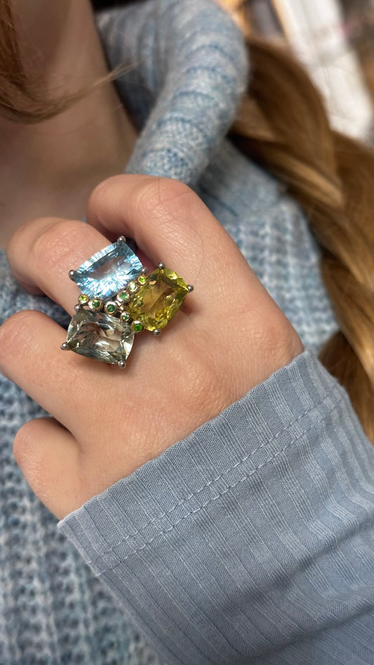 Silver Ring with Blue Topaz, Prasiolite, Lemon Citrine and Green Garnets