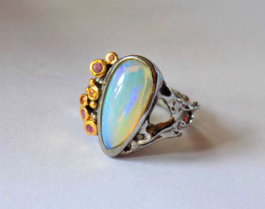 Silver ring with Ethiopian Opal and Orange and Pink Sapphires