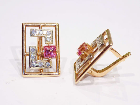 14K baltā un sarkanā zelta auskari ar rozā topāzēm un baltiem cirkoniem