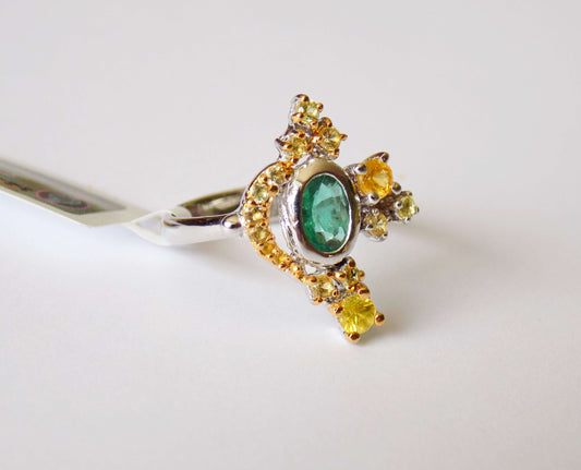 Sudraba gredzens ar smaragdu un dzelteniem safīriem