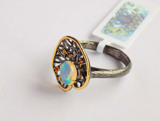 Sudraba gredzens ar Etiopijas opālu un oranžiem safīriem