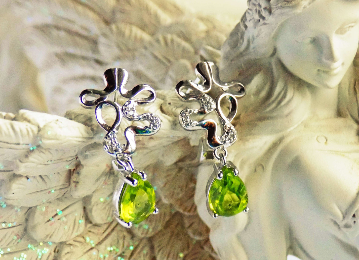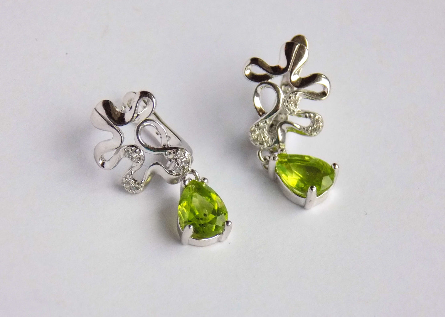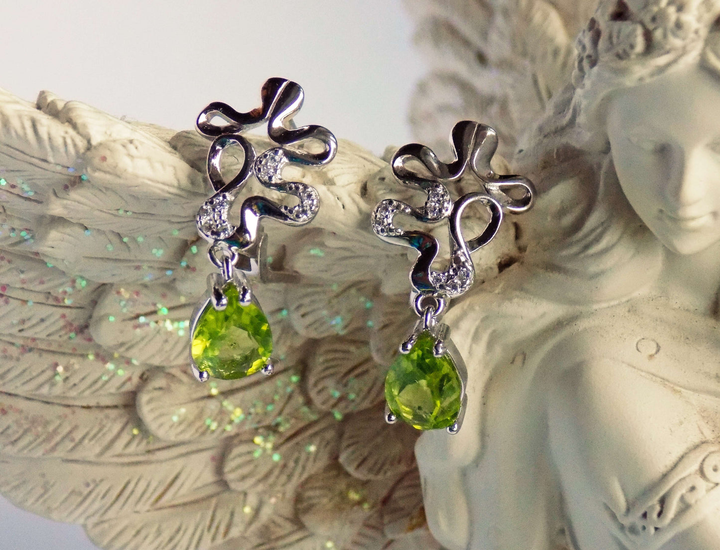 Dabīgie dārgakmeņi: Peridots 2 gab. (0,65 cm x 0,85 cm) un cirkoni 14 gab.