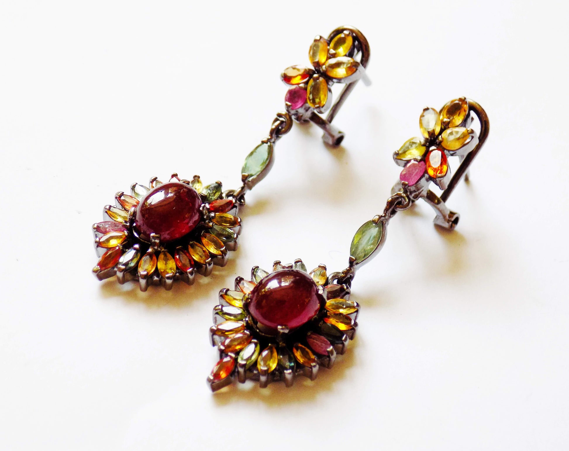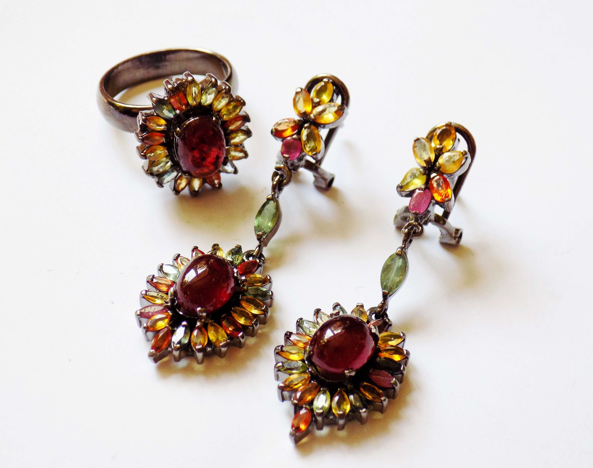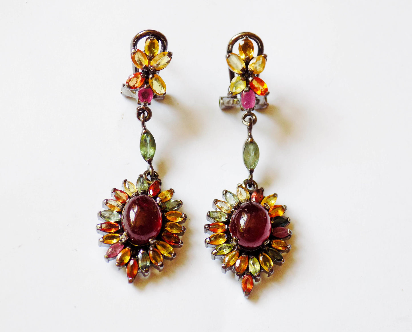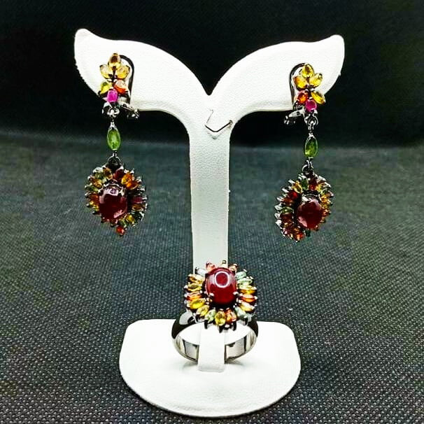 Sudraba auskari ar rubīniem un daudzkrāsainiem safīriem
