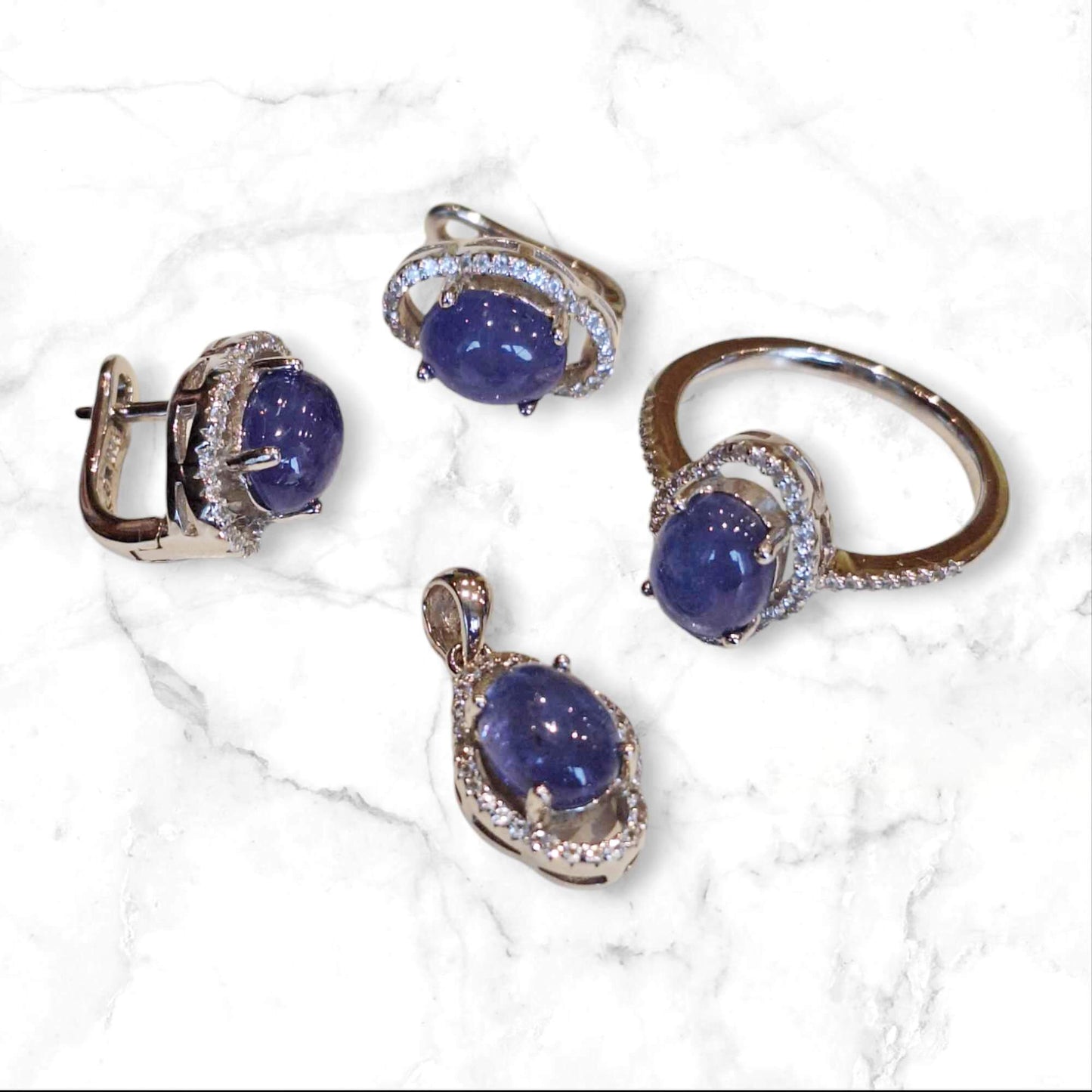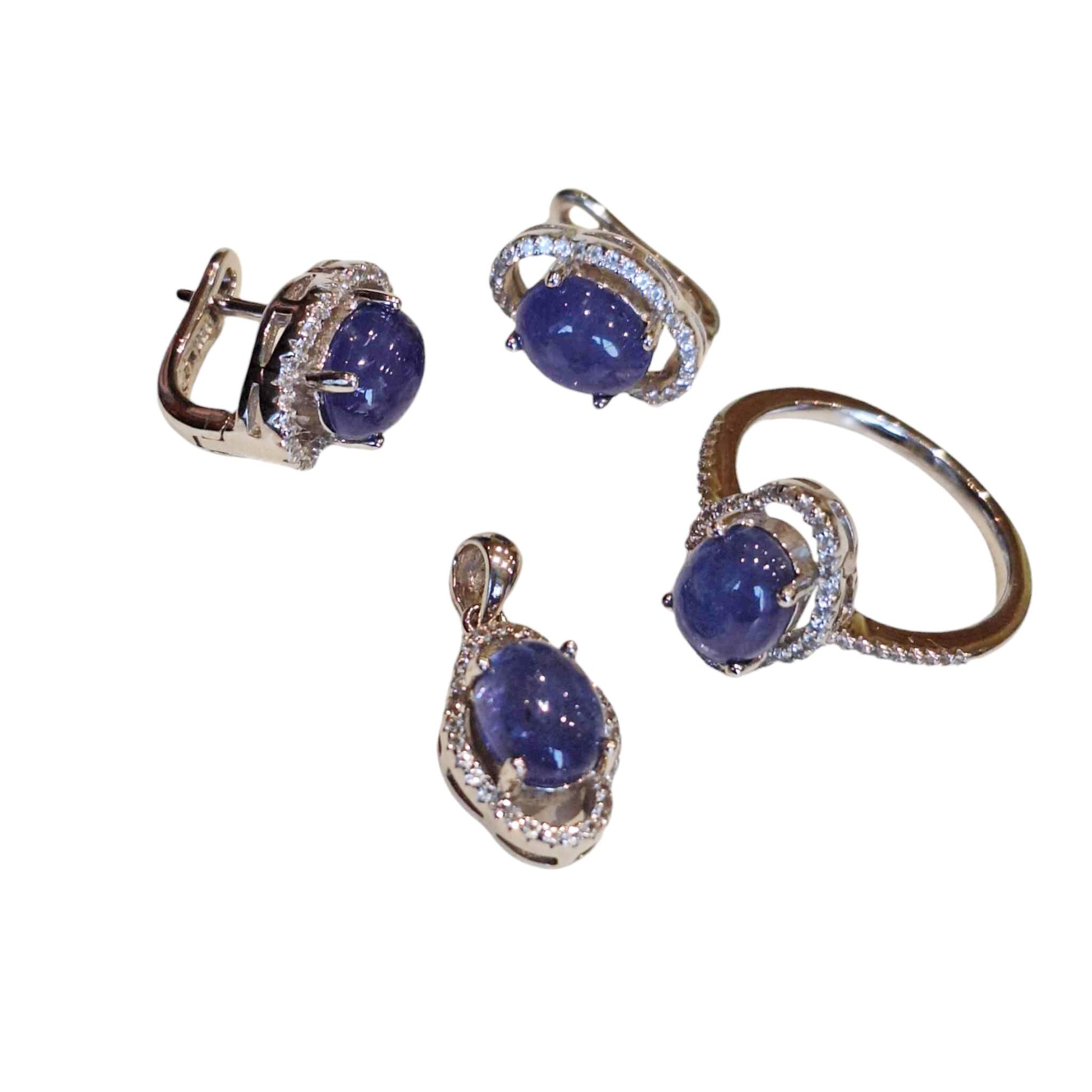 Dabīgie dārgakmeņi: Tanzanīts 1 gab. (0,7 cm x 0,9 cm) un cirkoni 36 gab (0,1 cm x 0,1 cm).