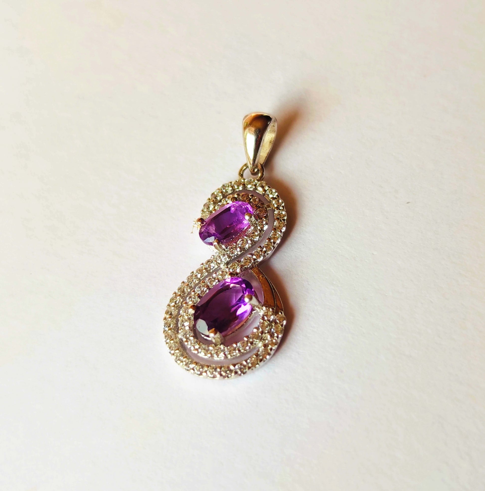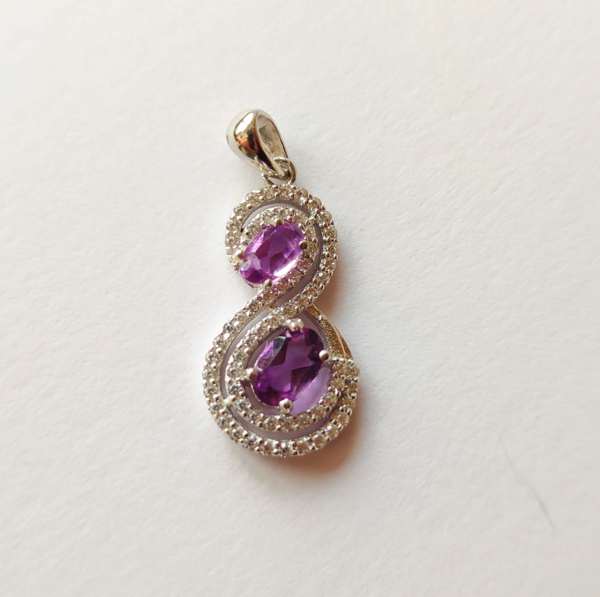 Dabīgie dārgakmeņi: Ametists 1 gab. (0,4 cm x 0,6 cm), Ametists 1 gab. (0,32 cm x 0,52 cm) un cirkoni 64 gab.