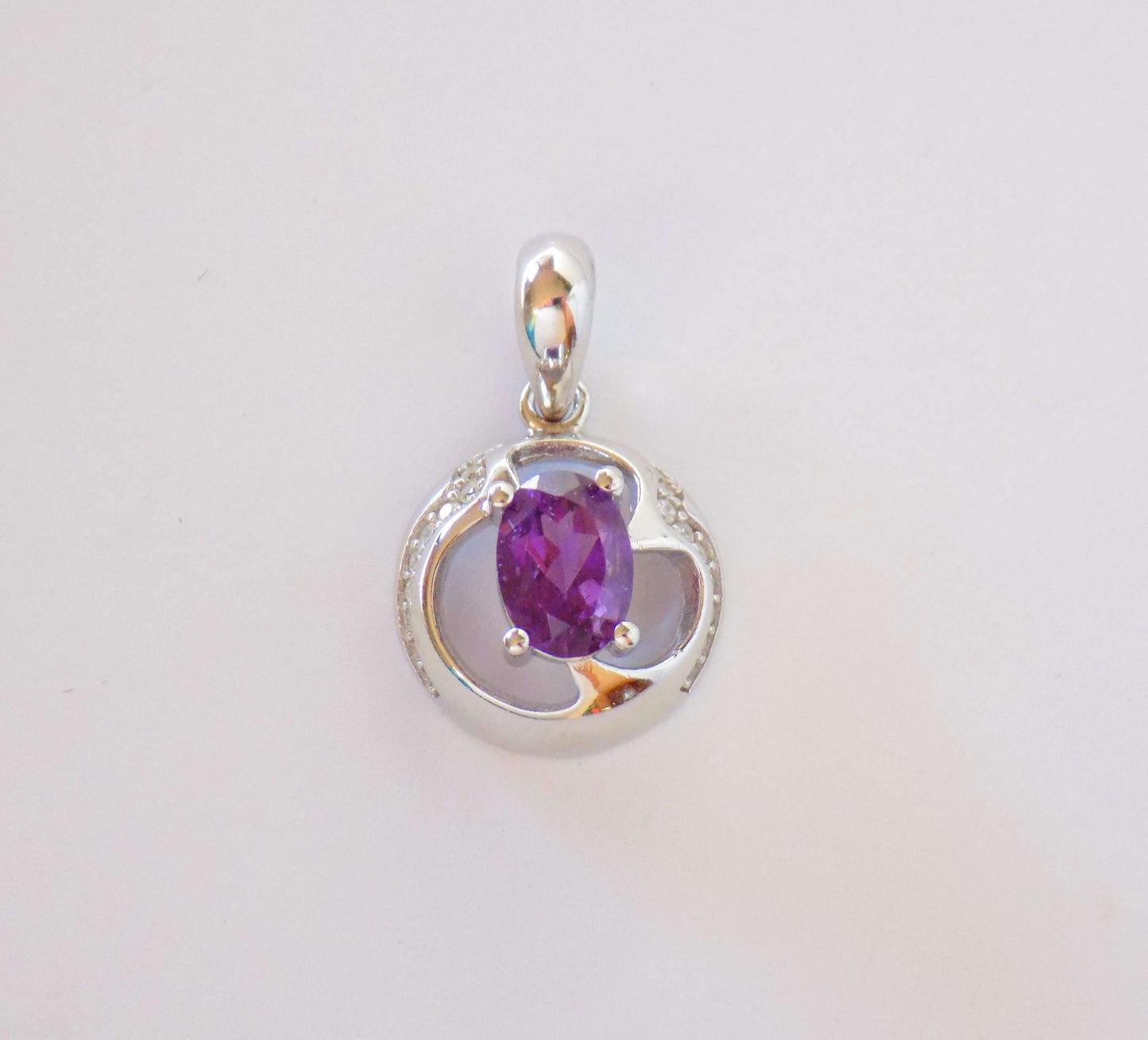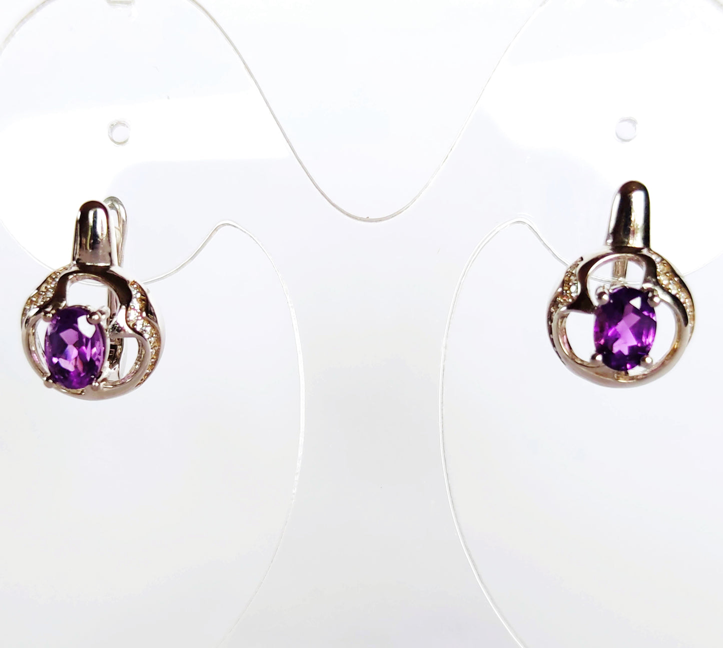 Dabīgie dārgakmeņi: Ametists 1 gab. (0,5 cm x 0,7 cm) un cirkoni 19 gab. (0,1 cm x 0,1 cm).