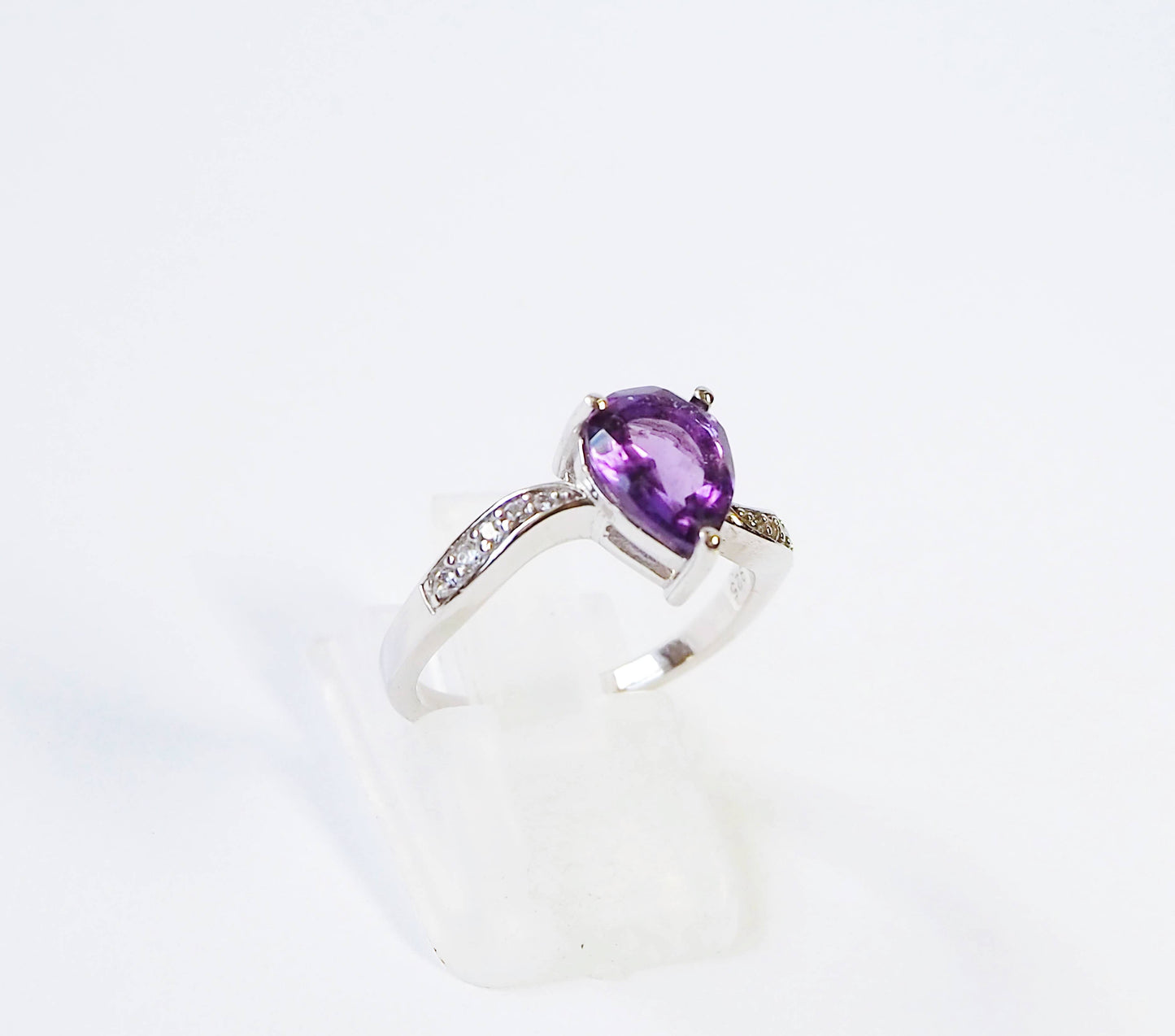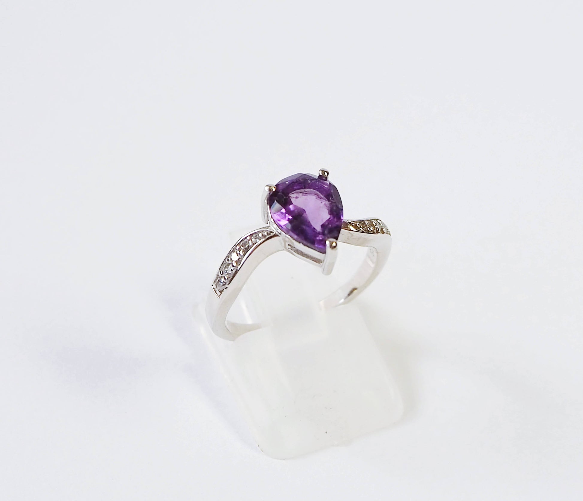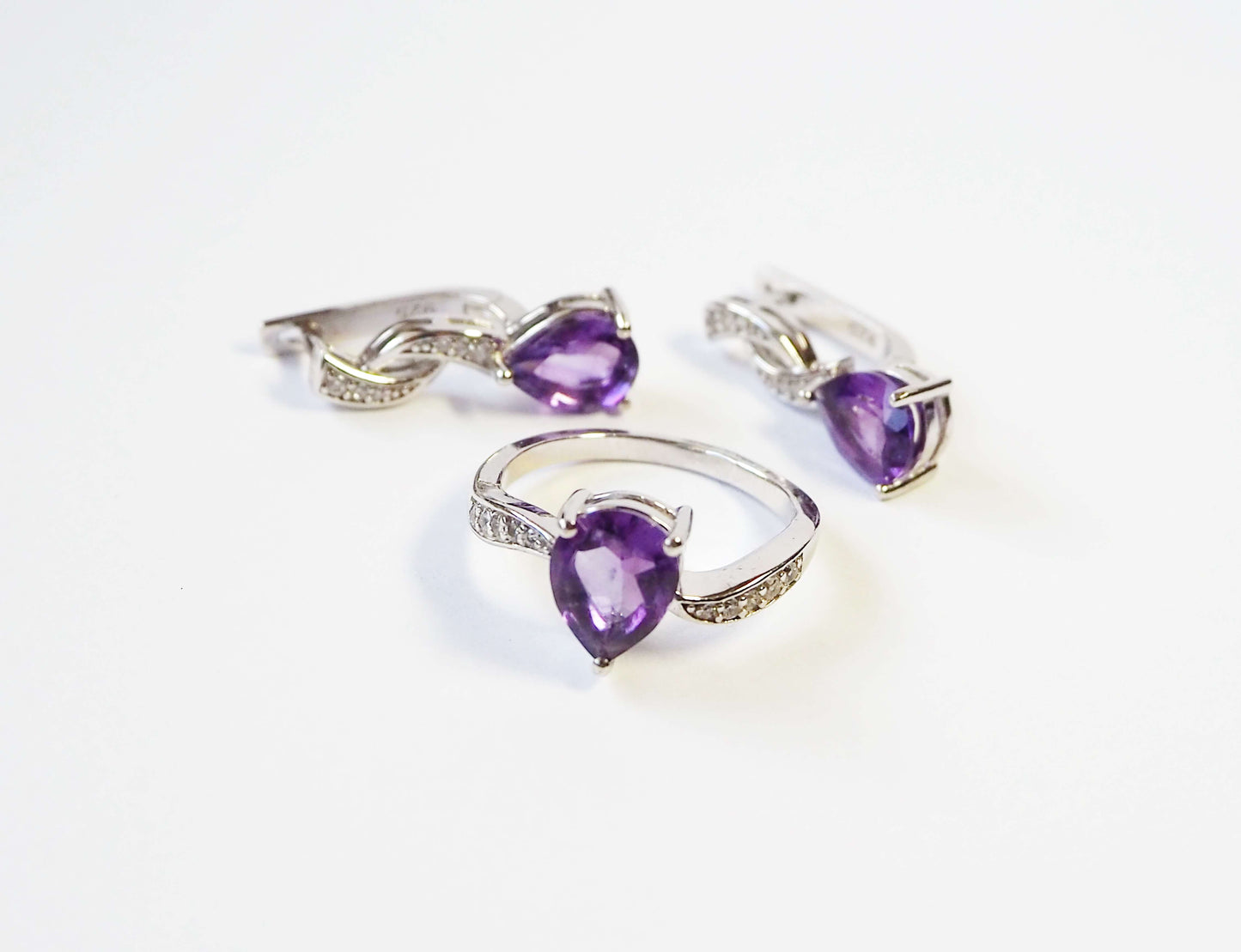 Dabīgie dārgakmeņi: Ametists 1 gab. (0,7 cm x 0,9 cm) un cirkoni 10 gab. (0,1 cm x 0,1 cm - 0,15 cm x 0,15 cm).