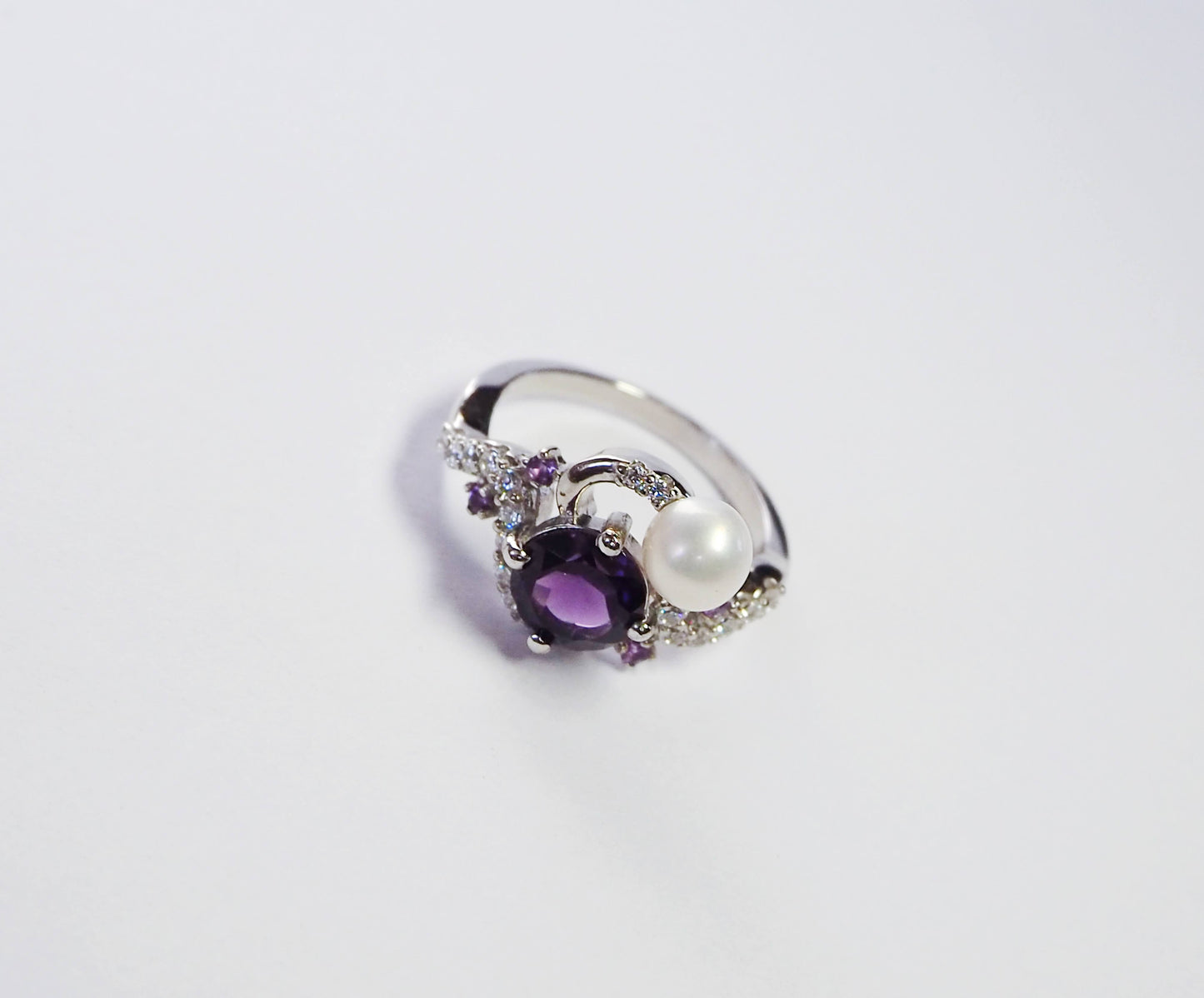 Sudraba gredzens ar ametistiem, pērlēm un cirkoniem