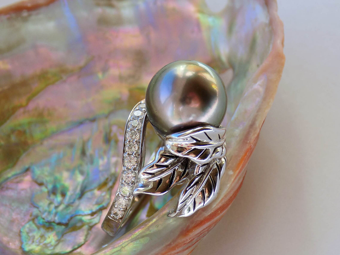 Dabīgie dārgakmeņi: Melnā Austrālijas jūras pērle 1 gab. (1,25 cm diametrā) un Cirkoni 18 gab. (0,15 cm x 0,15 cm - 0,2 cm x 0,2 cm).