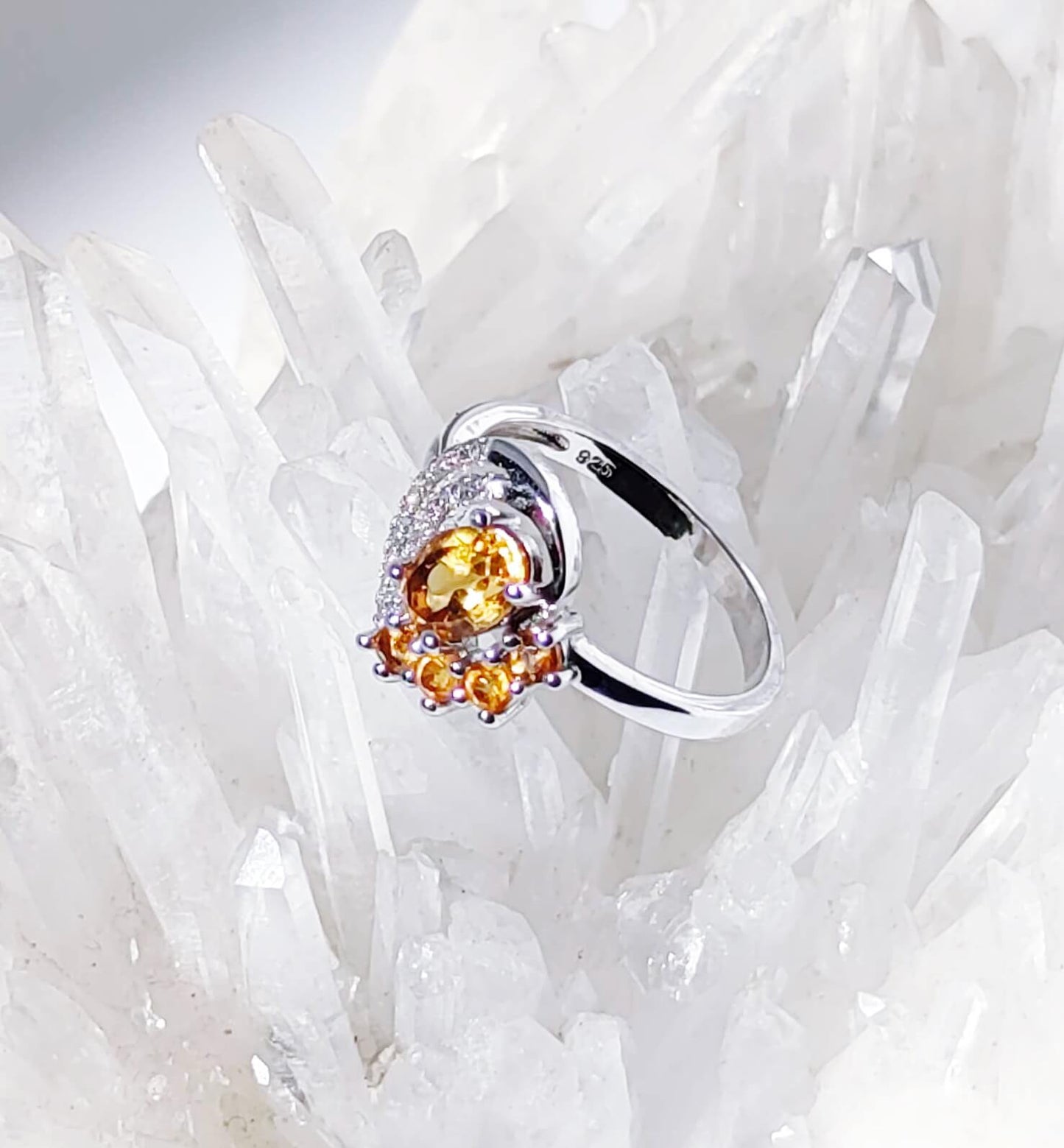 Dabīgie dārgakmeņi: Citrīni 1 gab. (0,5 cm x 0,7 cm), 4 gab. (0,25 cm x 0,25 cm) un cirkoni 18 gab. (0,1 cm x 0,1 cm).