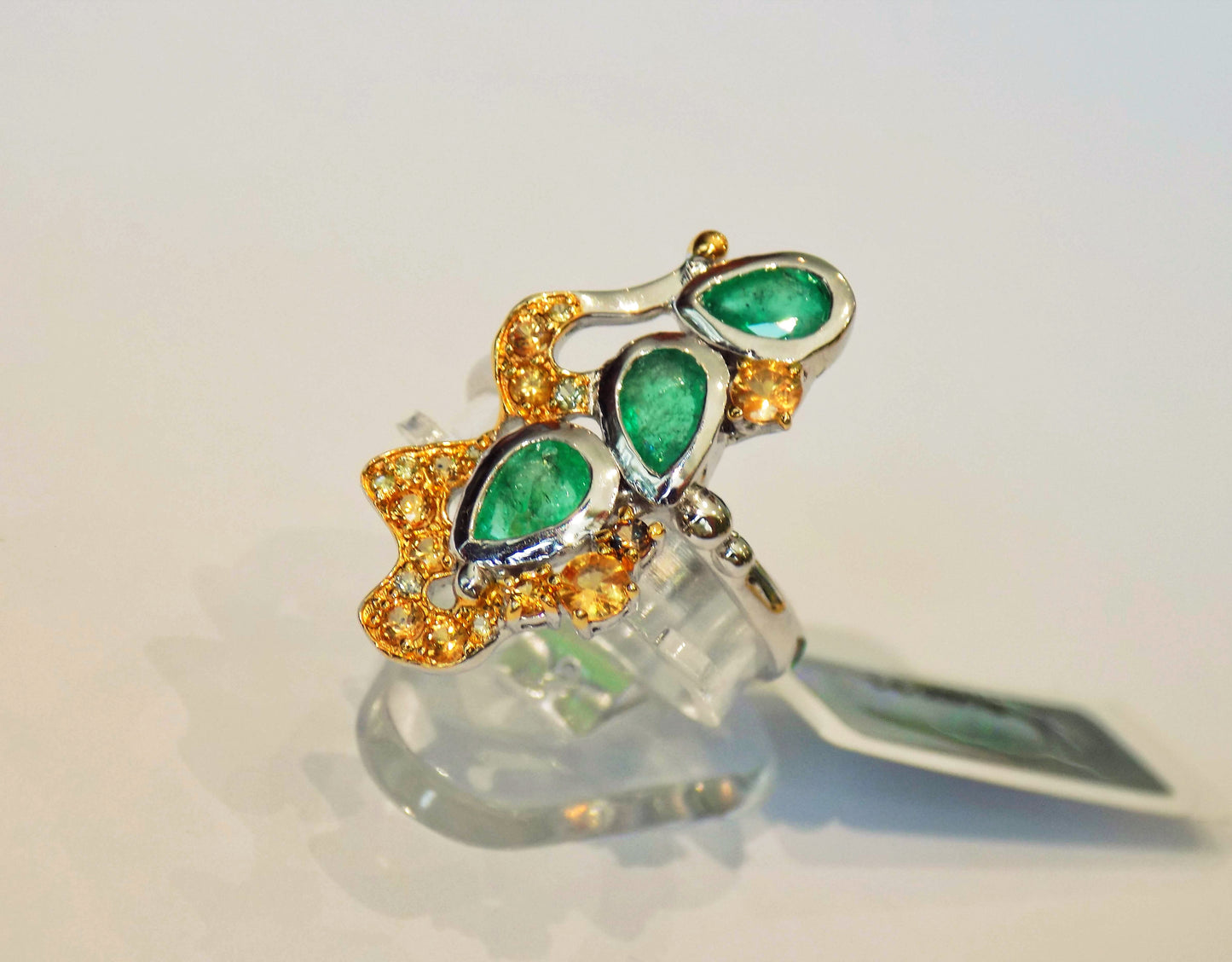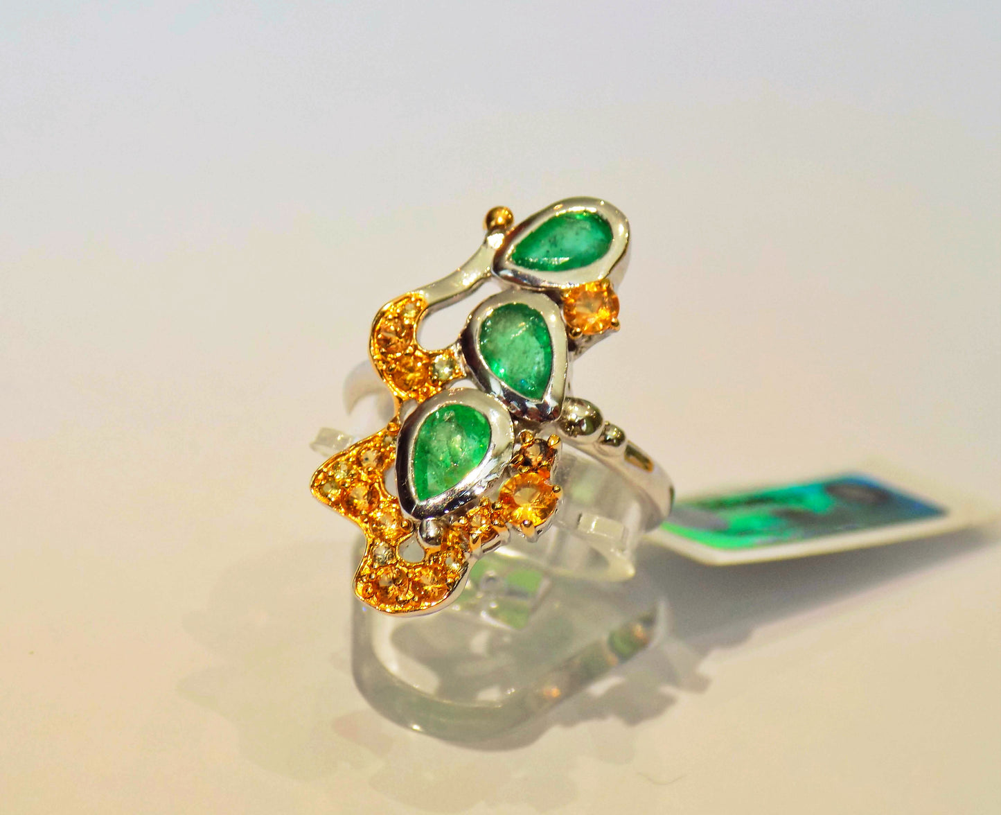 Sudraba gredzens ar smaragdiem un dzelteniem safīriem