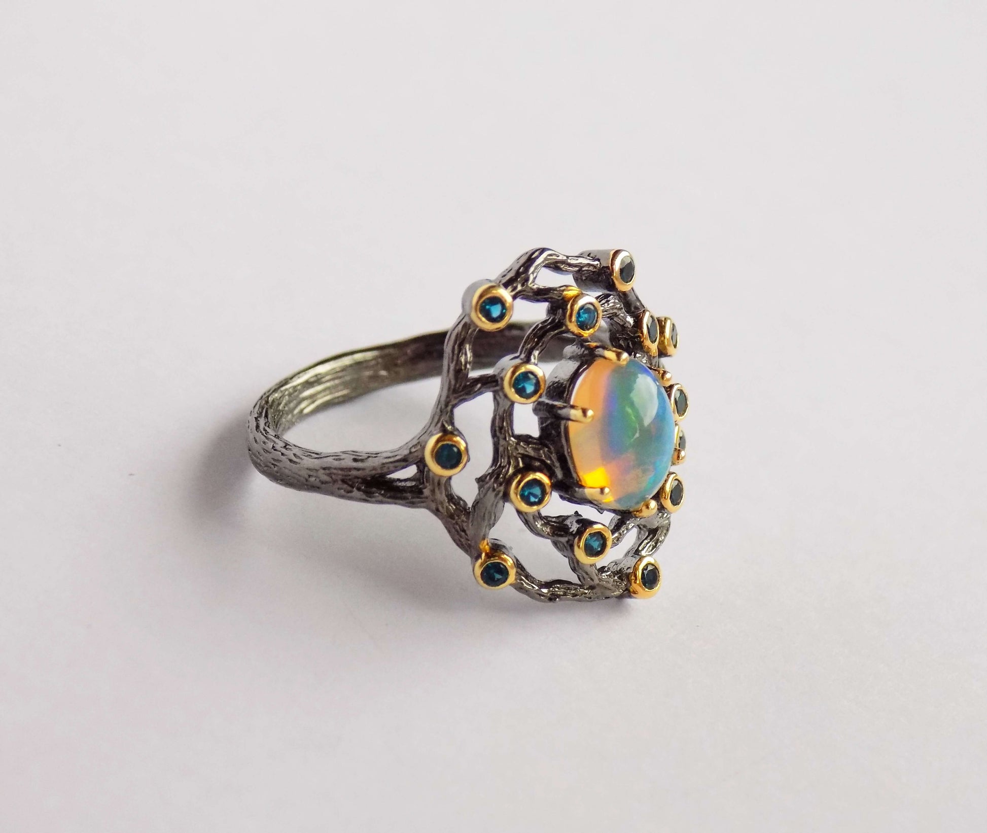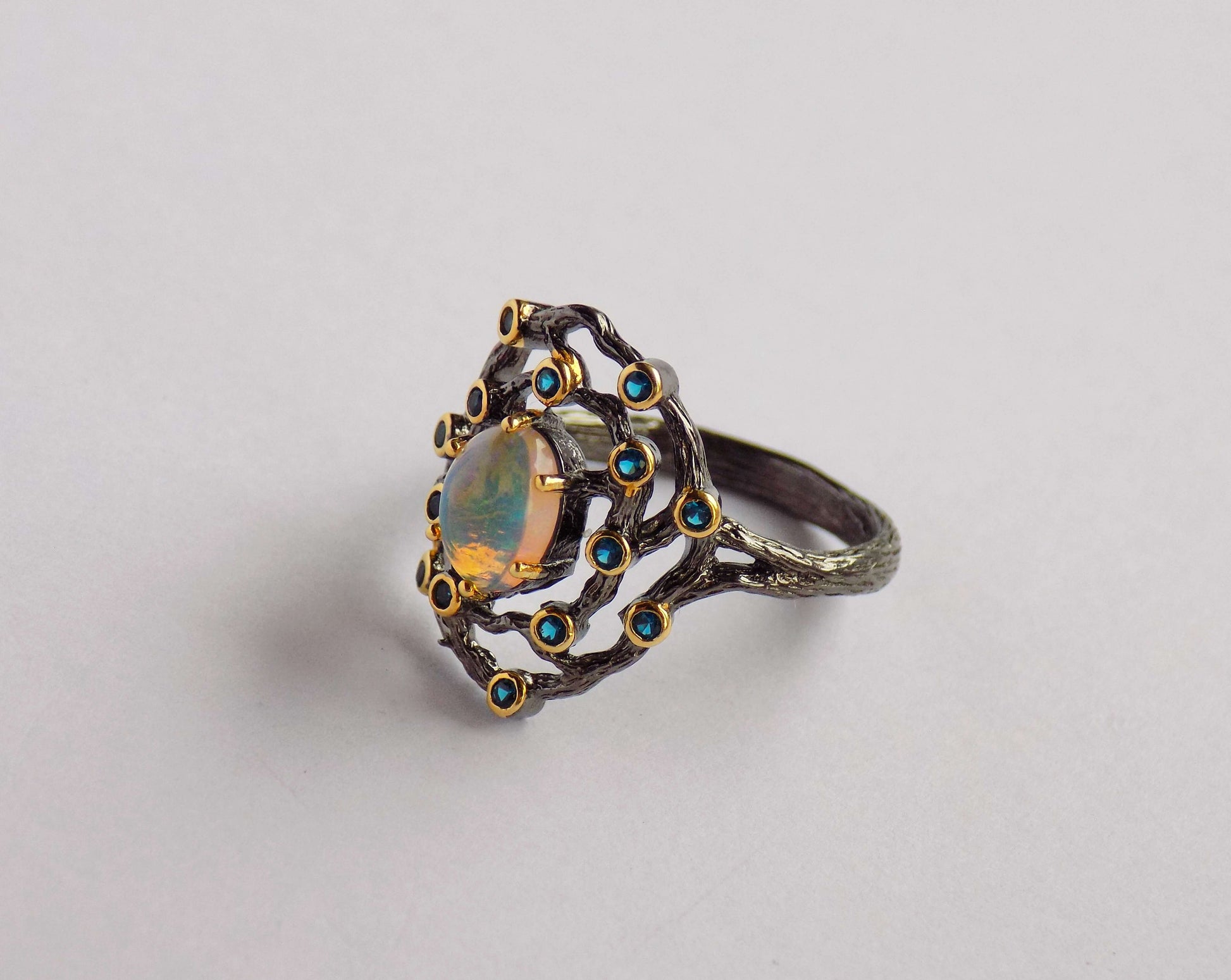 Iegremdējieties burvīgajā dabas skaistumā ar mūsu melno rodiju un 18 K apzeltītu sudraba gredzenu, kas ir satriecoša cieņa pret zemes dārgumiem. Šis gredzens ir rūpīgi izstrādāts un iedvesmots no mums apkārt esošajiem organiskajiem brīnumiem, un tajā ir Etiopijas opāls, kas atgādina burvīgo krāsu spēli, kas atrodama dabas sirdī, un zilie cirkoni, kas atspoguļo skaidras debess spilgtās nokrāsas.