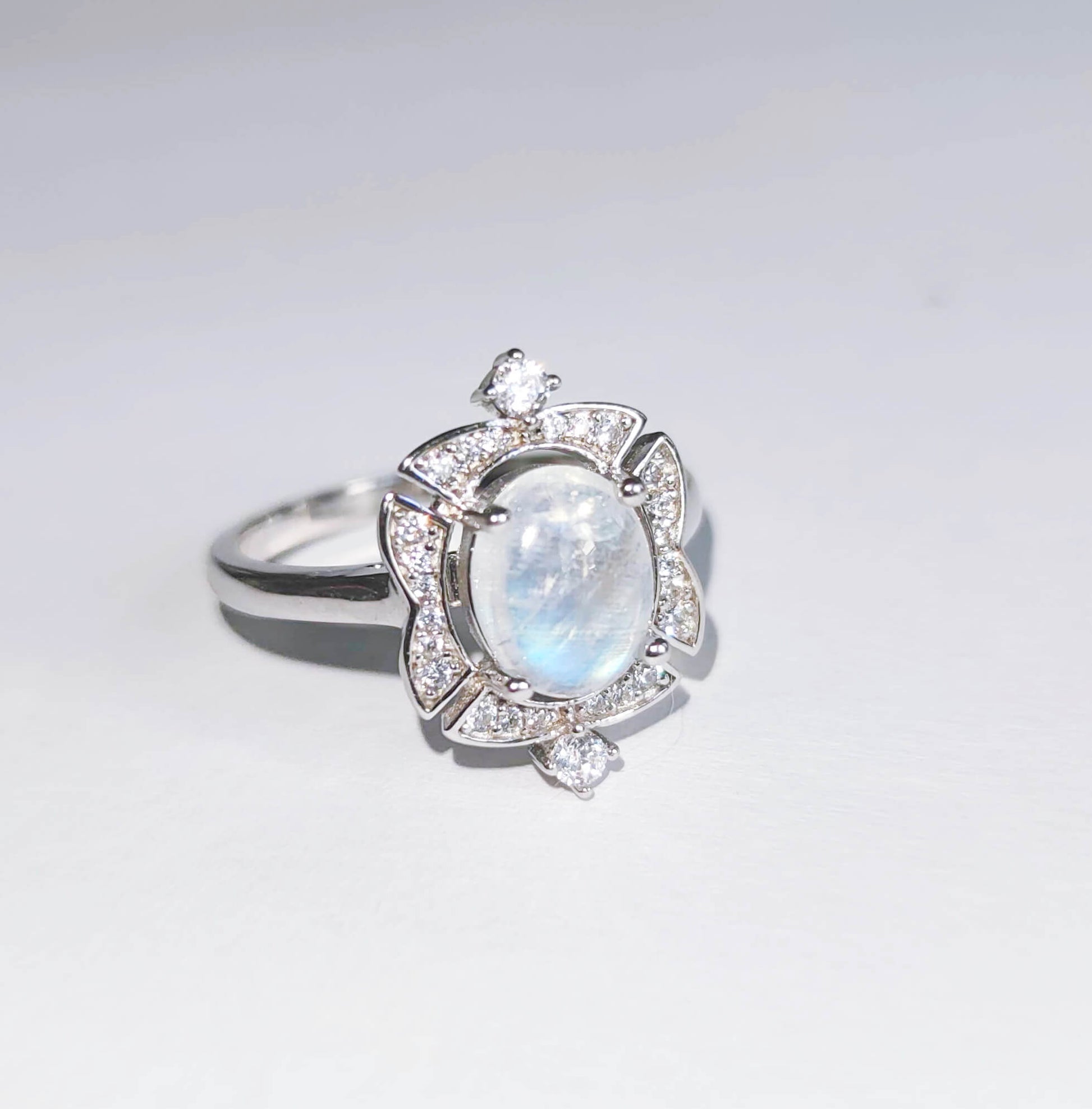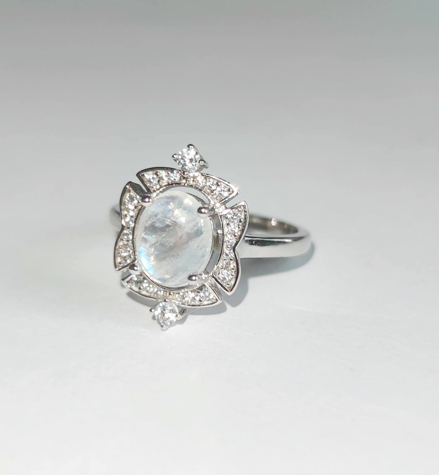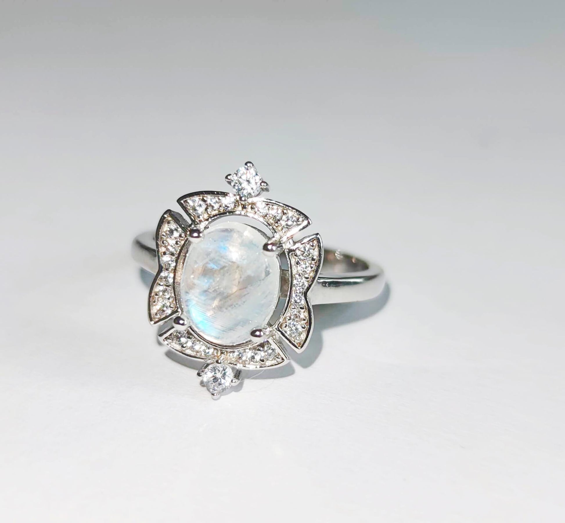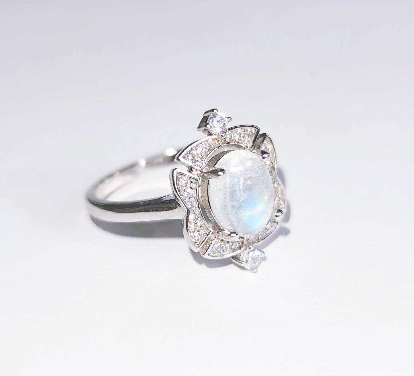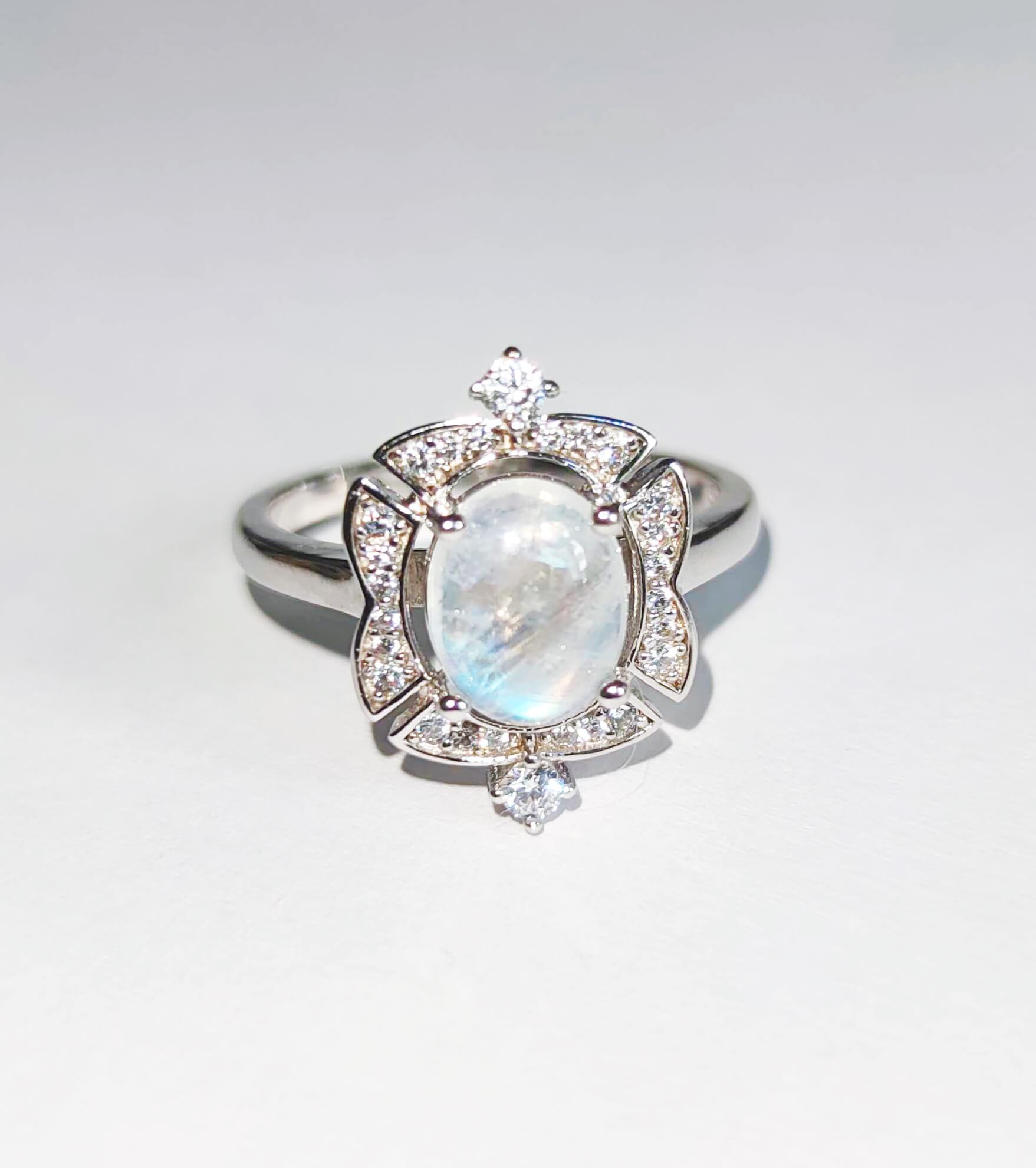 Šī izsmalcinātā gredzena centrā ir satriecošs dabisks mēness akmens, kas izstaro burvīgu, zaigojošu mirdzumu zilos, pelēkos un baltos toņos. Mēnessakmeni ieskauj virkne mazāku, dzirkstošu cirkonu, kas gaismā mirgo un spīd, radot skaistu kontrastu mēnessakmens maigajam, ēteriskajam mirdzumam.
