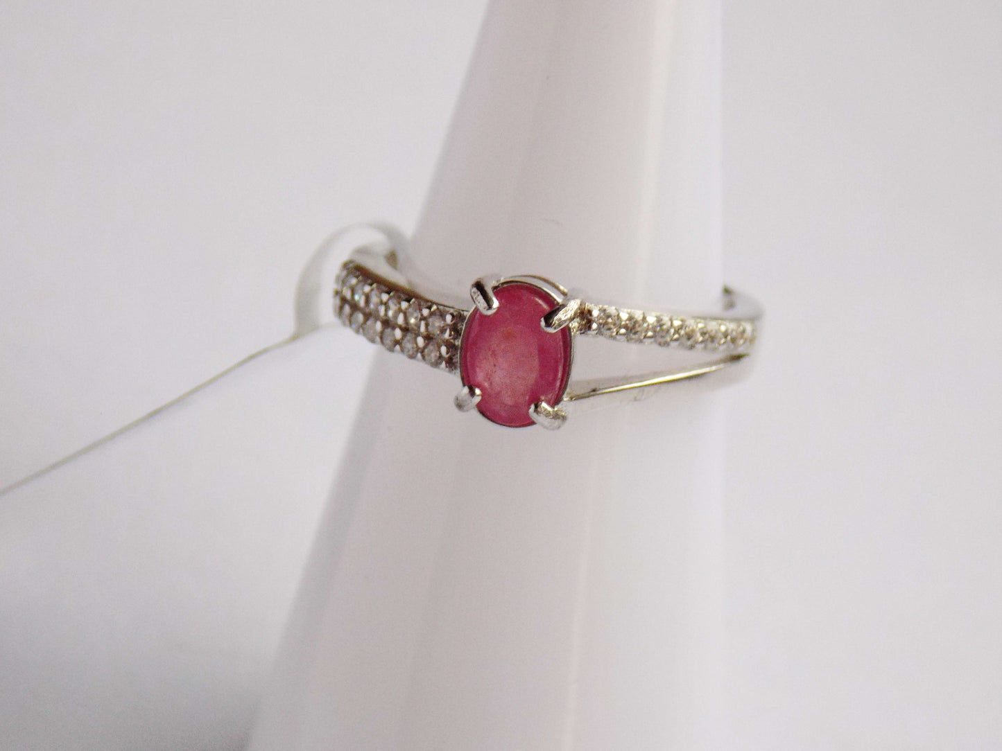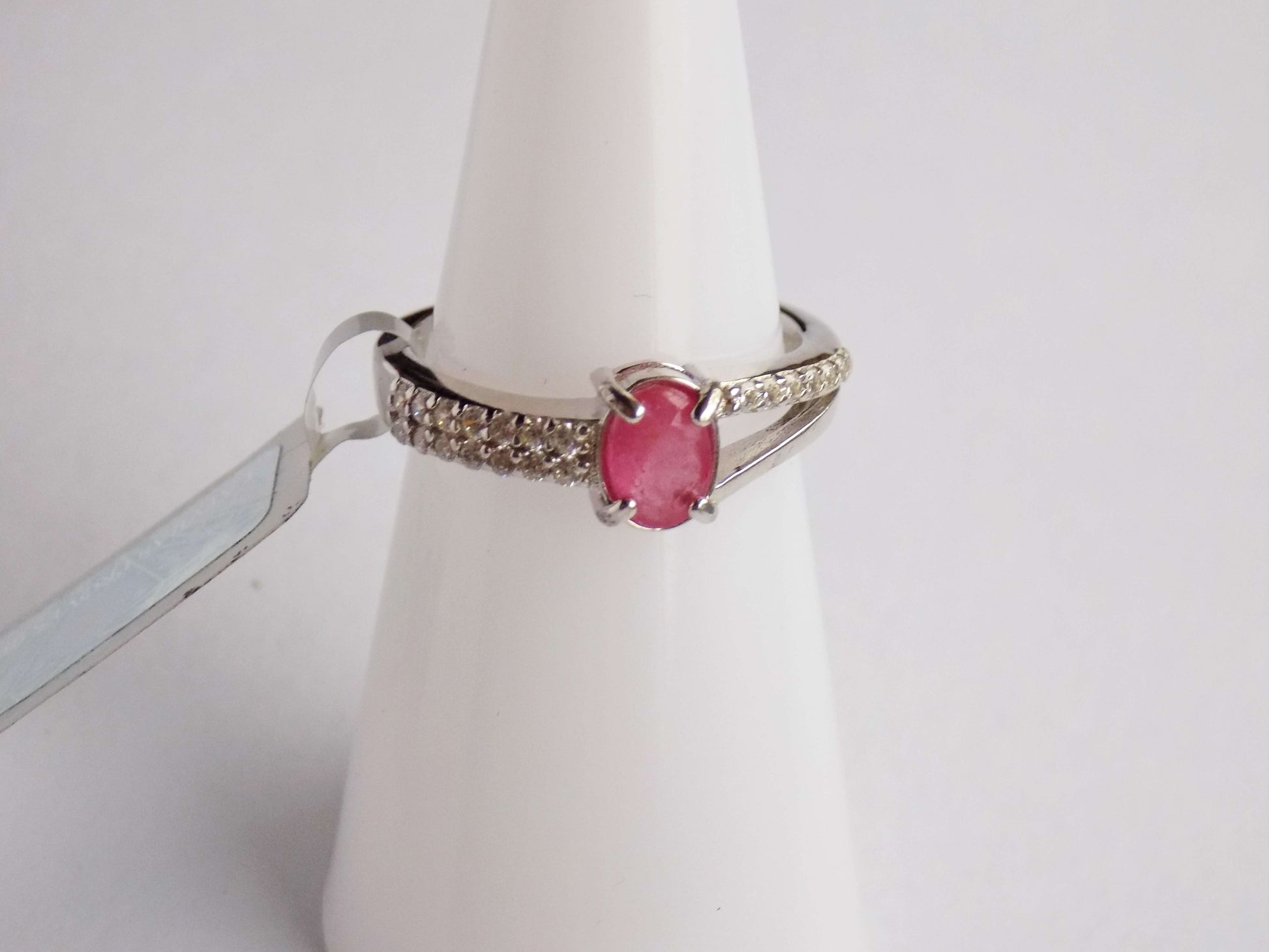 Dabīgie dārgakmeņi: Rubīns (apstrādāts) 0,6ct - 1 gab. (0,4 cm x 0,6 cm) un cirkoni 21 gab. (0,13 cm x 0,13 cm).