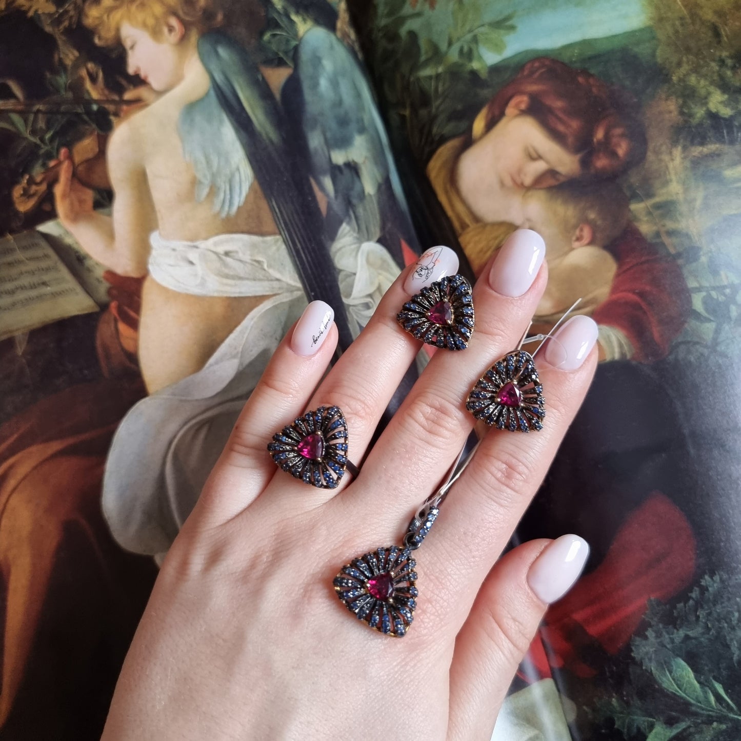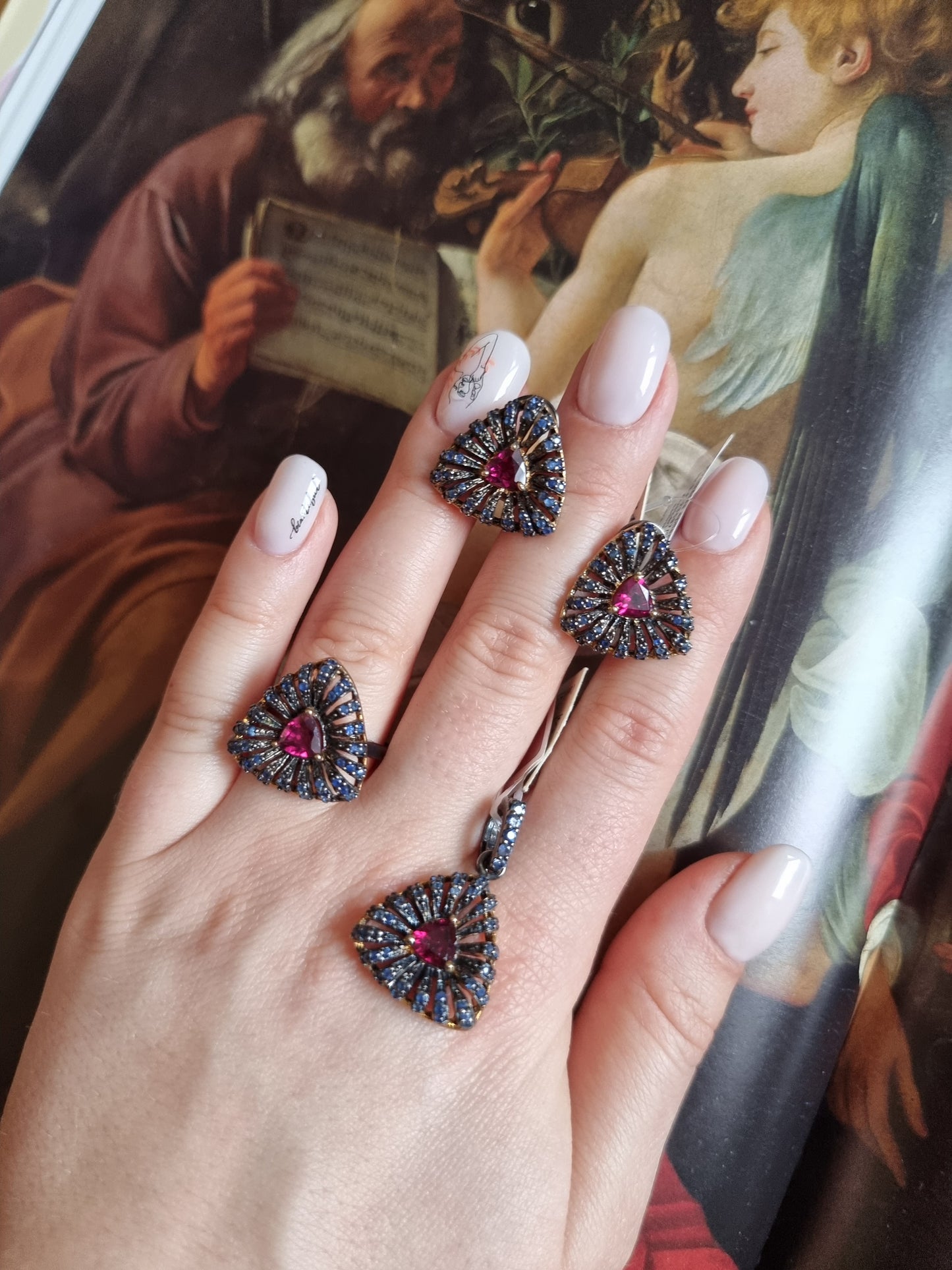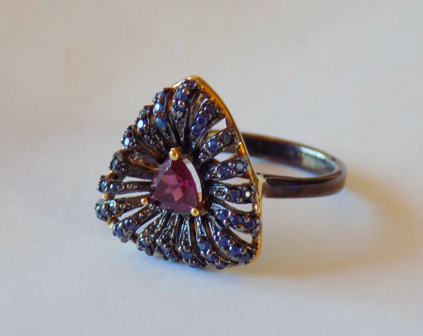 Sudraba gredzens ar rozā granātu un ziliem safīriem