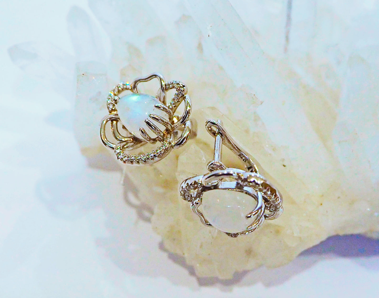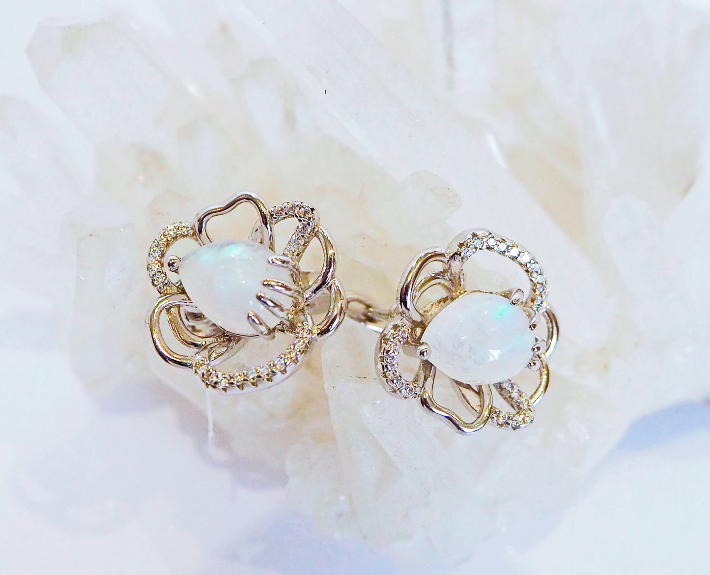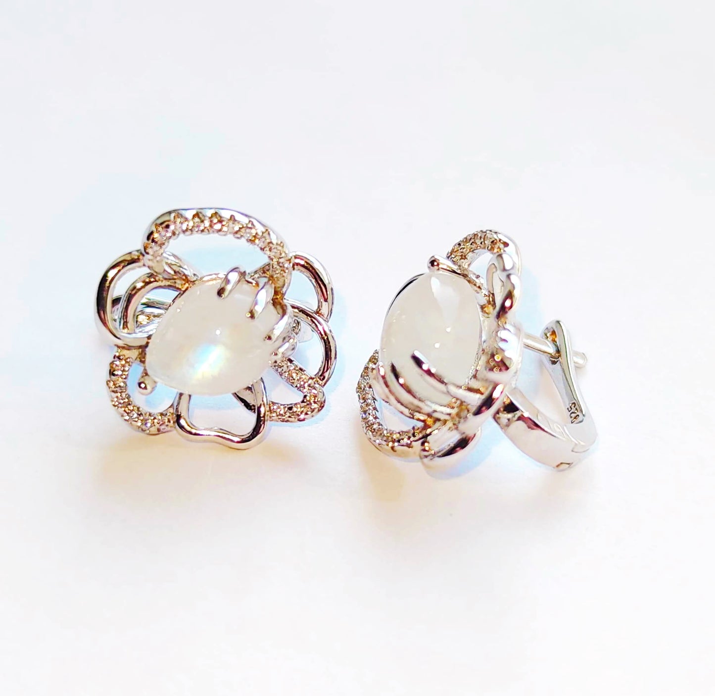 Silver Flower Earrings with Moonstones and Zircons