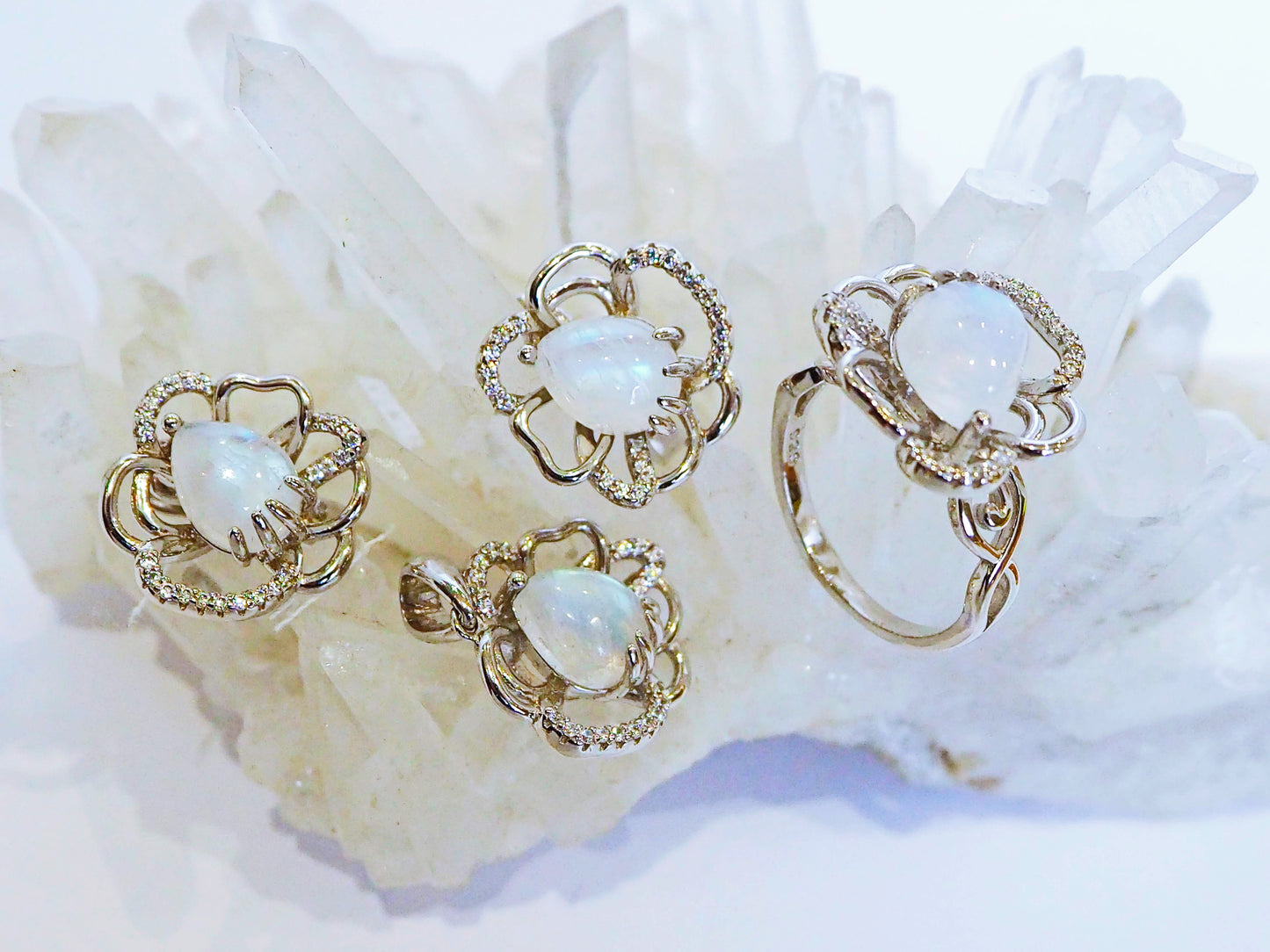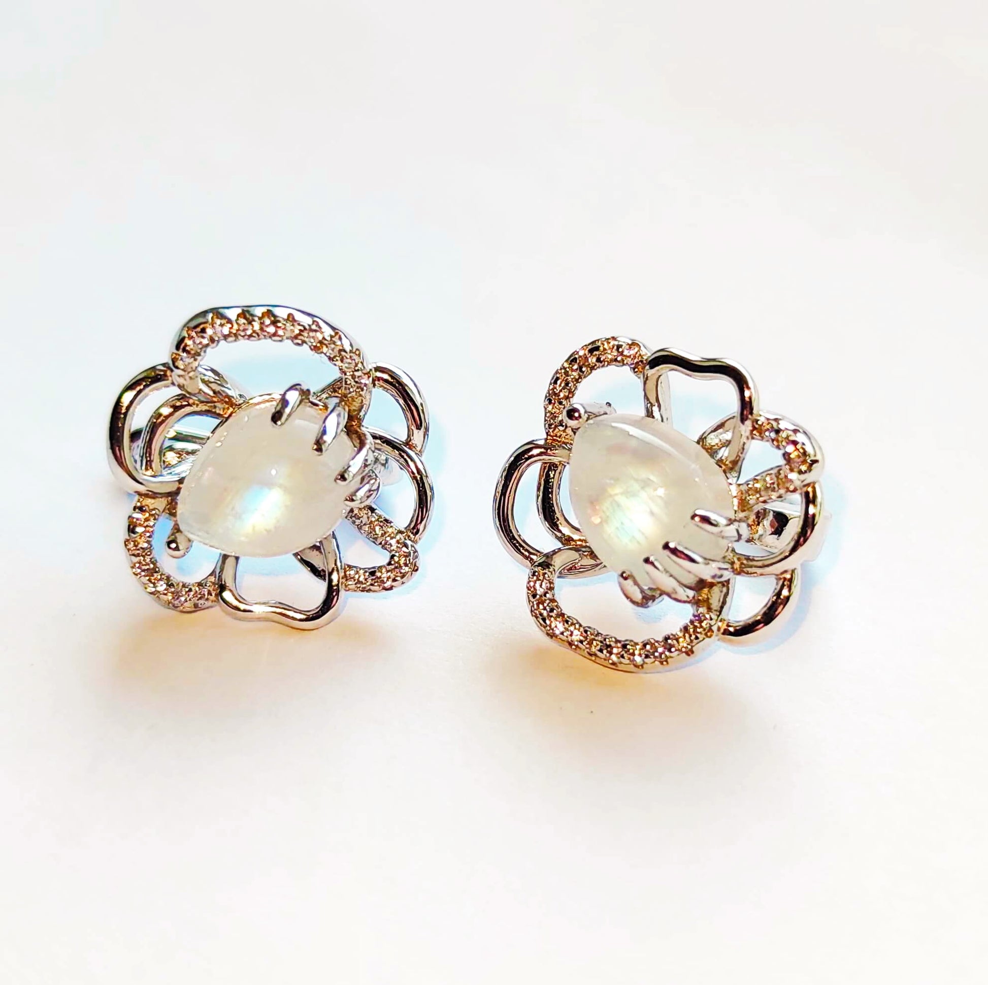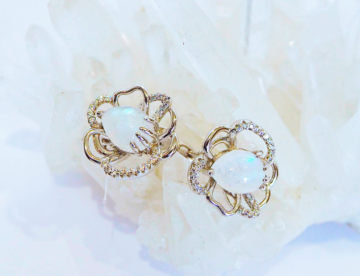 Silver Flower Earrings with Moonstones and Zircons