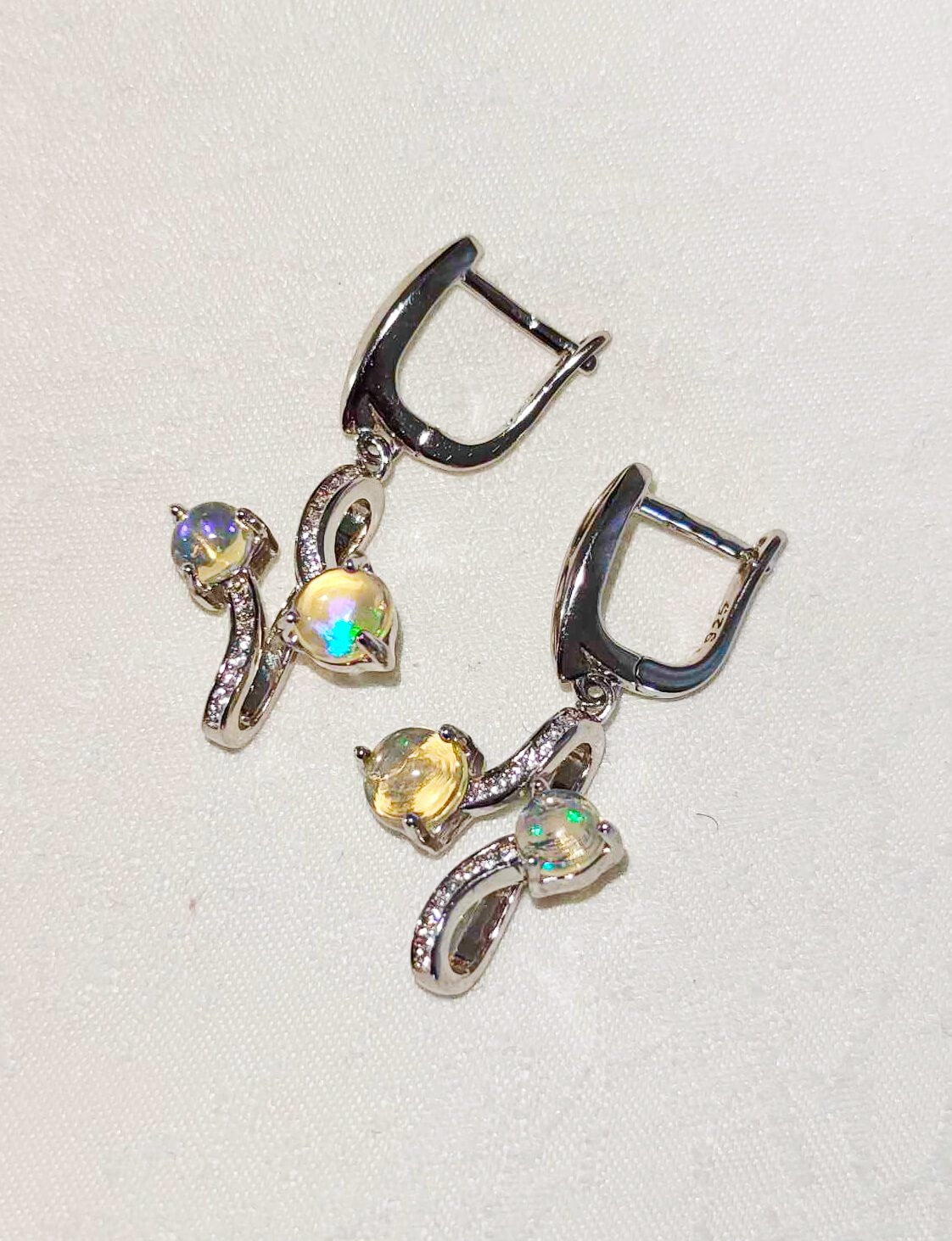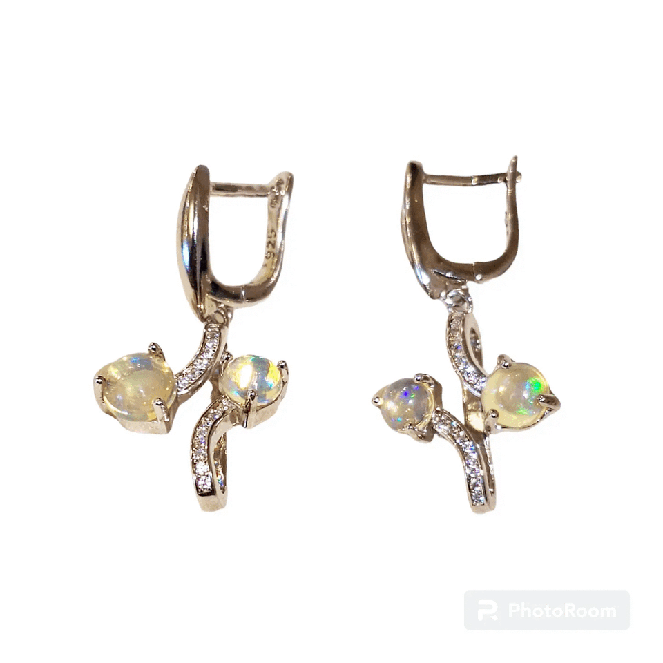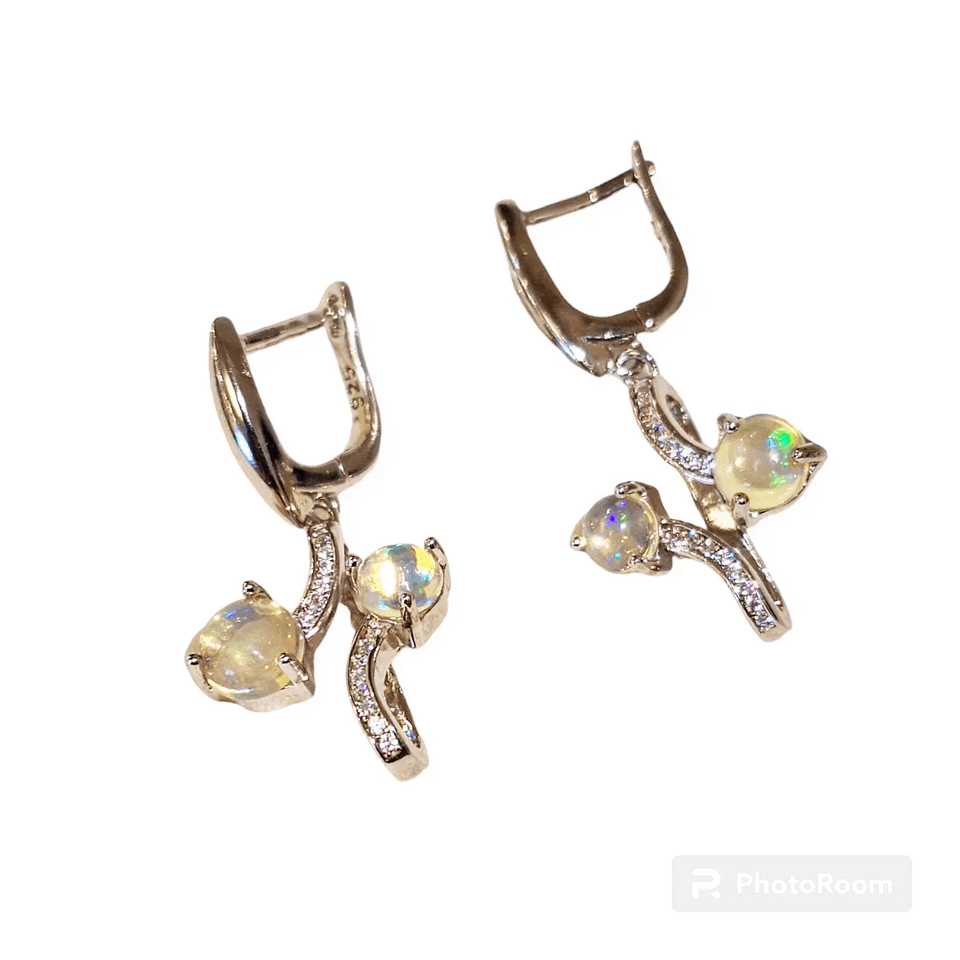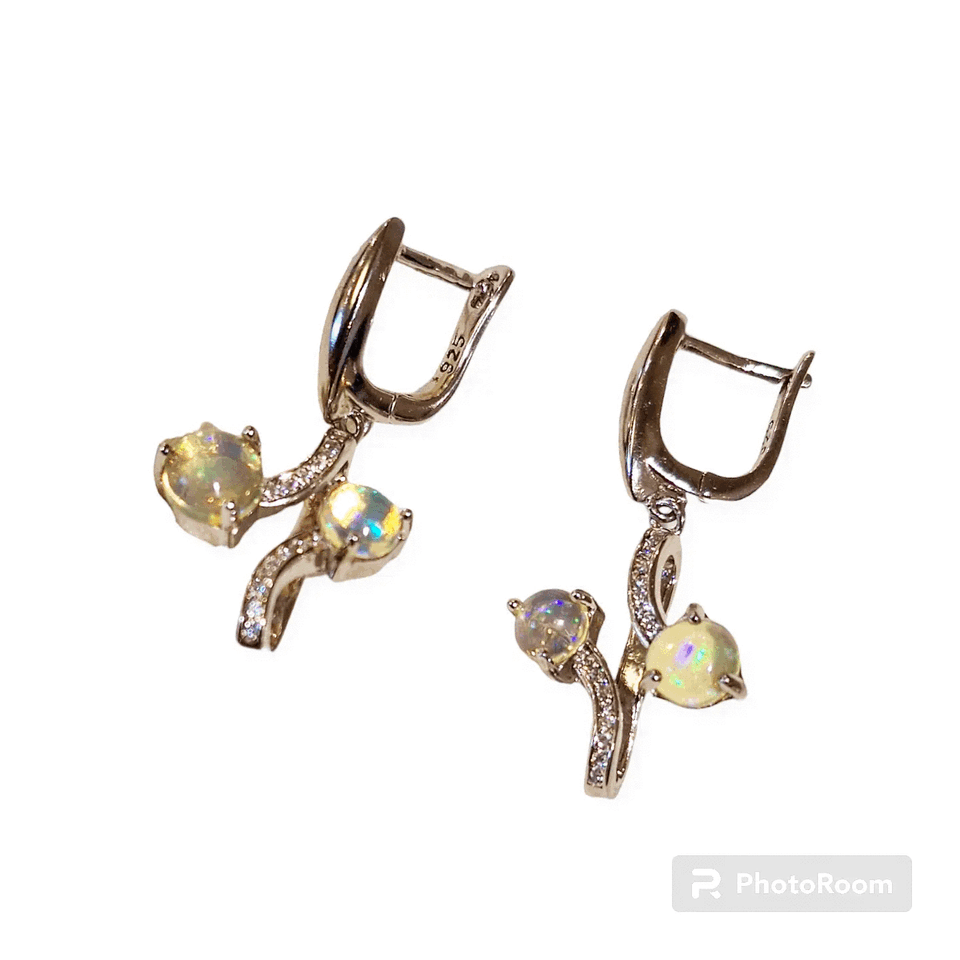 These earrings feature a secure and stylish English lock design, ensuring both comfort and elegance. The ethereal play of colors in the opals, ranging from serene blues to vibrant greens and sunny yellows, is complemented by the dazzling sparkle of zircons.