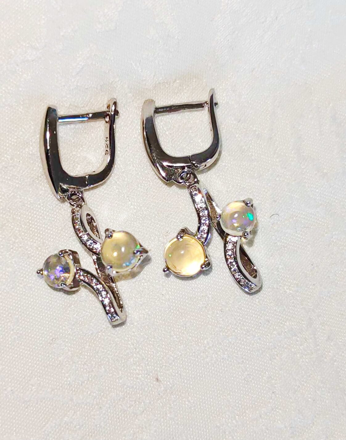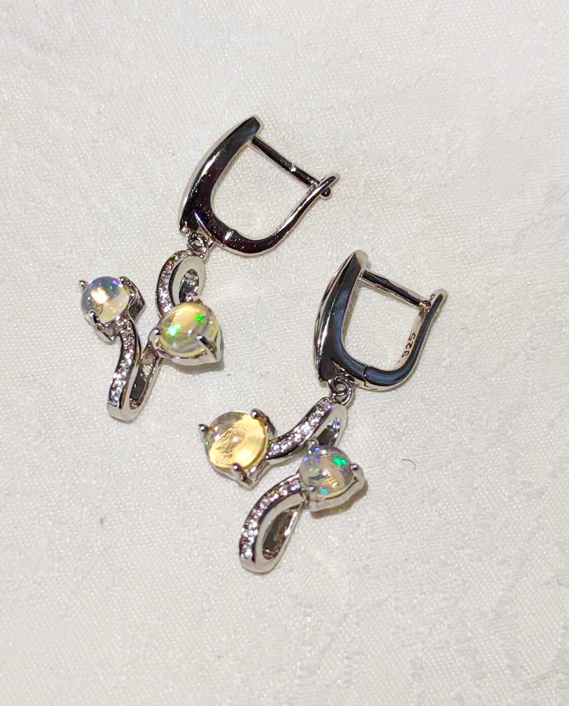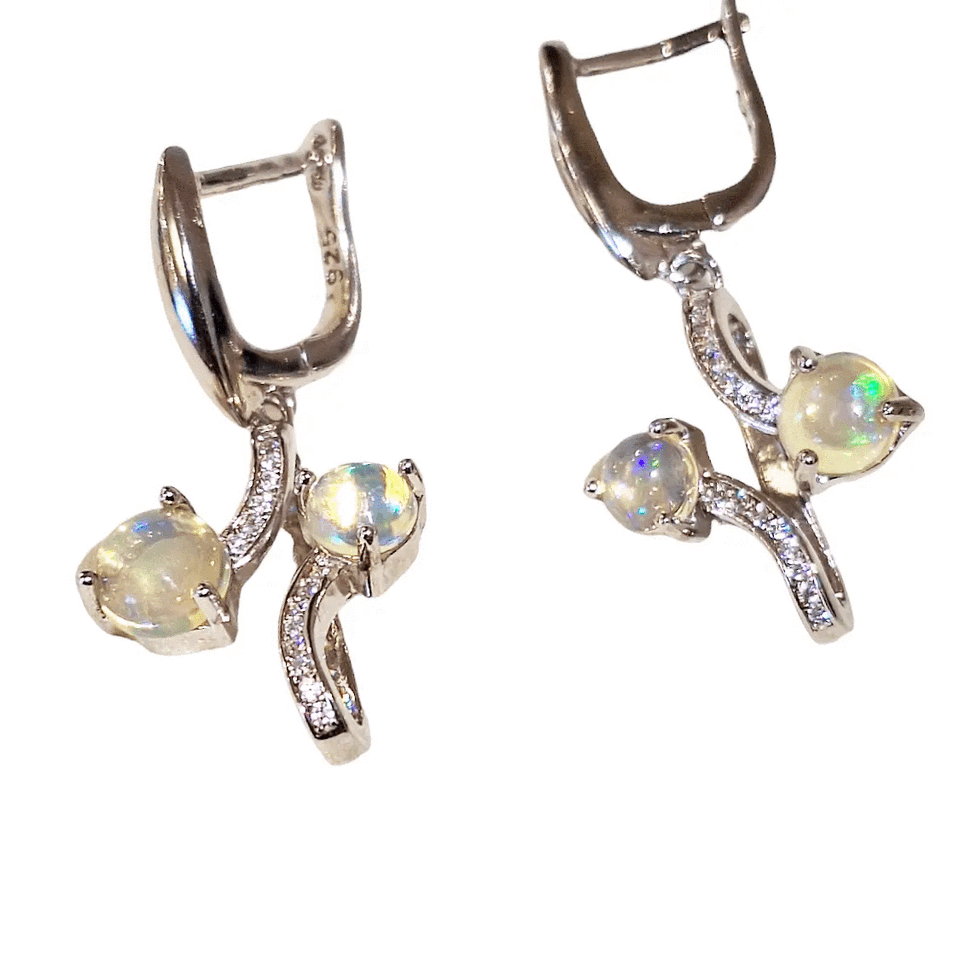 These earrings feature a secure and stylish English lock design, ensuring both comfort and elegance. The ethereal play of colors in the opals, ranging from serene blues to vibrant greens and sunny yellows, is complemented by the dazzling sparkle of zircons.