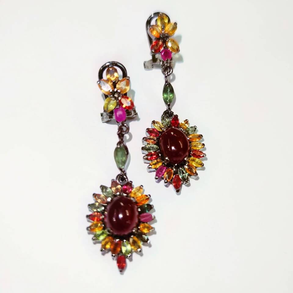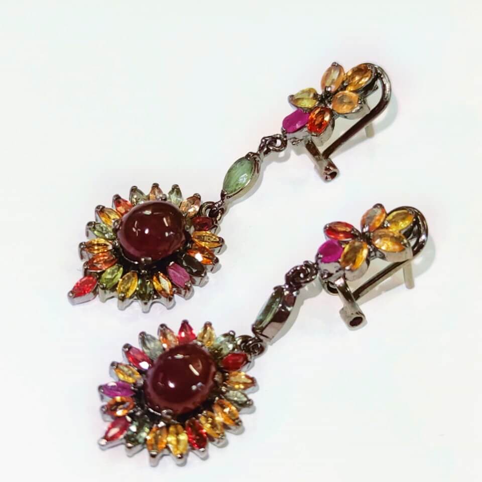 Natural gemstones: Rubies (cabochons, treated) 5ct - 2 pcs. (0.75 cm 0.95 cm), 2 pcs (0.3 cm x 0.4 cm) and Multicolored Sapphires 8.64ct - 2 pcs. (0.33 cm x 0.63 cm), 10 pcs. (0.3 cm x 0.45 cm), 38 pcs. (0.25 cm x 0.4 cm),