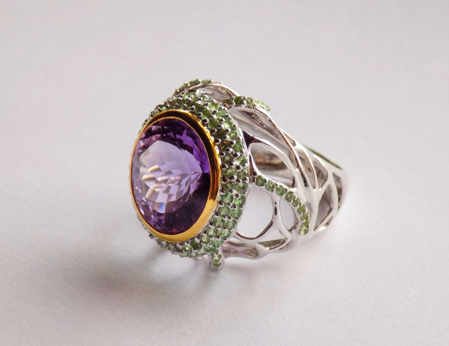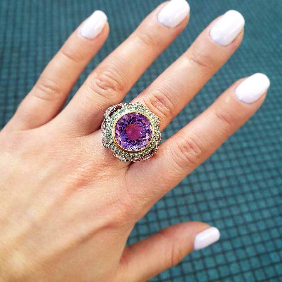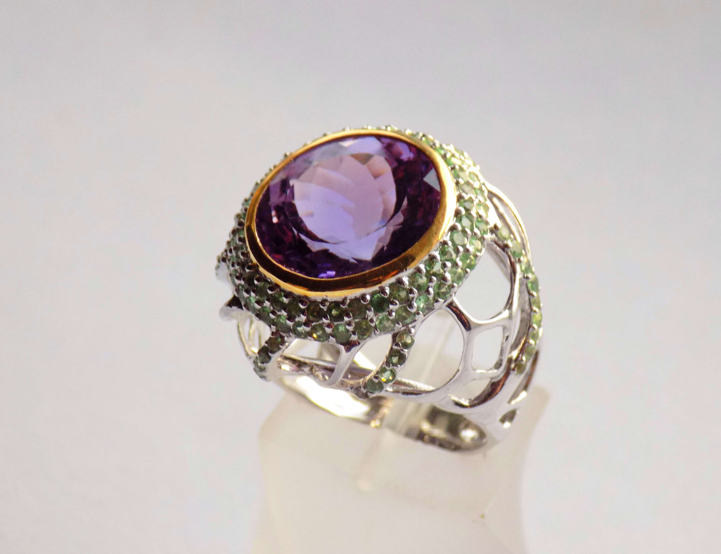Natural gemstones: Amethyst 1 pc. - 17.59ct ~(1.45 cm x 1.45 cm) and Tsavorite Garnets 108 pcs. - 1.38ct ~(0.1 cm x 0.1 cm - 0.15 cm x 0.15 cm).