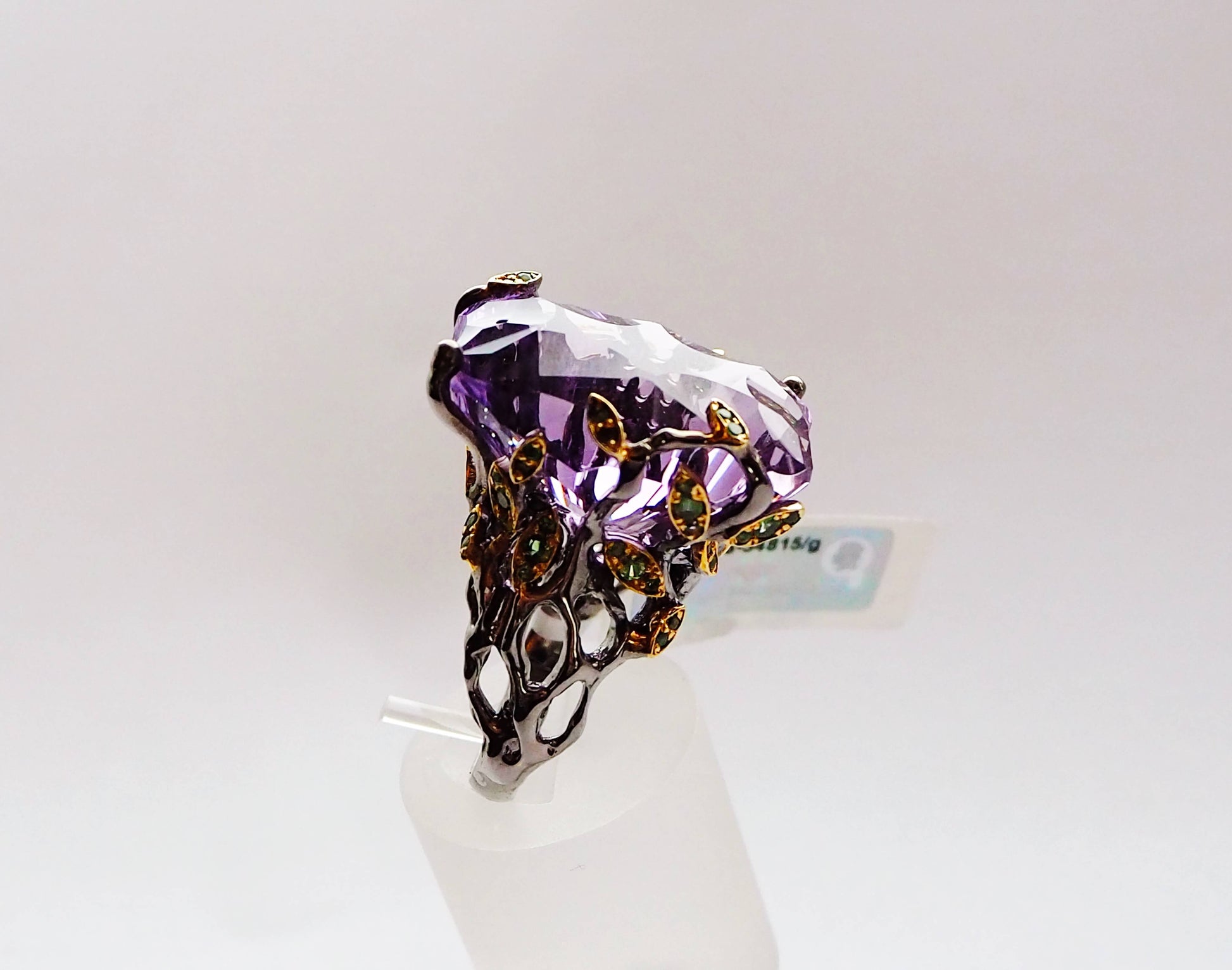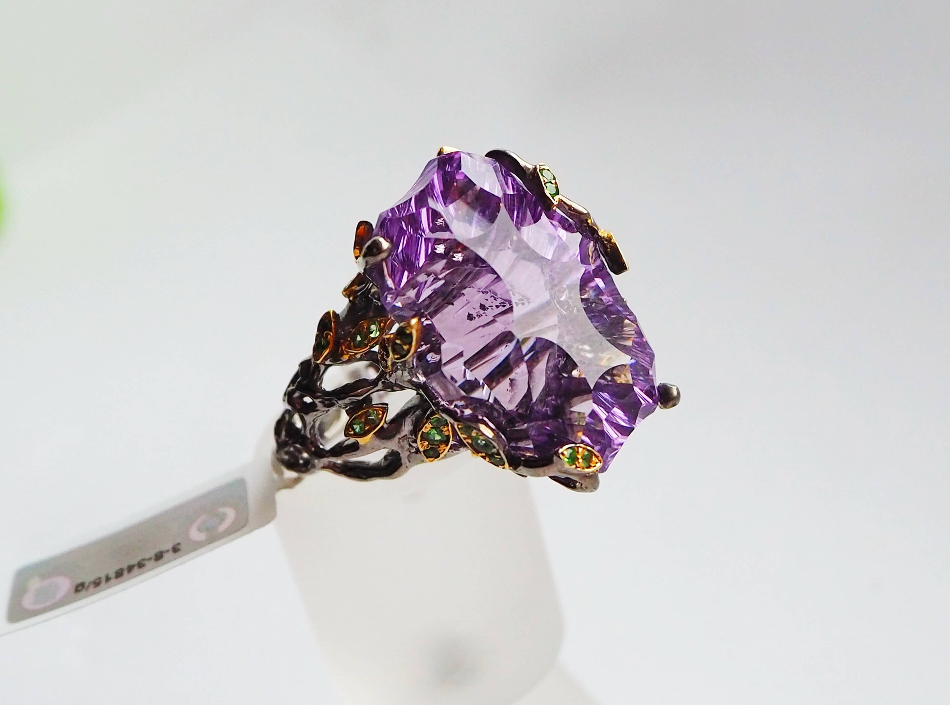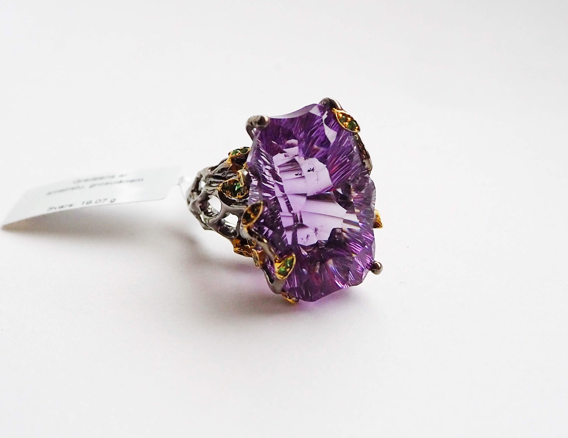 Natural gemstones: Amethyst (faceted) 1 pc. - 39.7ct (1.8 cm x 2.5 cm) and Tsavorite Garnets 56 pcs. - 0.87ct (0.1 cm x 0.1 cm - 0.2 cm x 0.2 cm).