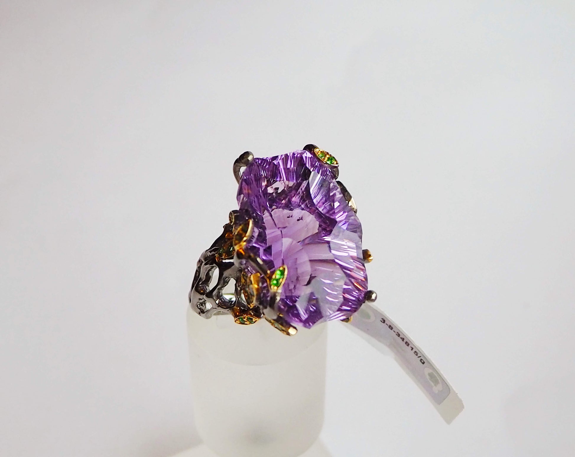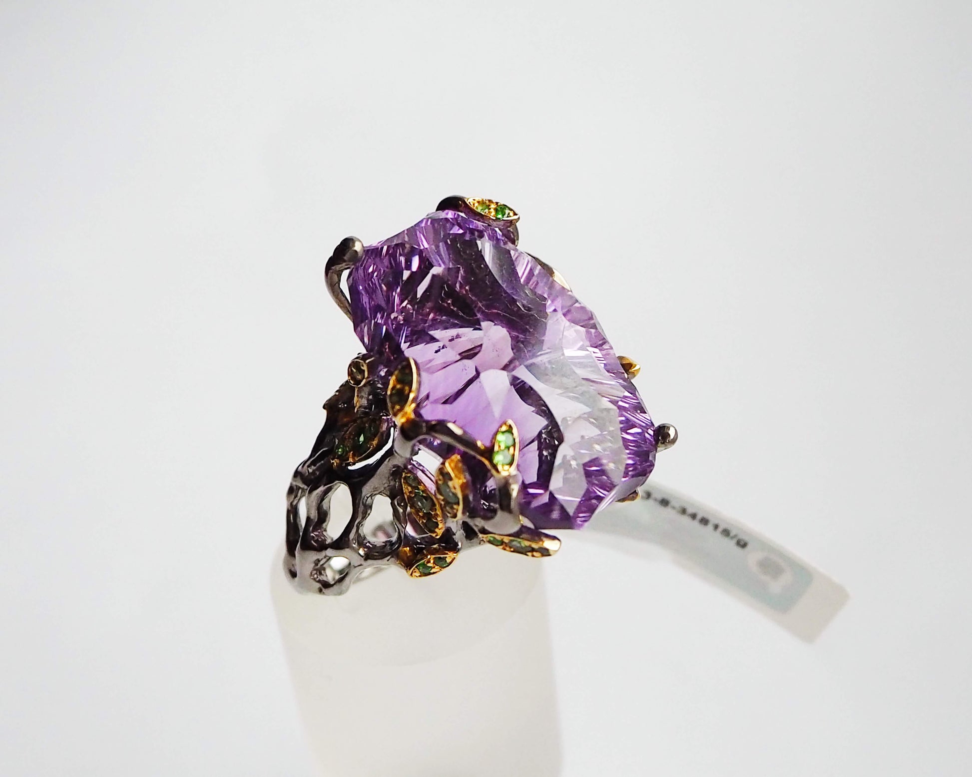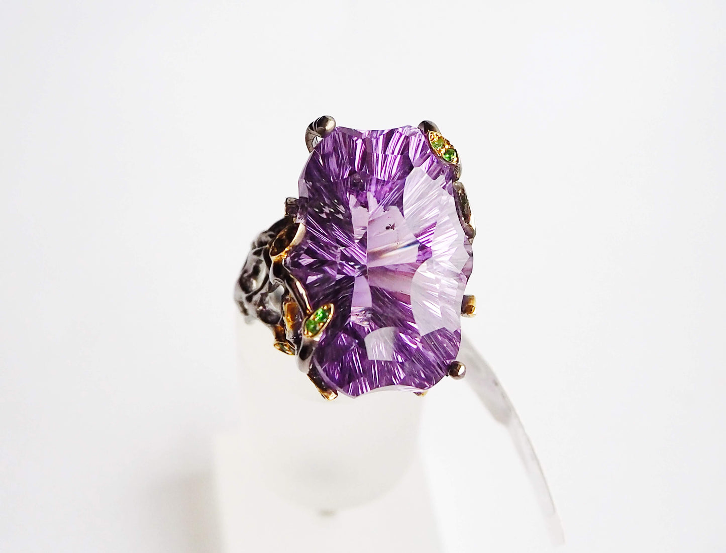 Natural gemstones: Amethyst (faceted) 1 pc. - 39.7ct (1.8 cm x 2.5 cm) and Tsavorite Garnets 56 pcs. - 0.87ct (0.1 cm x 0.1 cm - 0.2 cm x 0.2 cm).