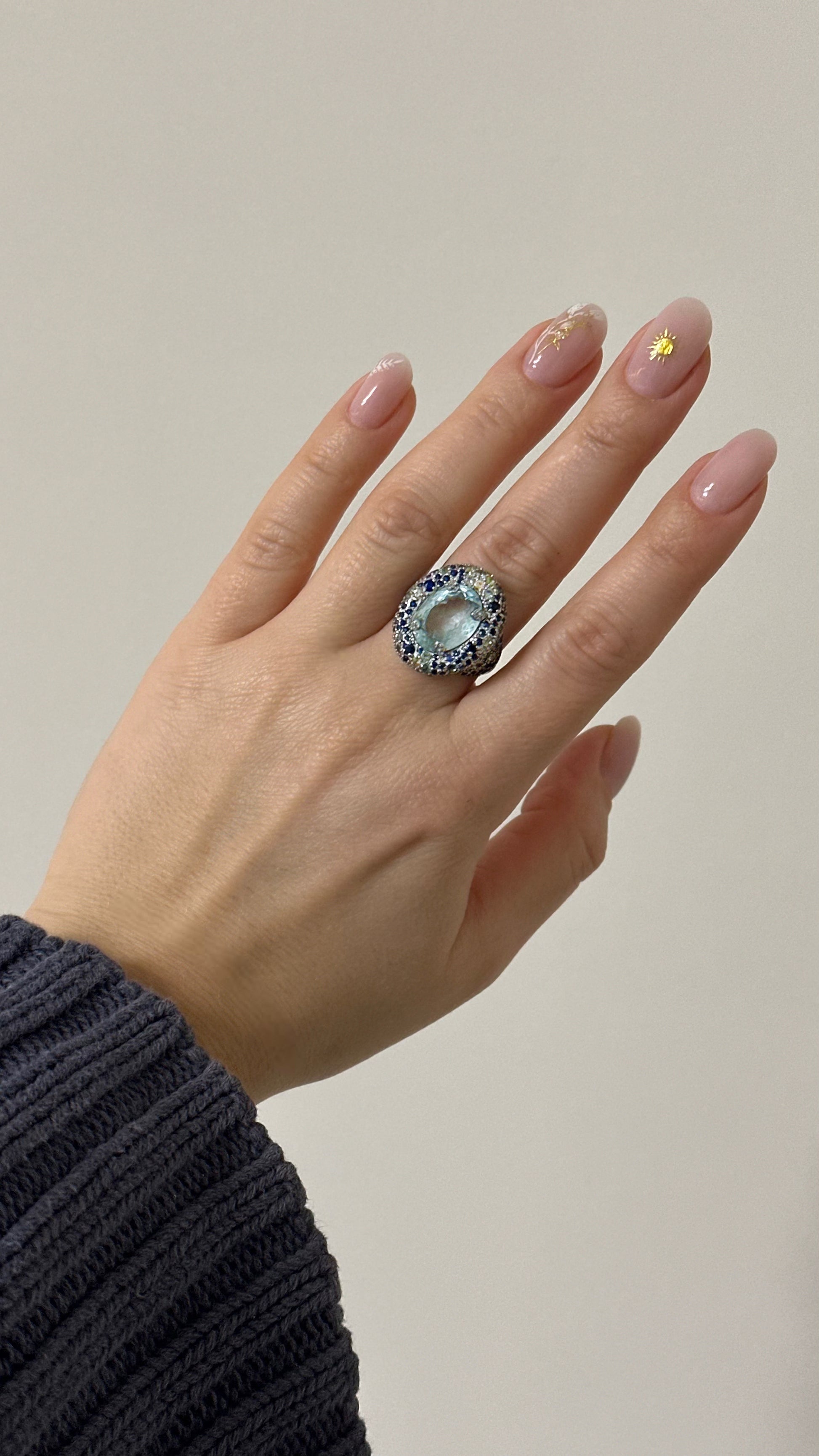 An exquisite expression of modern opulence, this statement ring is crafted in 925 sterling silver with a luminous rhodium-plated finish. A serene natural aquamarine glows at the center, encircled by a radiant halo of multicoloured sapphires that shimmer with refined brilliance.