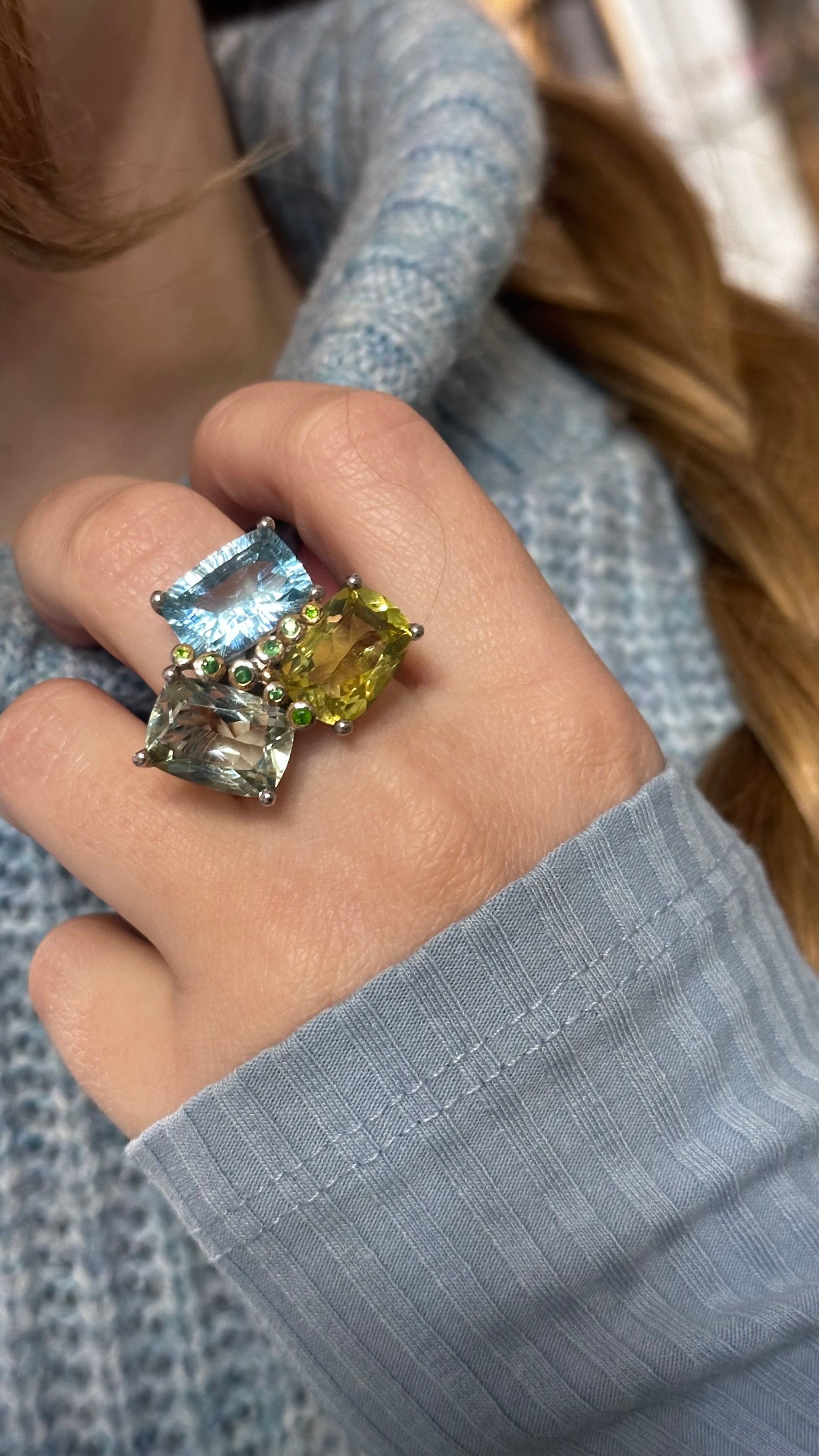 Modern silver ring with blue topaz, lemon citrine, prasiolite and green garnets