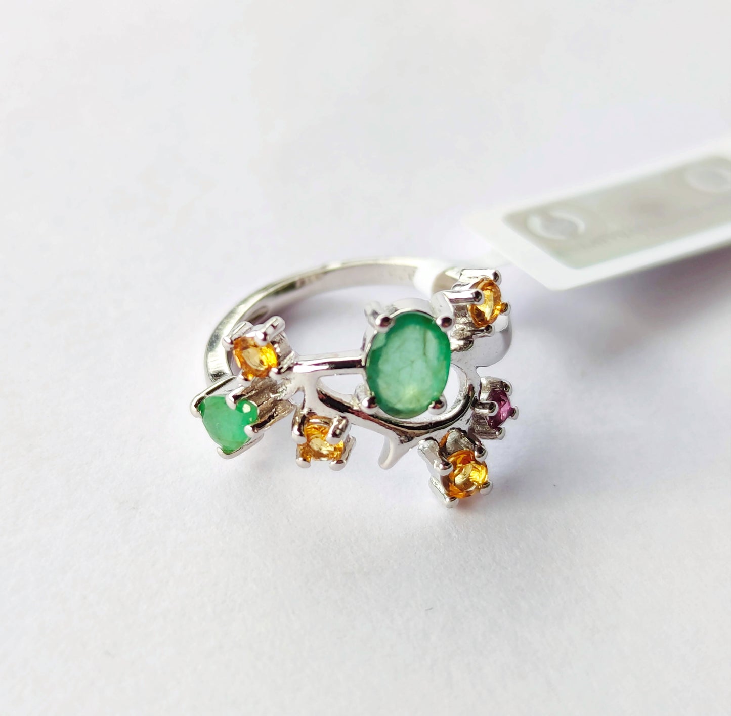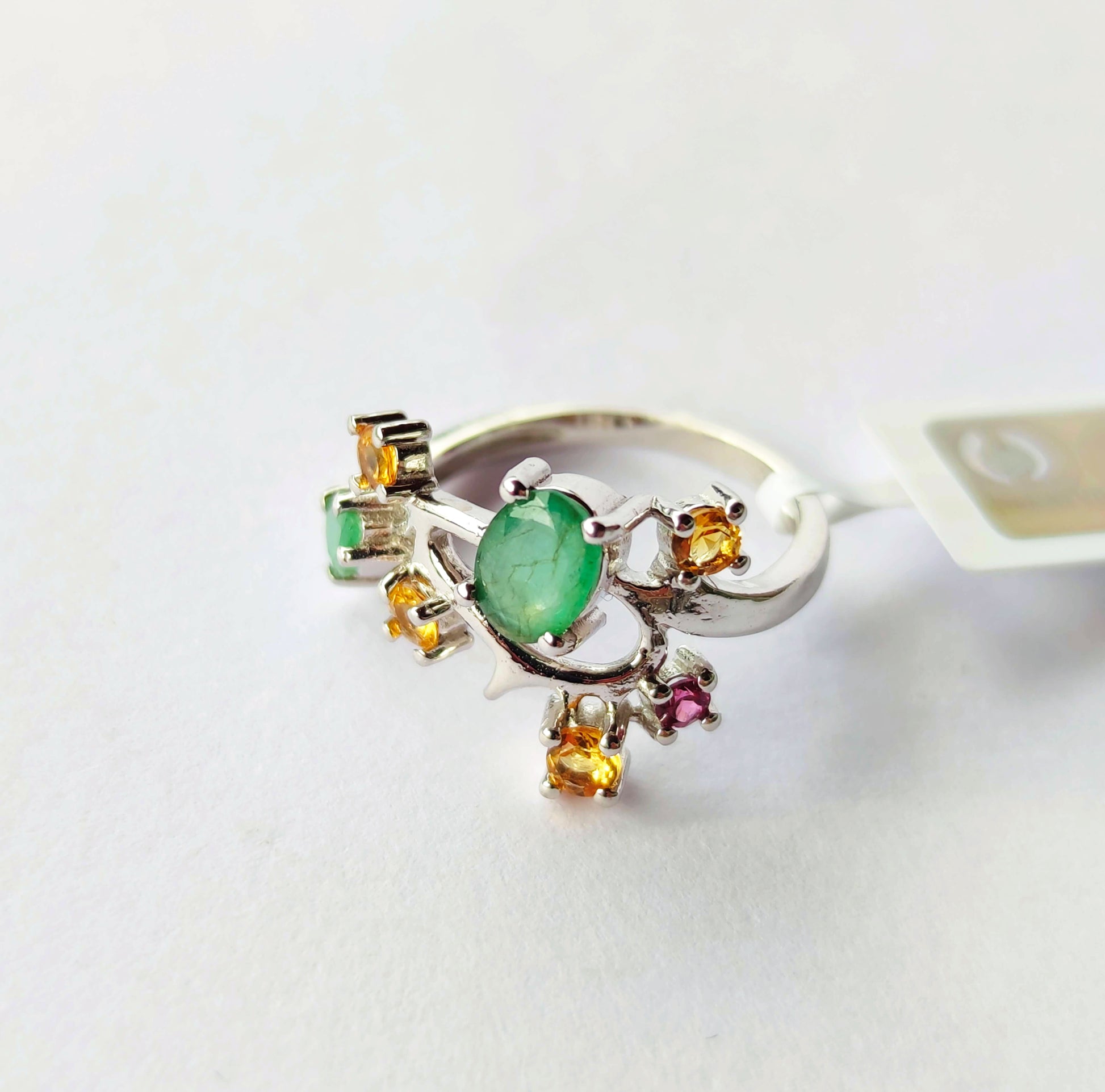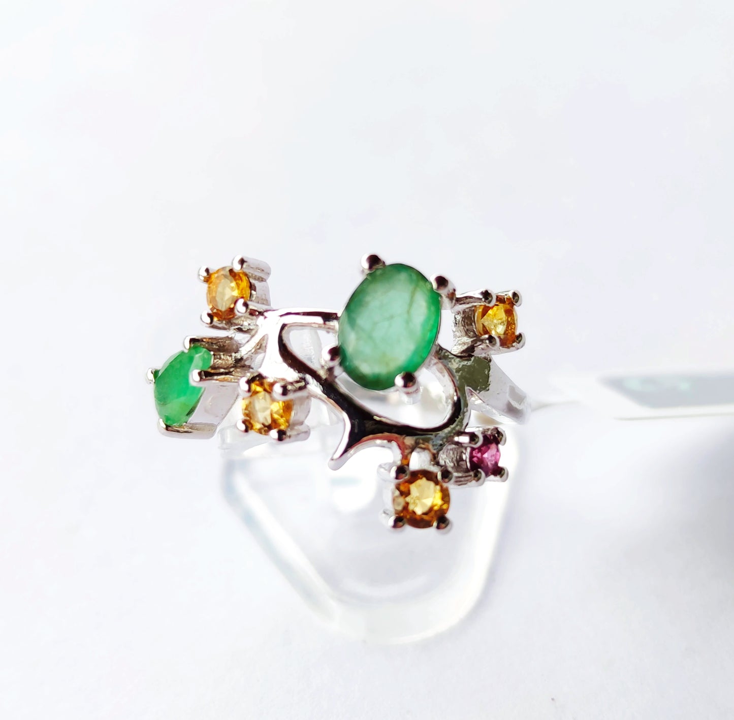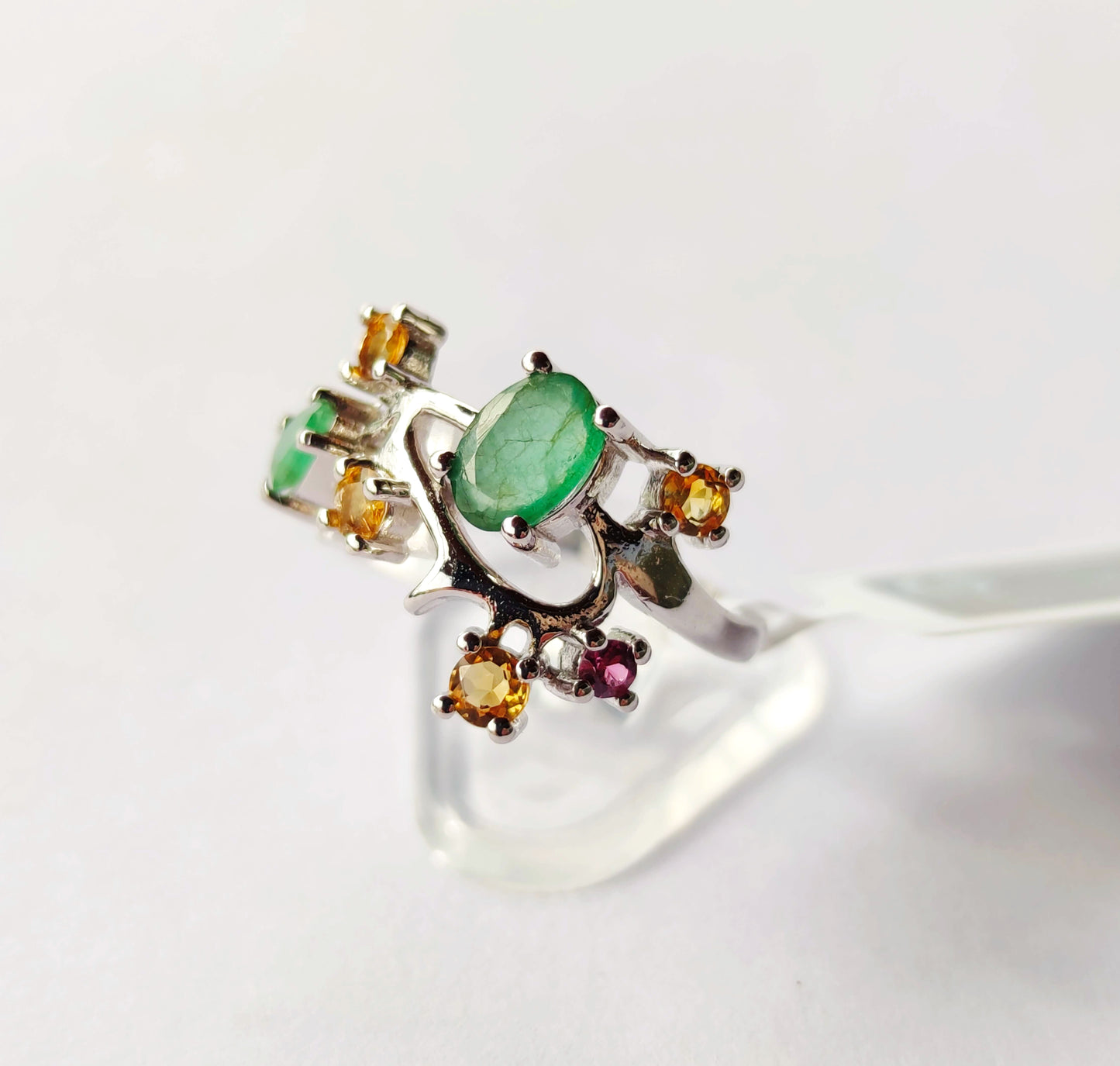 Silver Ring with Emeralds, Citrines and Rhodolite Garnet