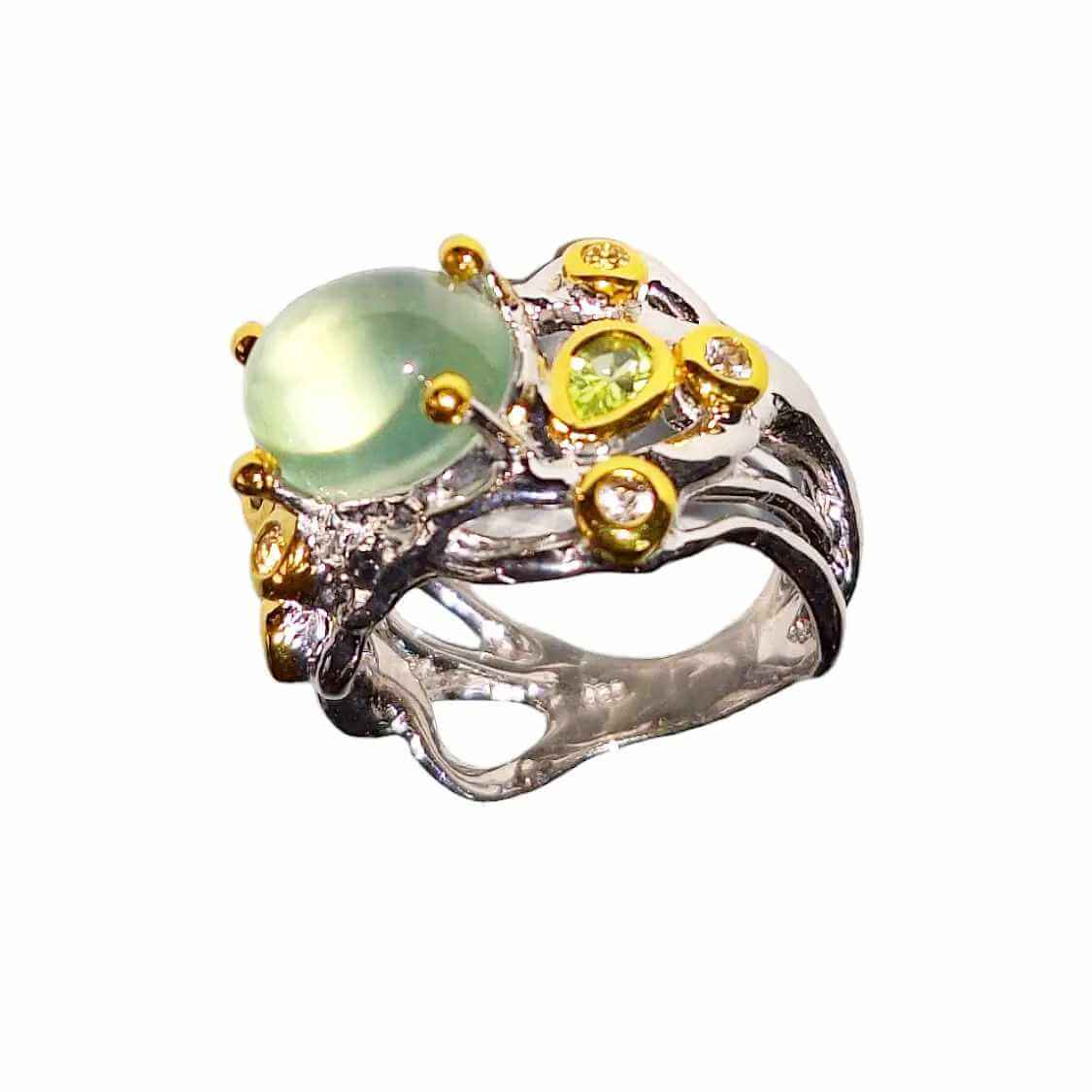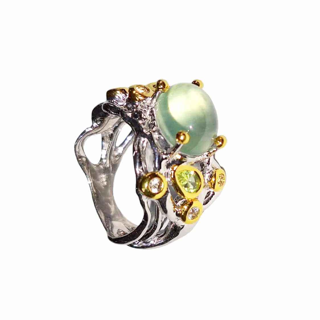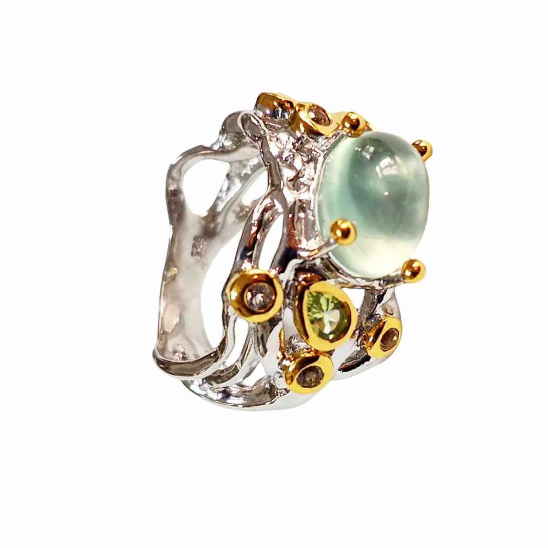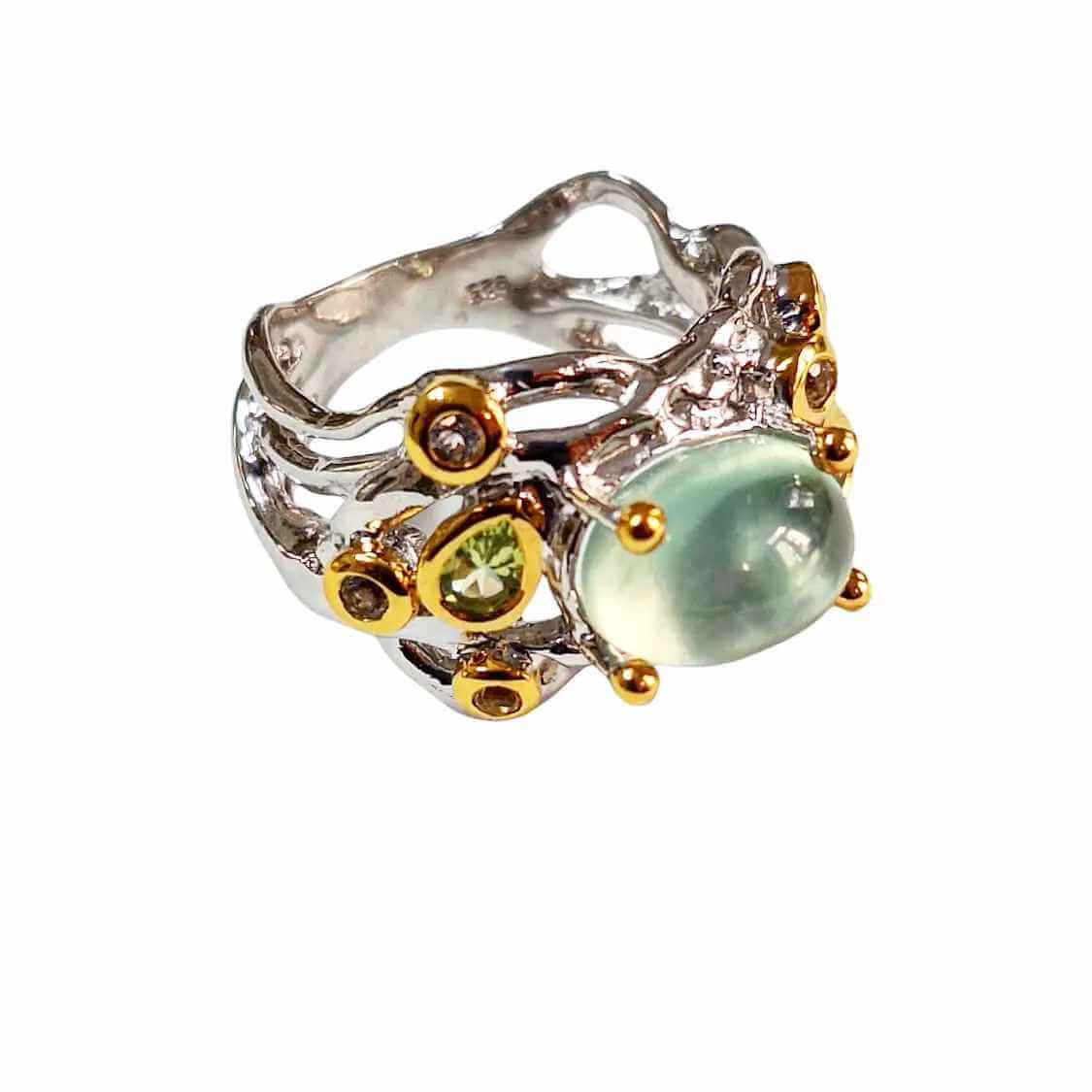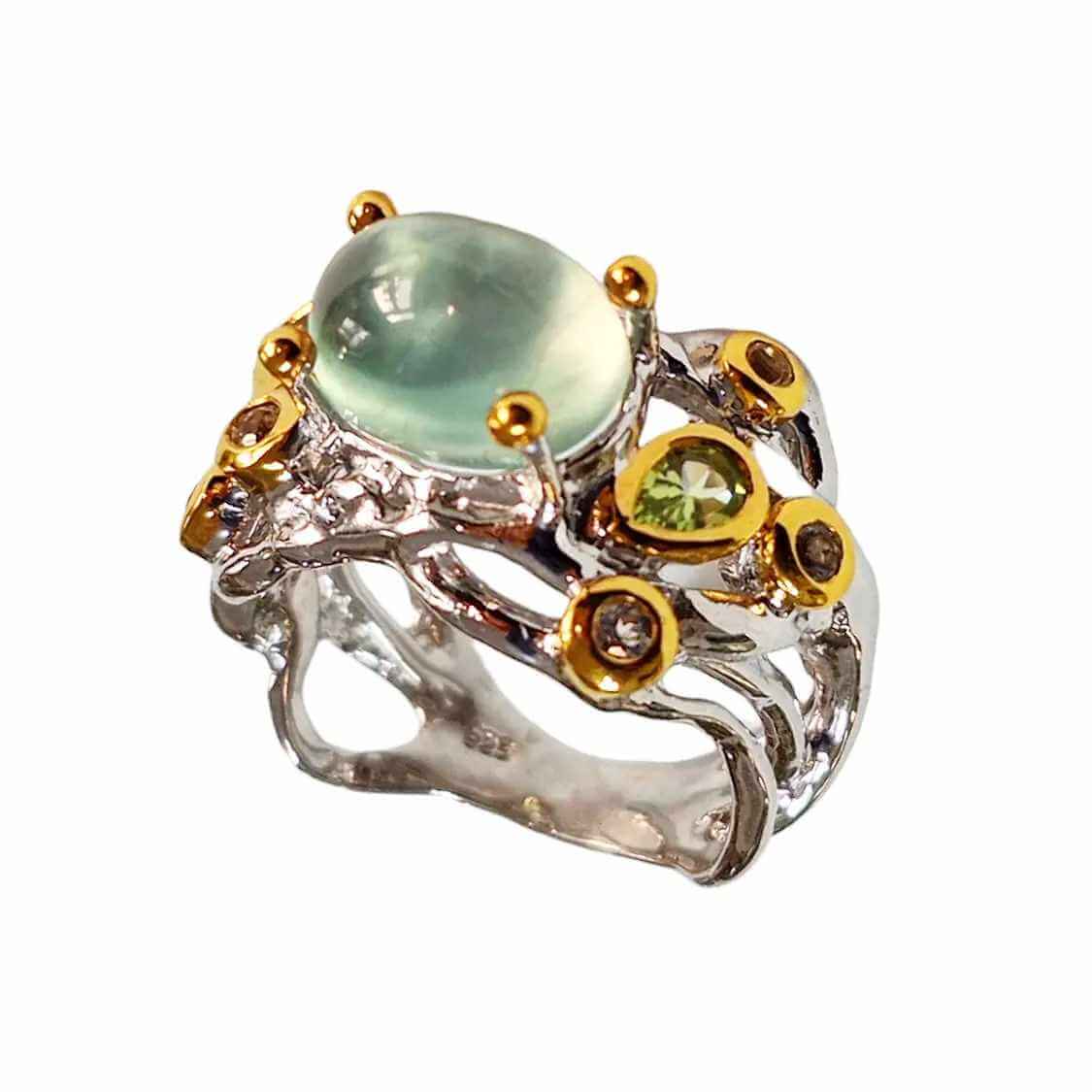 Experience the captivating blend of elegance and nature with our stunning silver ring, featuring a smooth cabochon cut prehnite alongside faceted peridots and white topazes. Crafted from natural gemstones and enhanced with white rhodium and 18k yellow gold plating, this piece exudes luxury and grace. Ideal for both daily wear and special occasions, let this exquisite ring highlight your natural beauty and refined style.