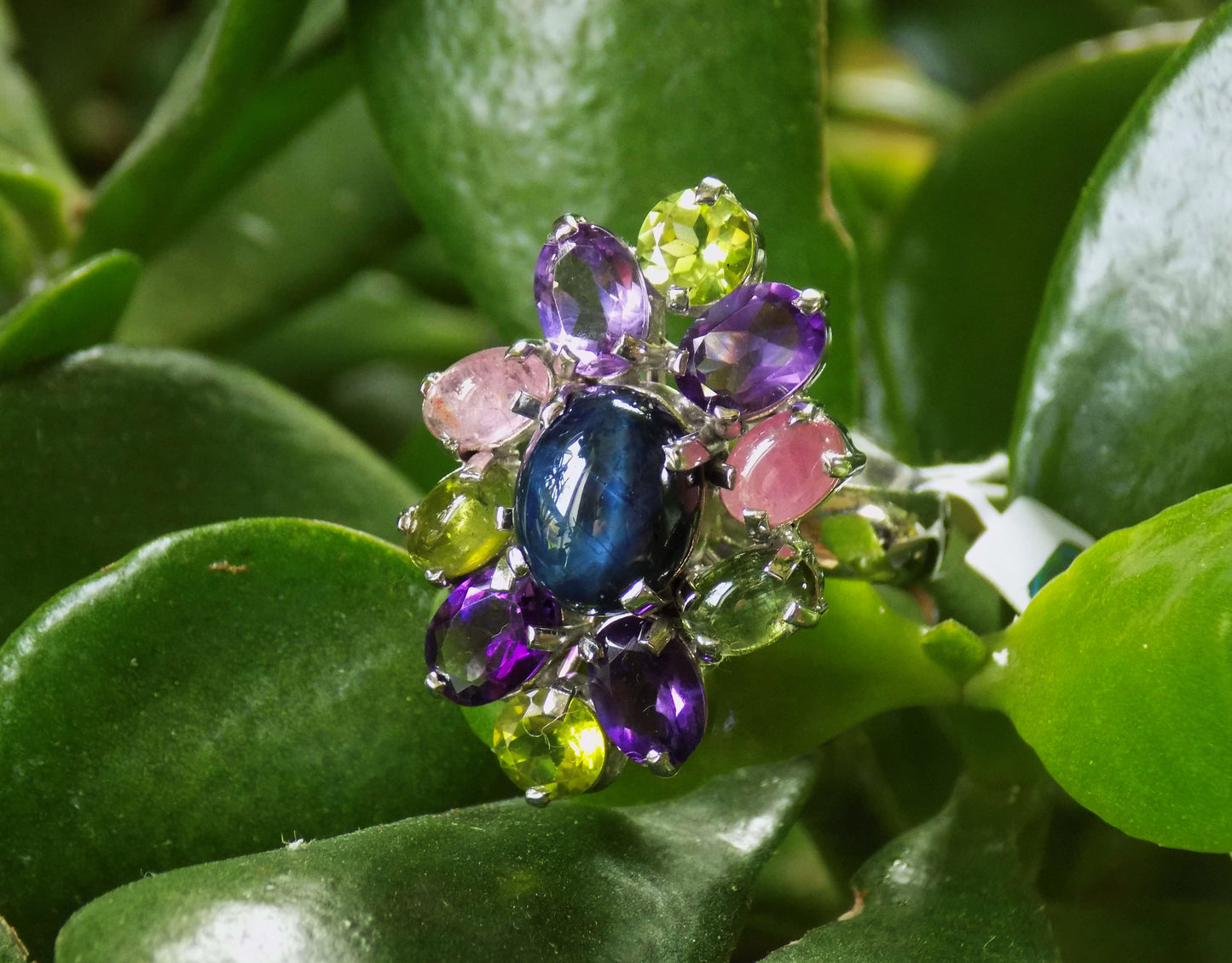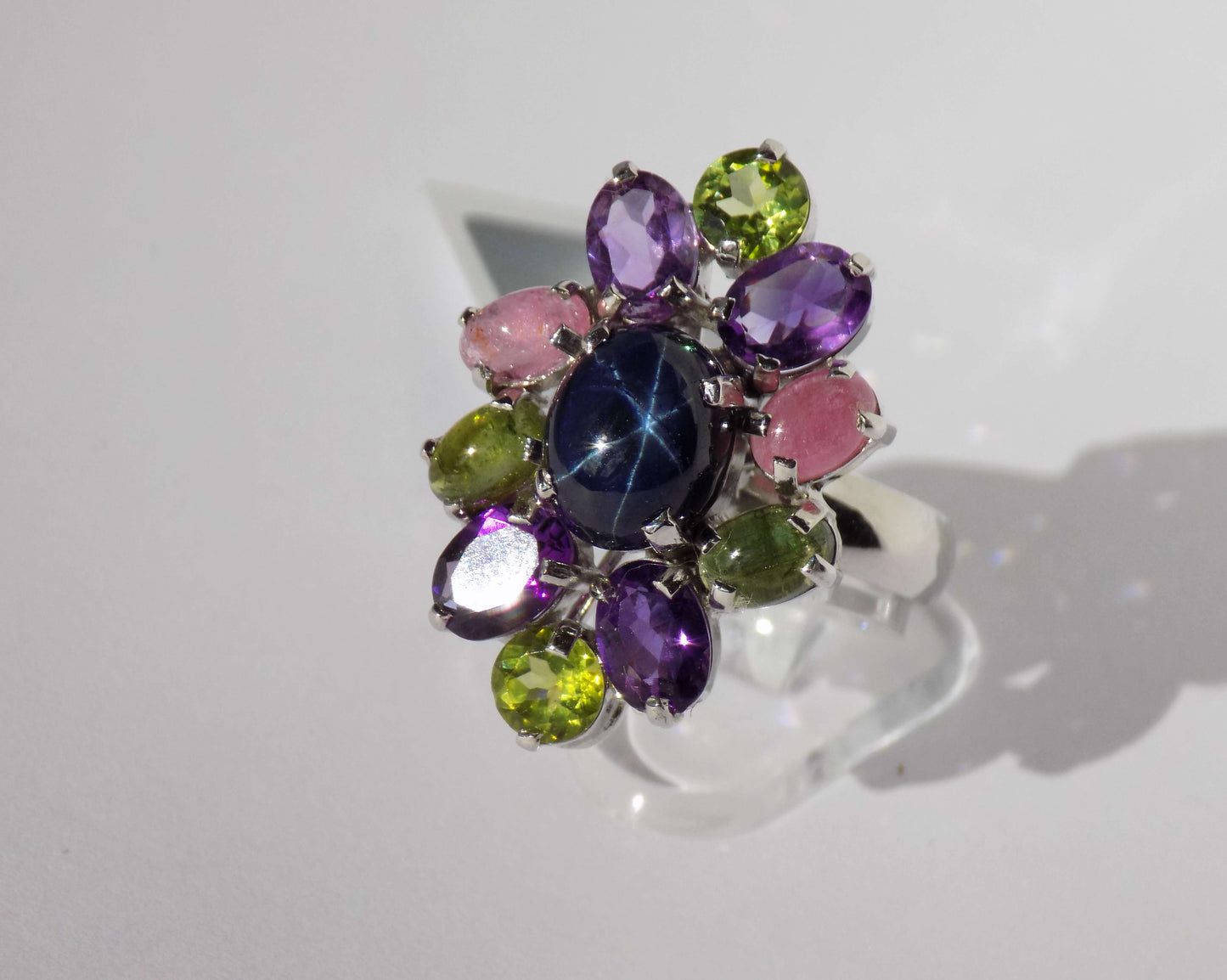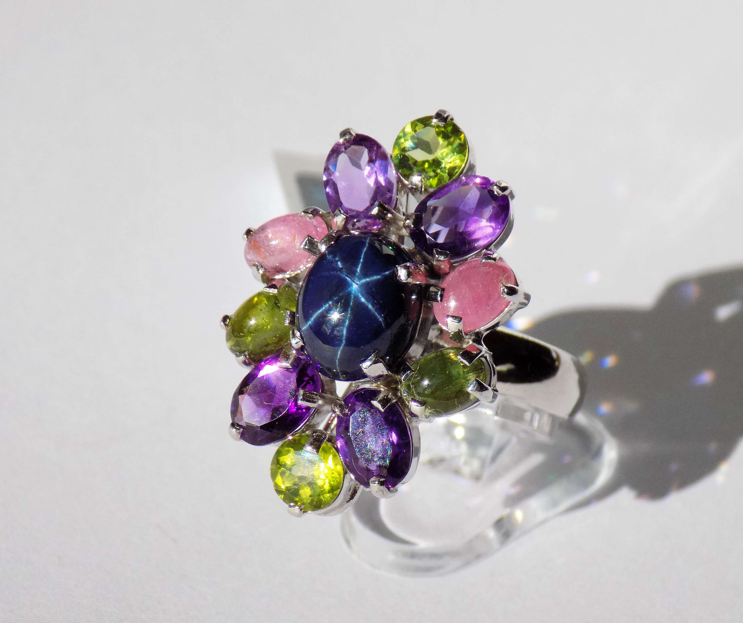 Silver Ring with Star Blue Sapphire, Amethysts, Tourmalines and Peridots
