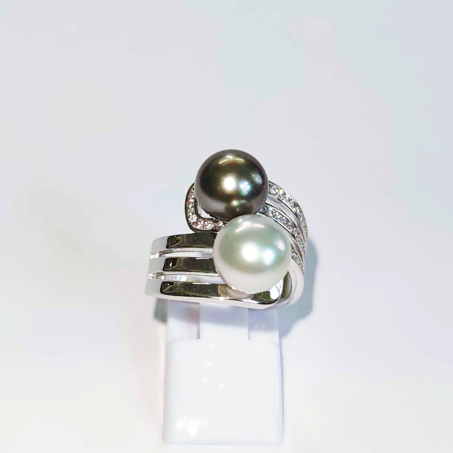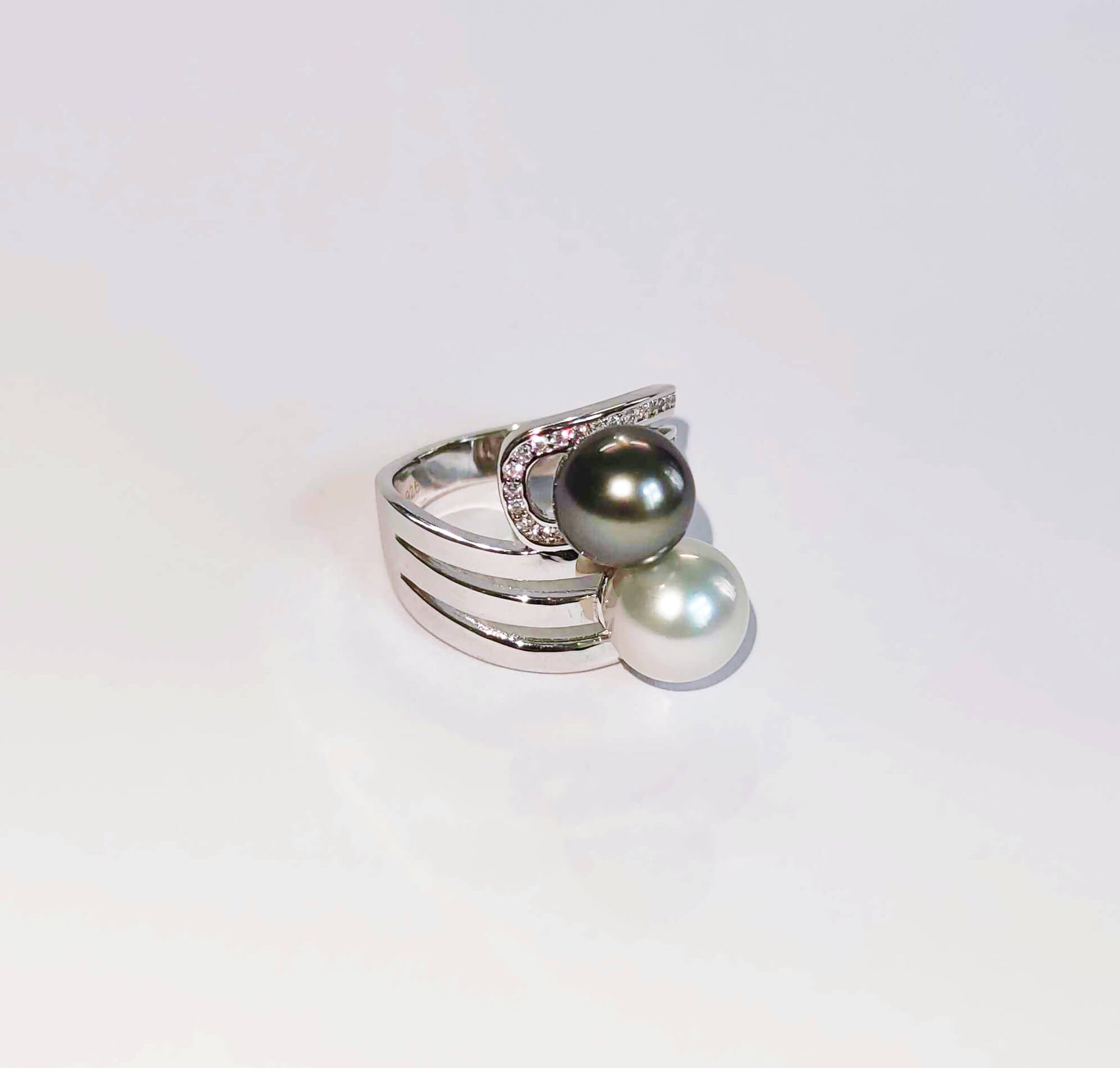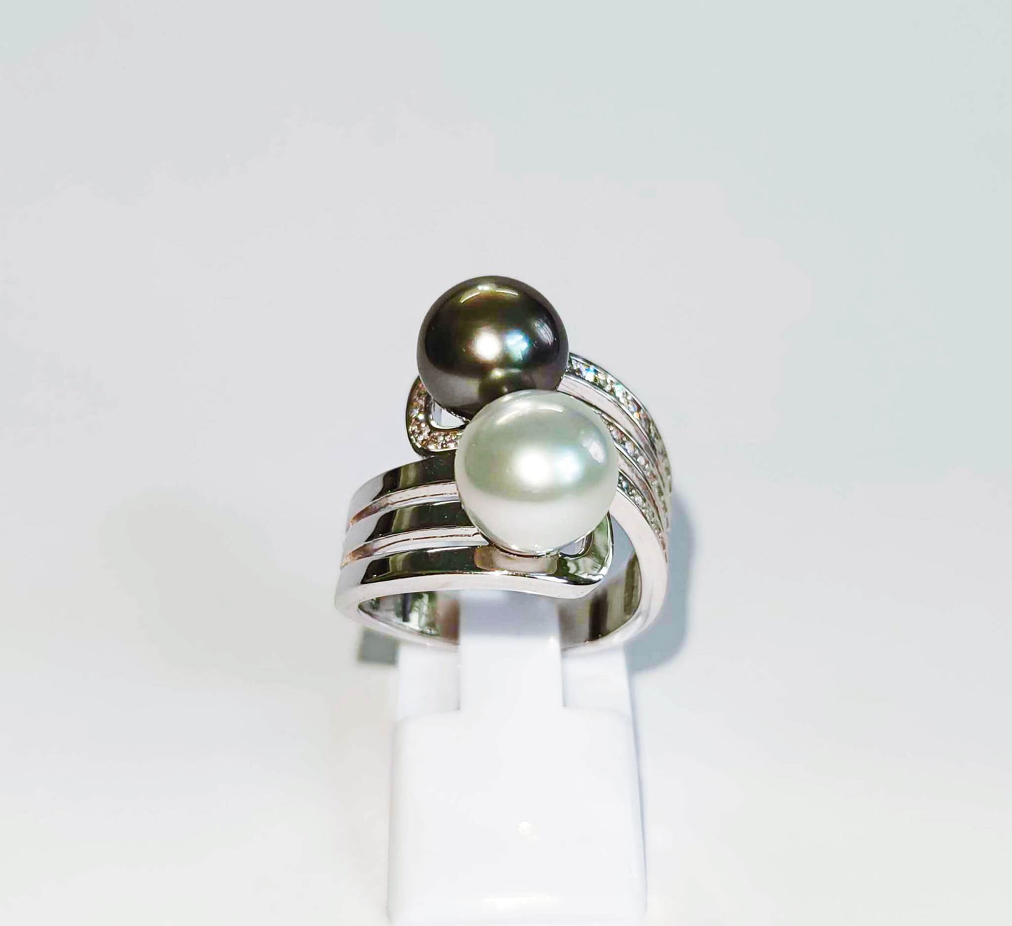 Silver Yin and Yang Ring with White and Black Sea Pearls and Zircons