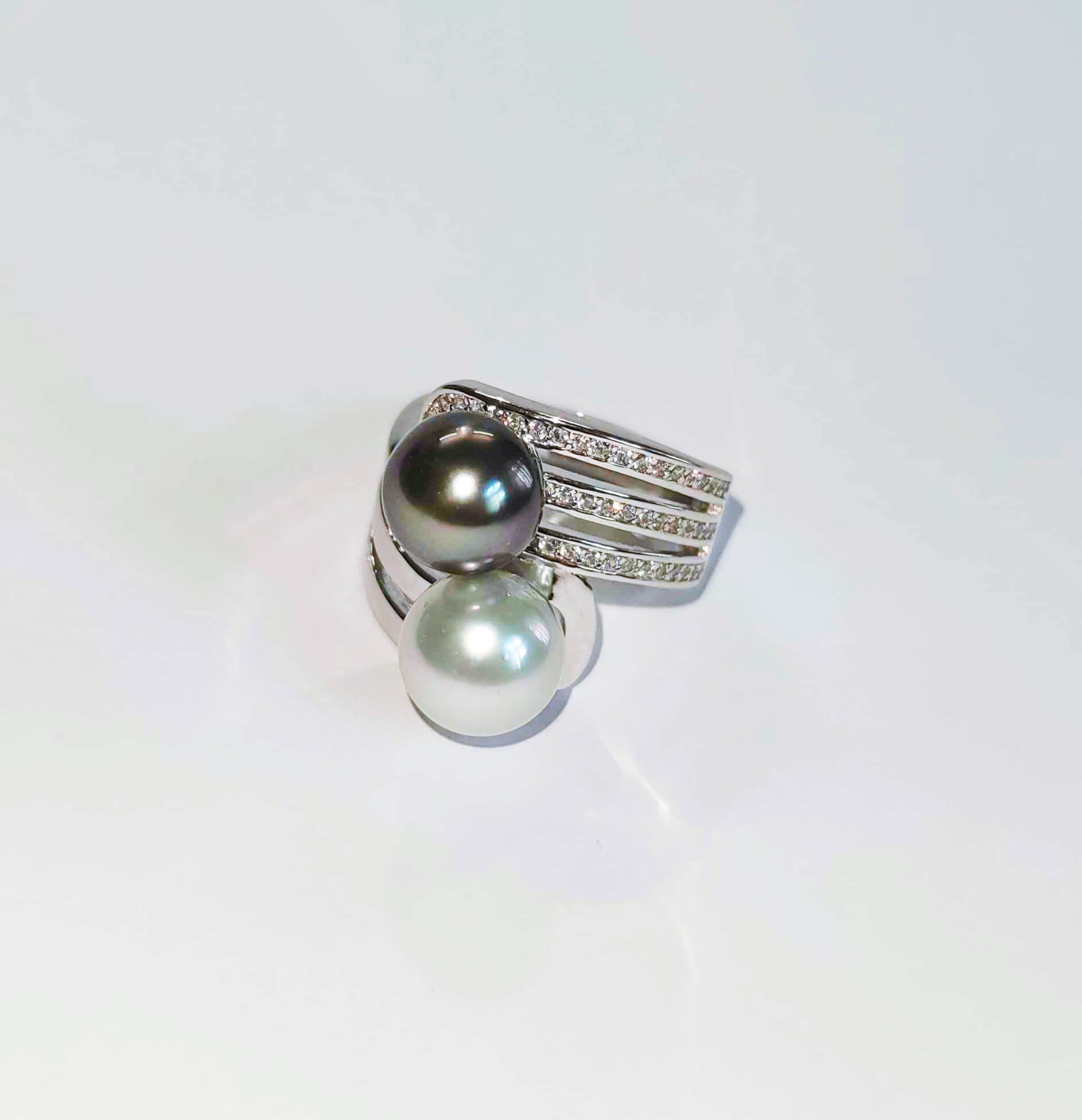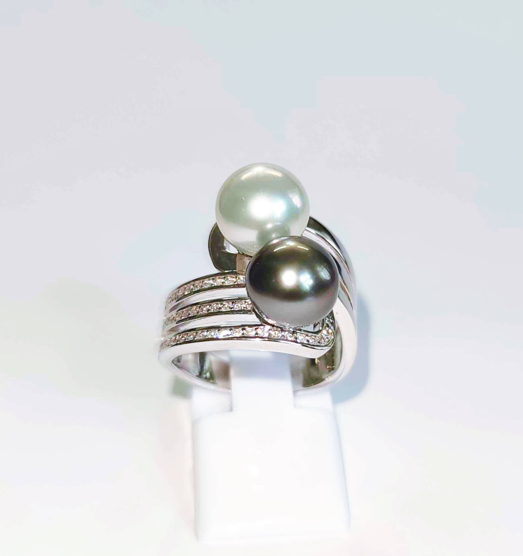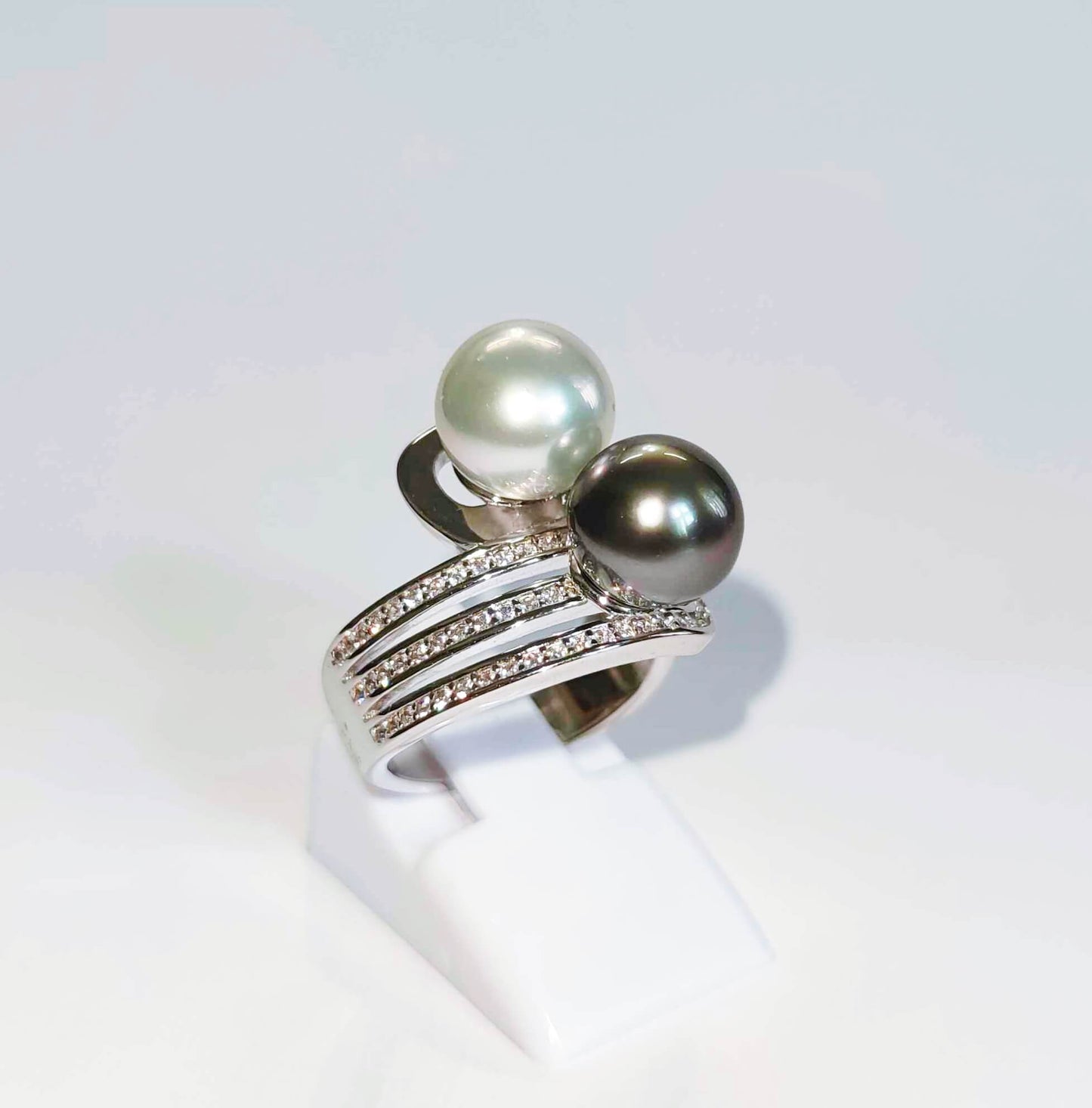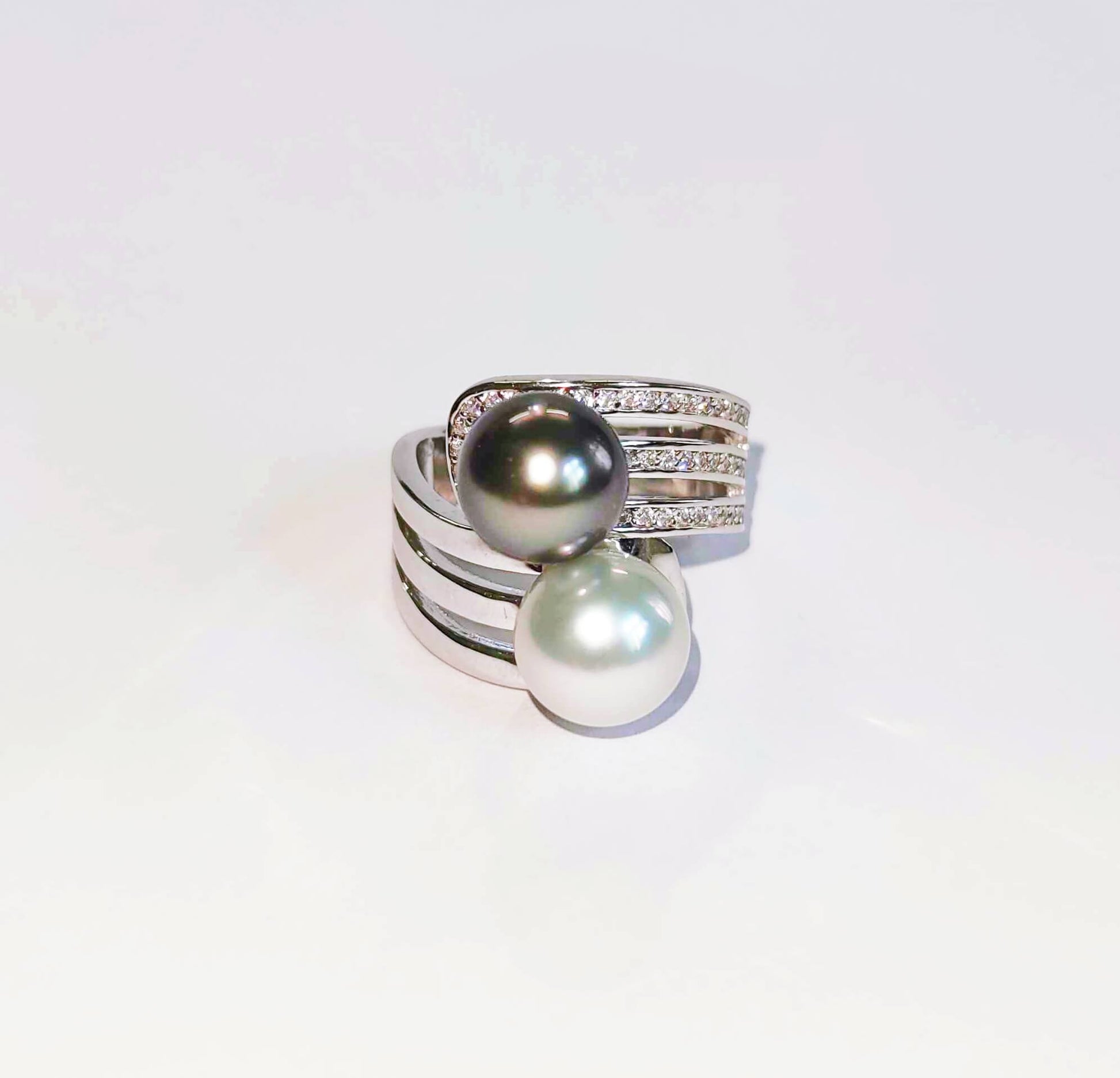 Silver Yin and Yang Ring with White and Black Sea Pearls and Zircons