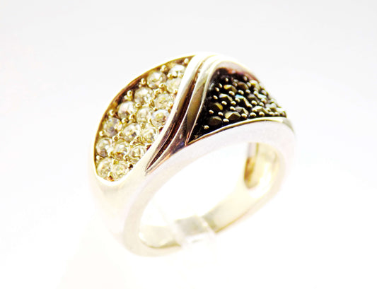 Silver Yin and Yang Ring with White and Black Sea Pearls and Zircons