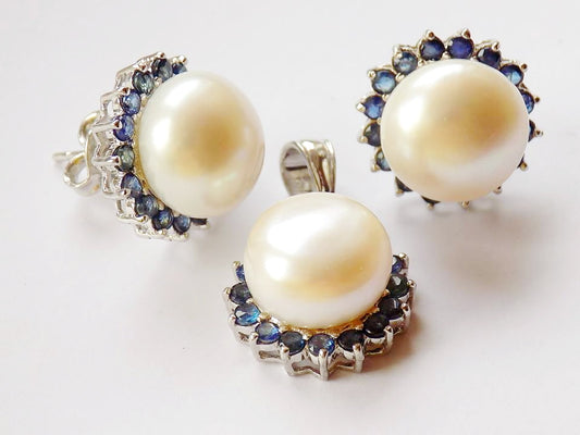 Серебряный кулон с белым пресноводным жемчугом и голубыми сапфирами