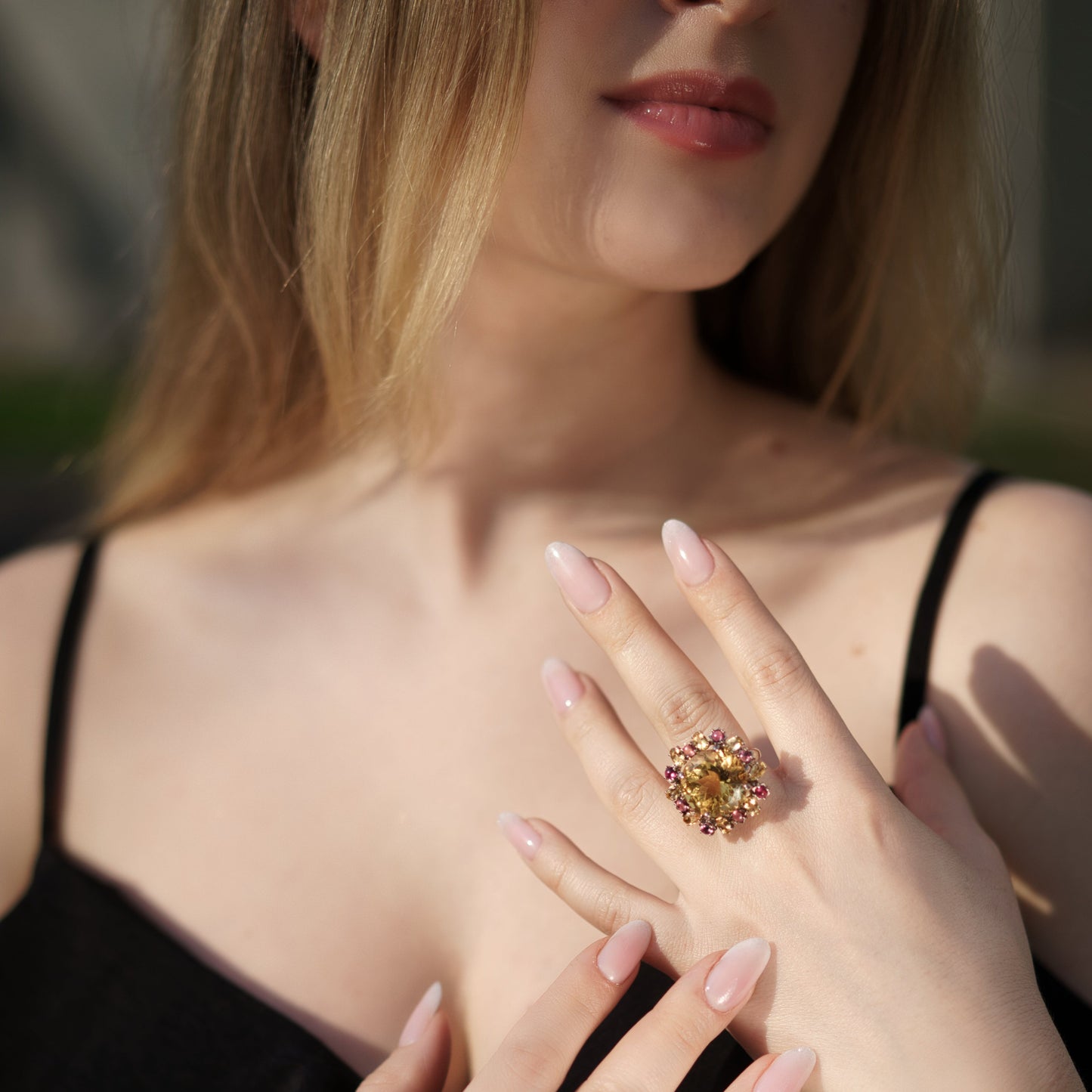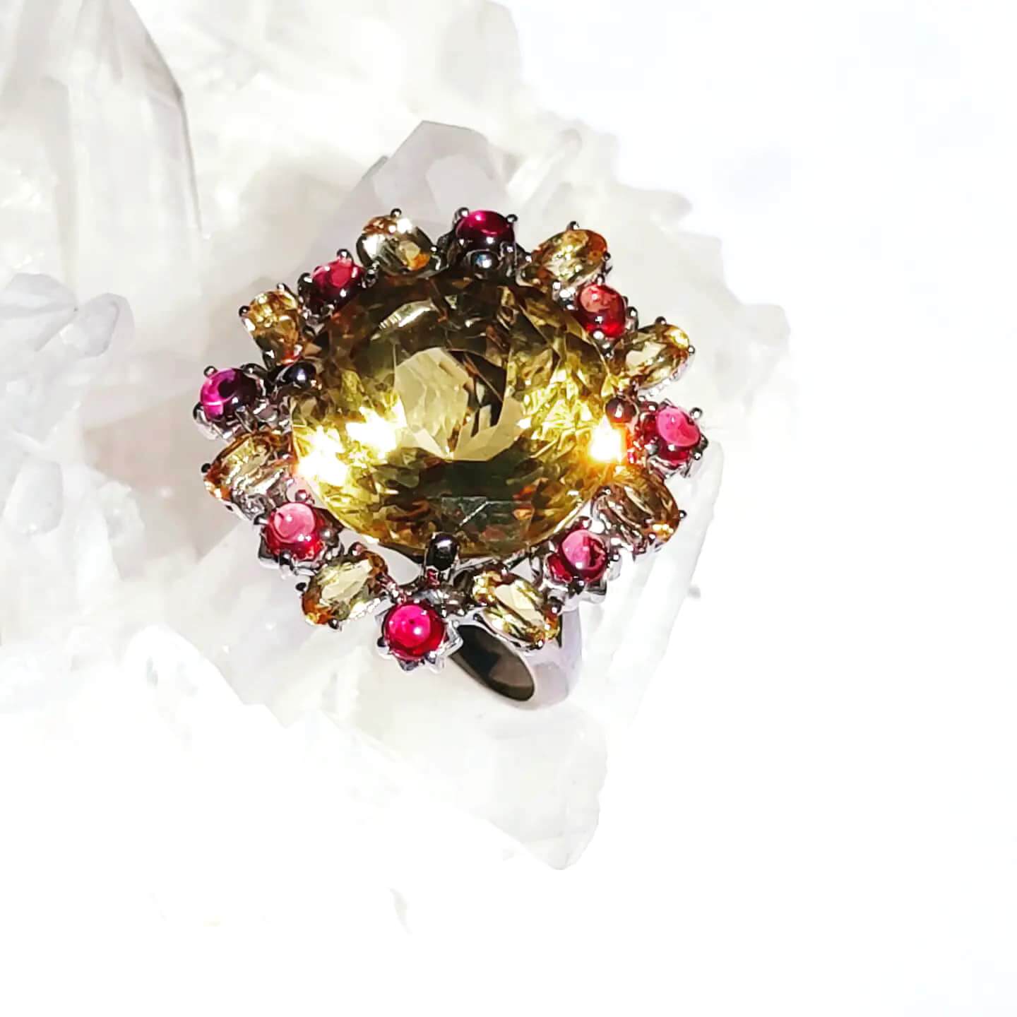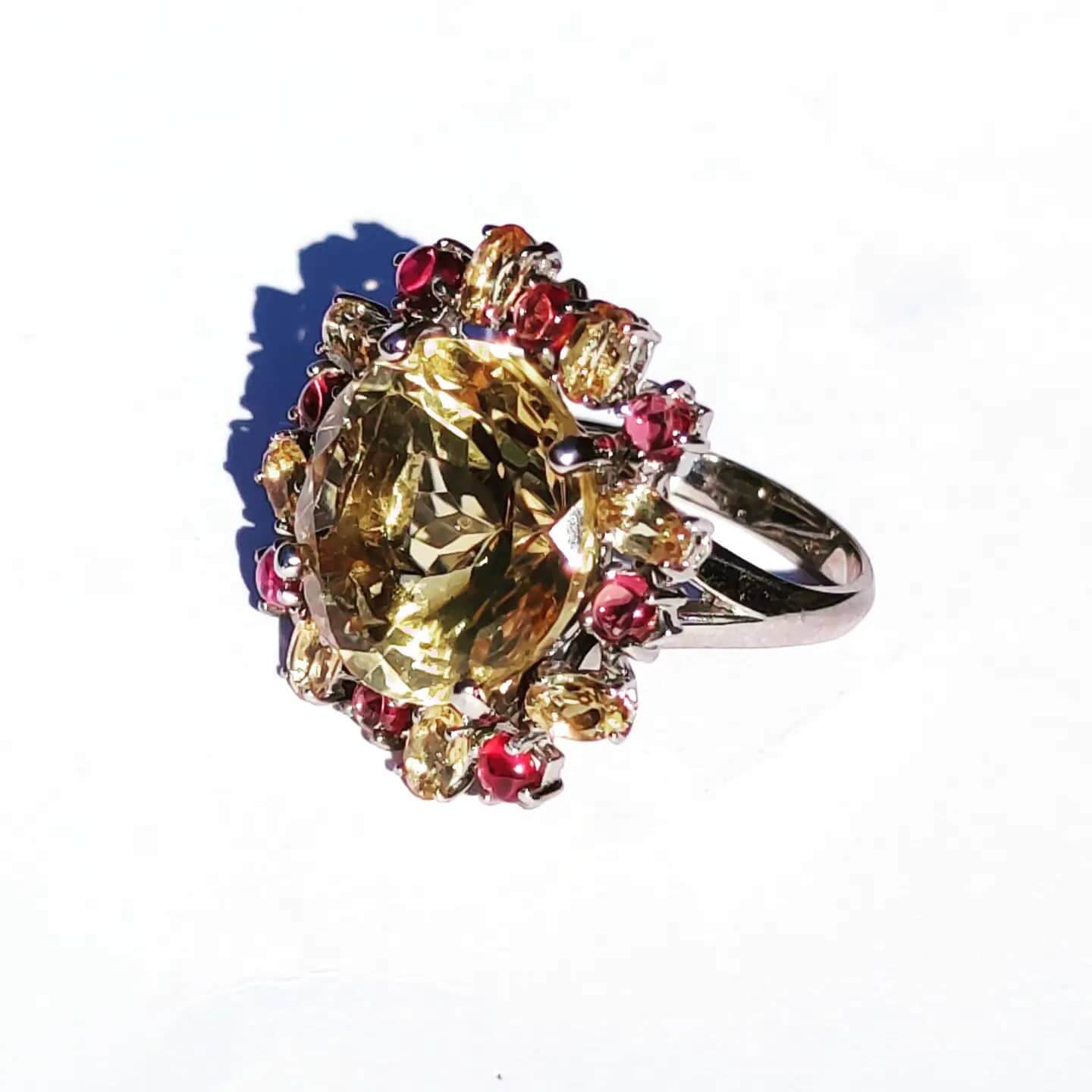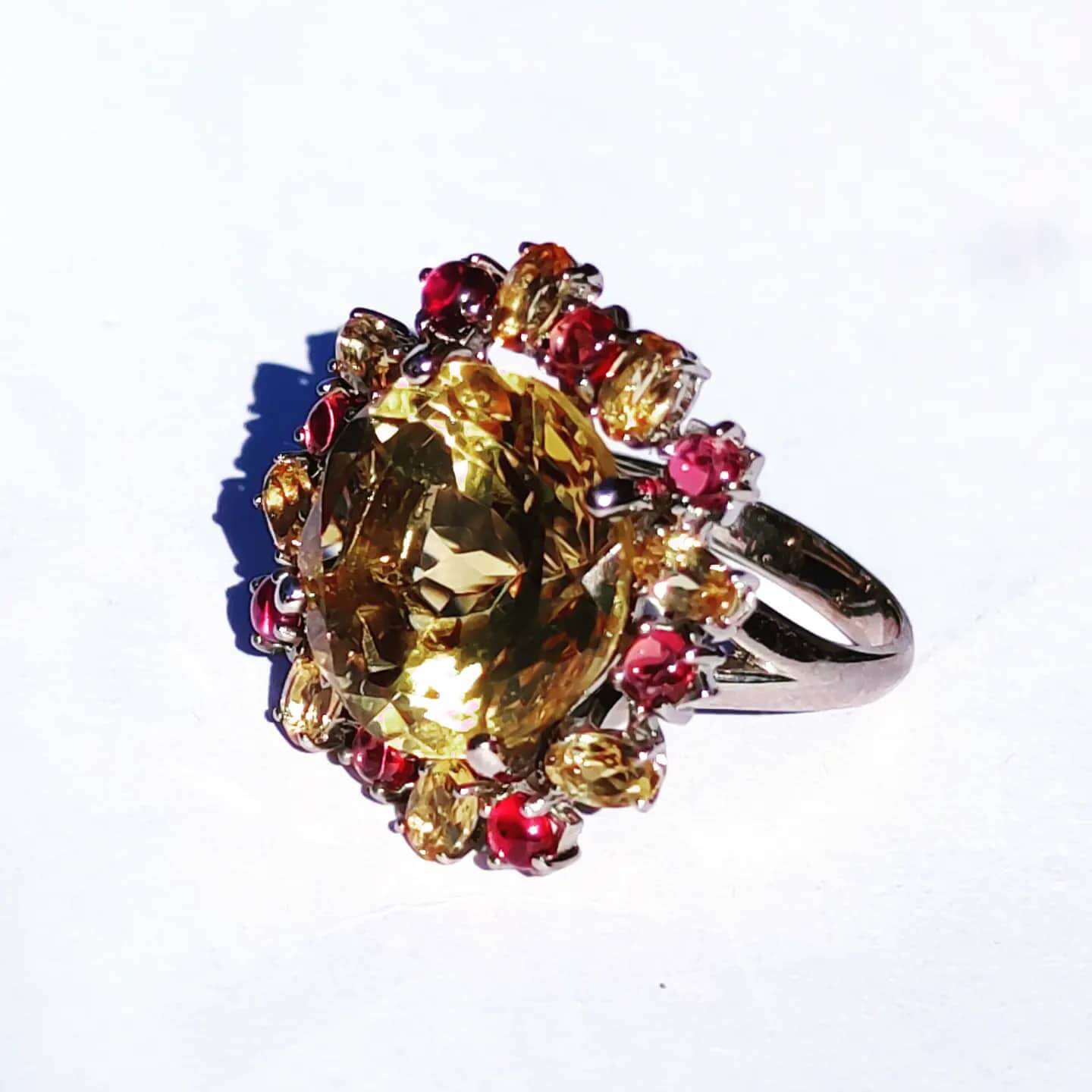 Натуральные драгоценные камни: Цитрины 14,45 карат - 1 шт. (1,67 см х 1,67 см), 8 шт. (0,3 см х 0,5 см) и рубины 1,9 карата - 8 шт. (0,3 см х 0,3 см).