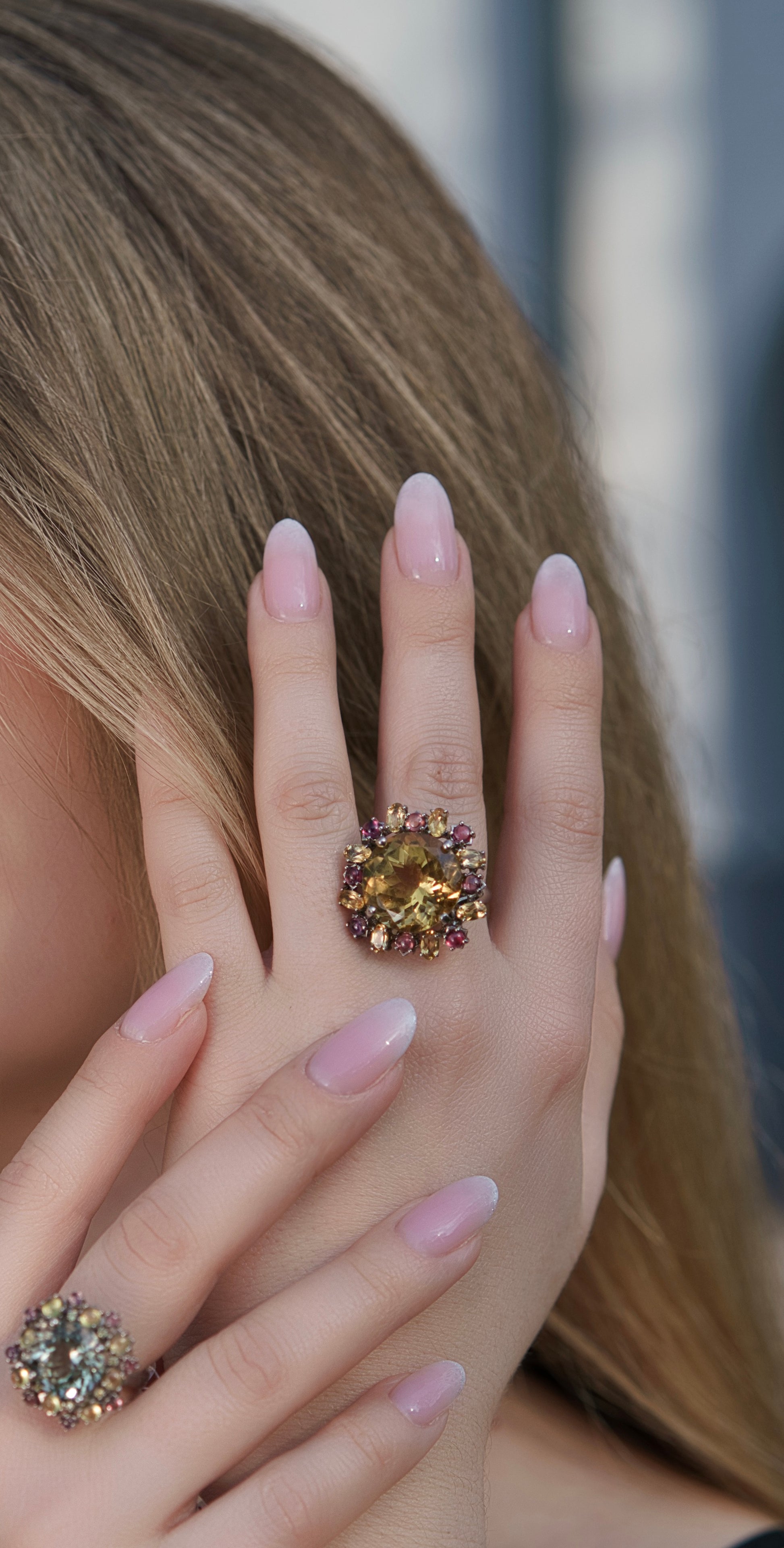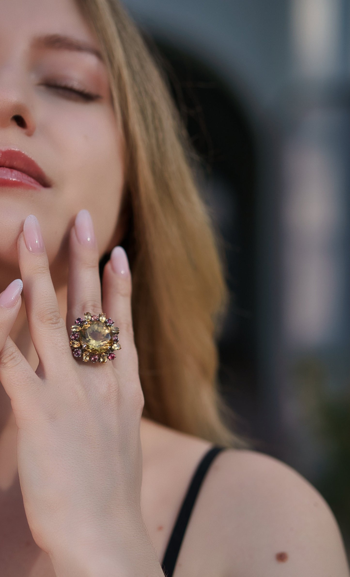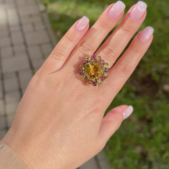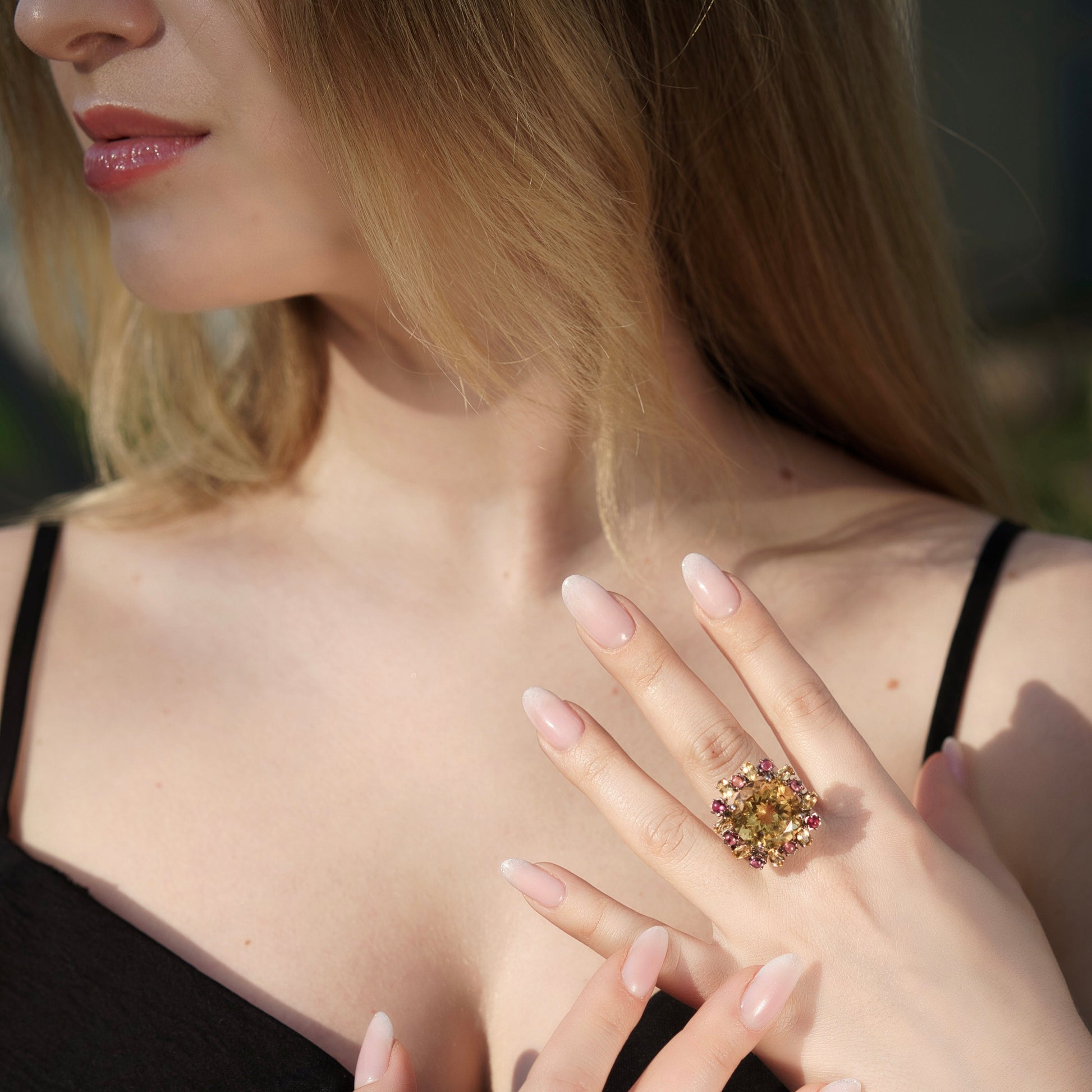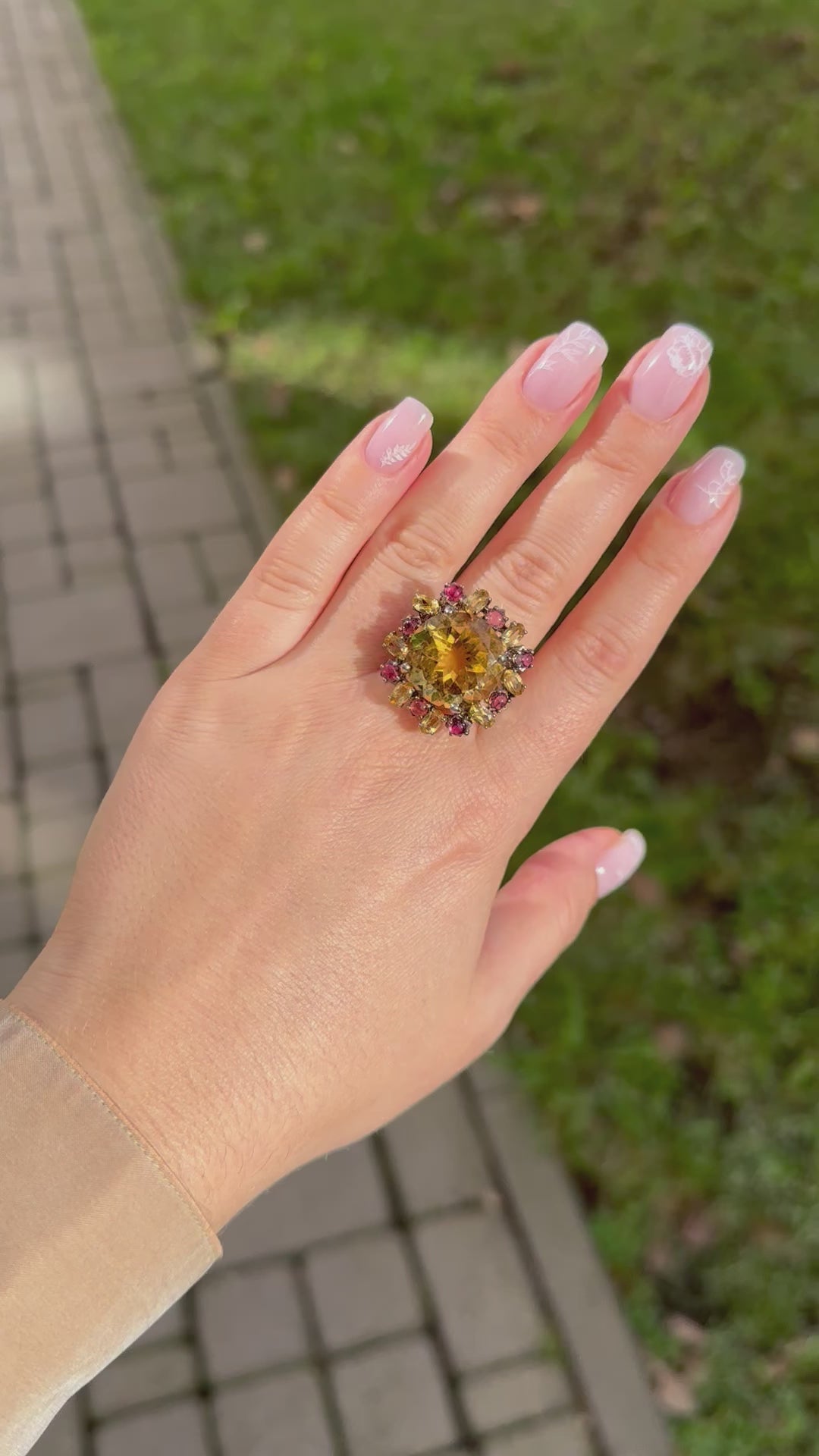 Натуральные драгоценные камни: Цитрины 14,45 карат - 1 шт. (1,67 см х 1,67 см), 8 шт. (0,3 см х 0,5 см) и рубины 1,9 карата - 8 шт. (0,3 см х 0,3 см).