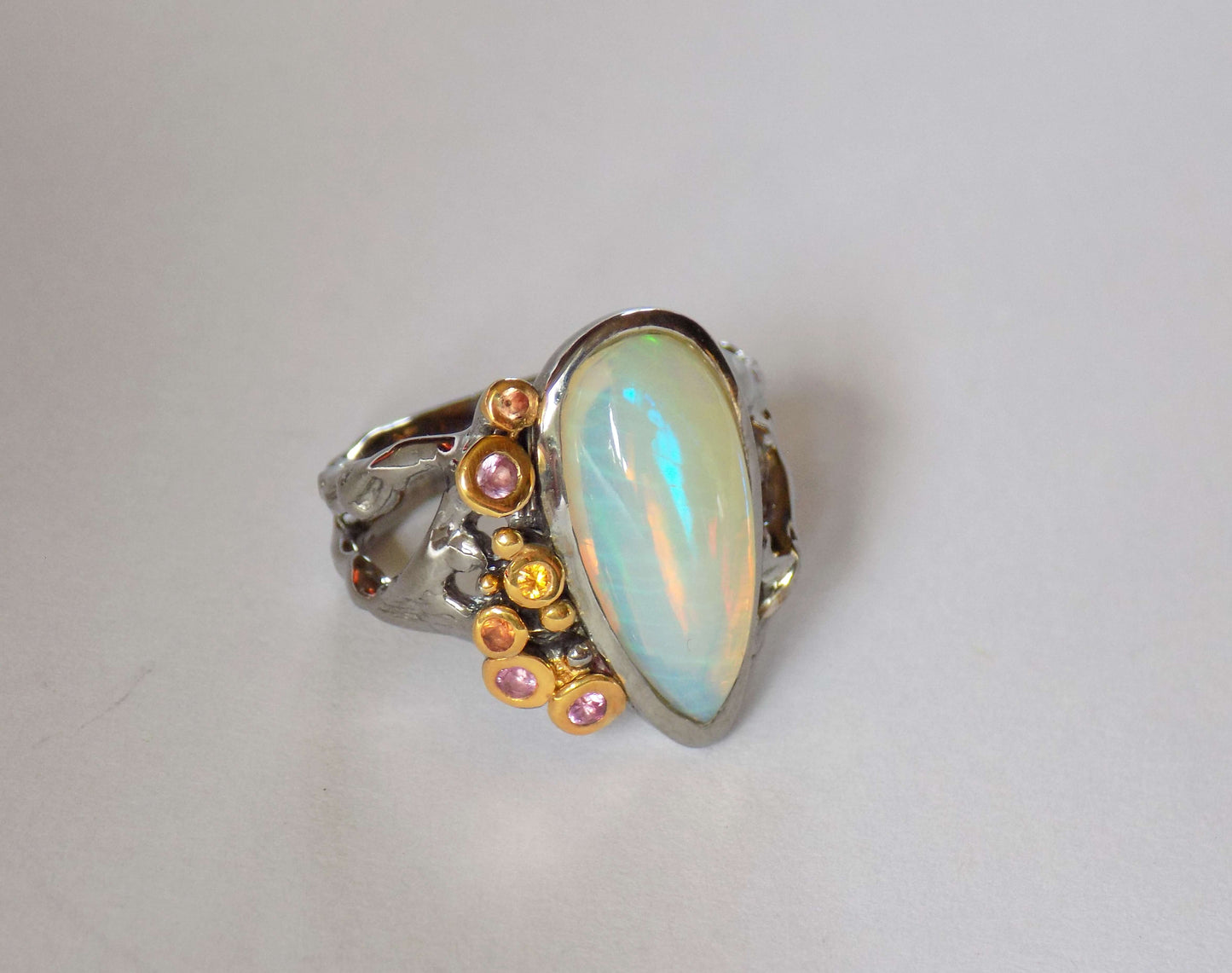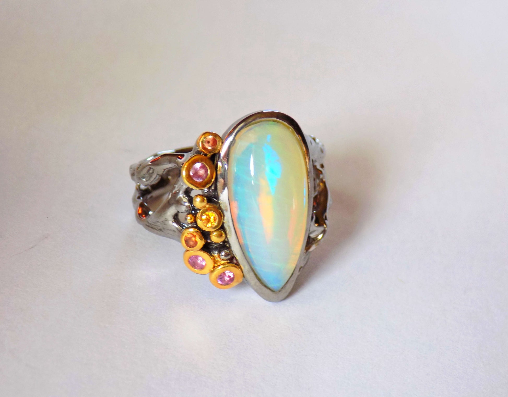Природные камни: Эфиопский Опал 1 шт. - 6.8 карат ~(0.8 см х 1.8 см) и оранжевые и розовые Сапфиры (гранёные) 6 шт. - 0.39 карат ~(0.14 см х 0.14 см - 0.22 см х 0.22 см).