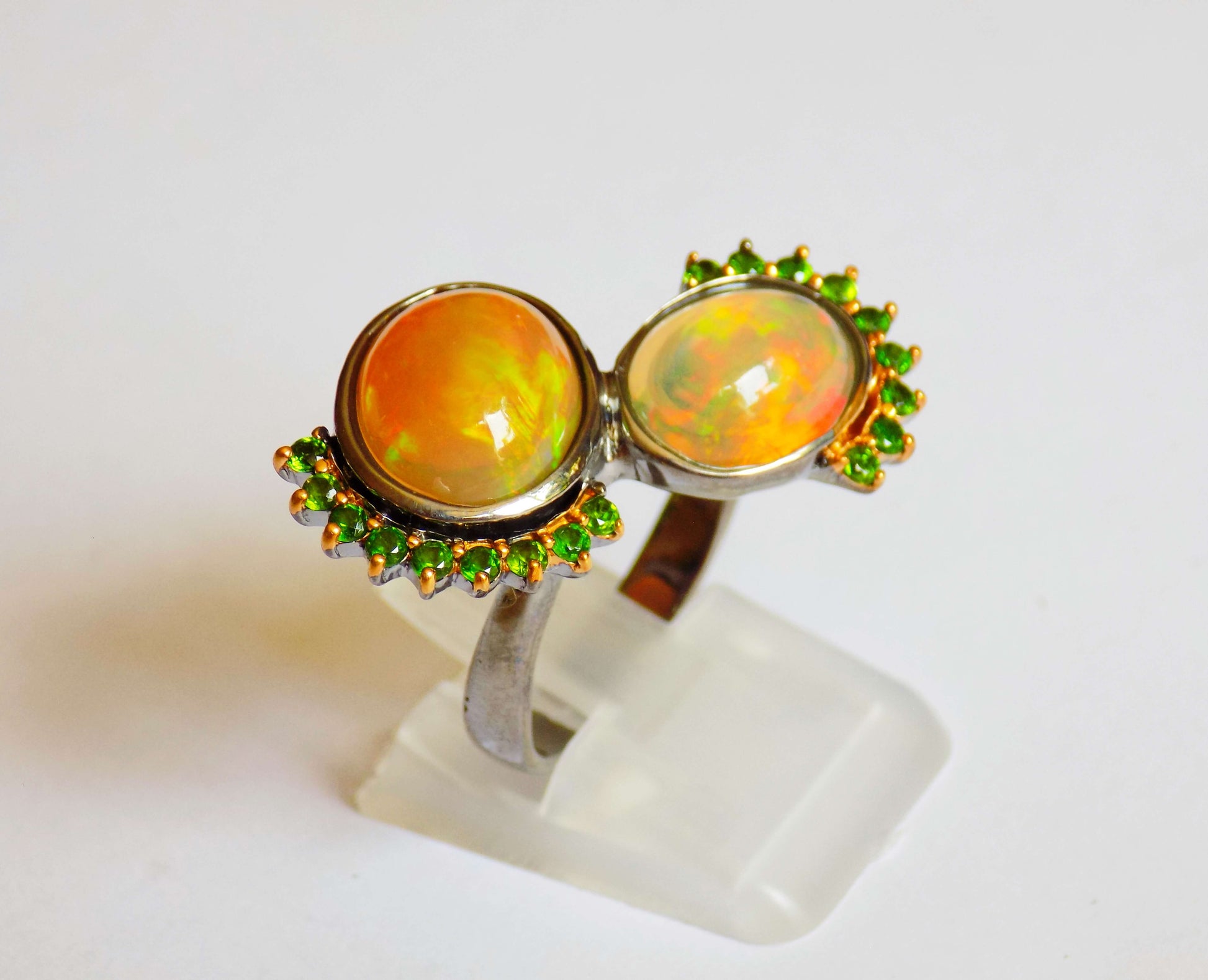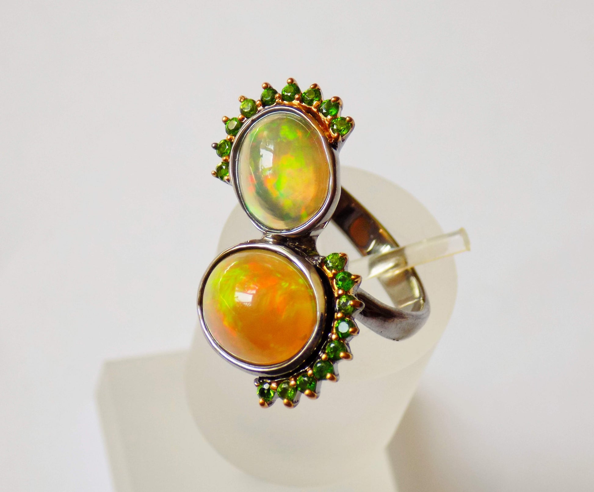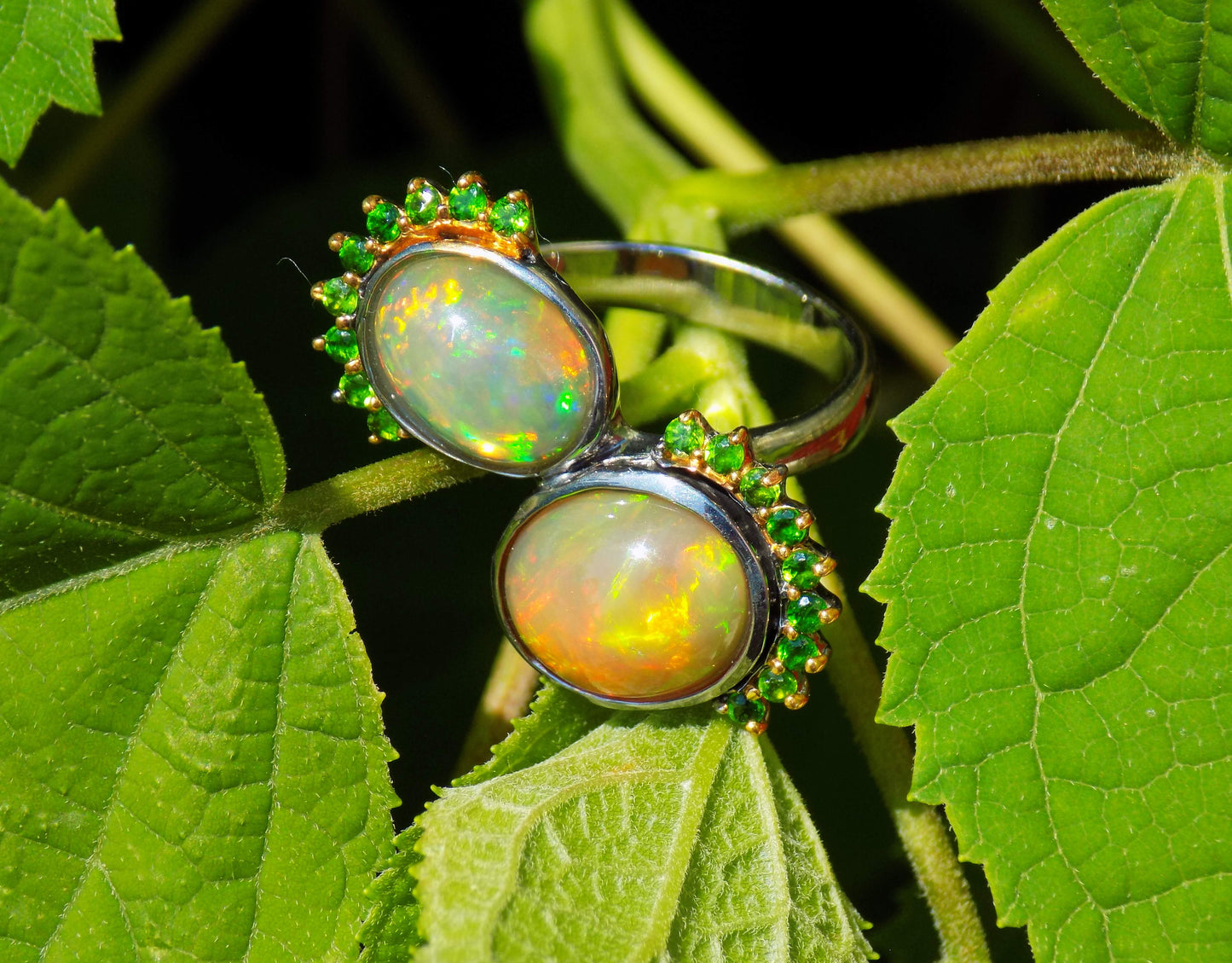 Натуральные драгоценные камни: Опалы (кабошоны) 2 шт. - 5,21 карат (0,95 см х 1,2 см), (0,85 см х 1,1 см) и хромдиопсиды (граненые) 18 шт. - 0,47 карата (0,15 см х 0,15 см).