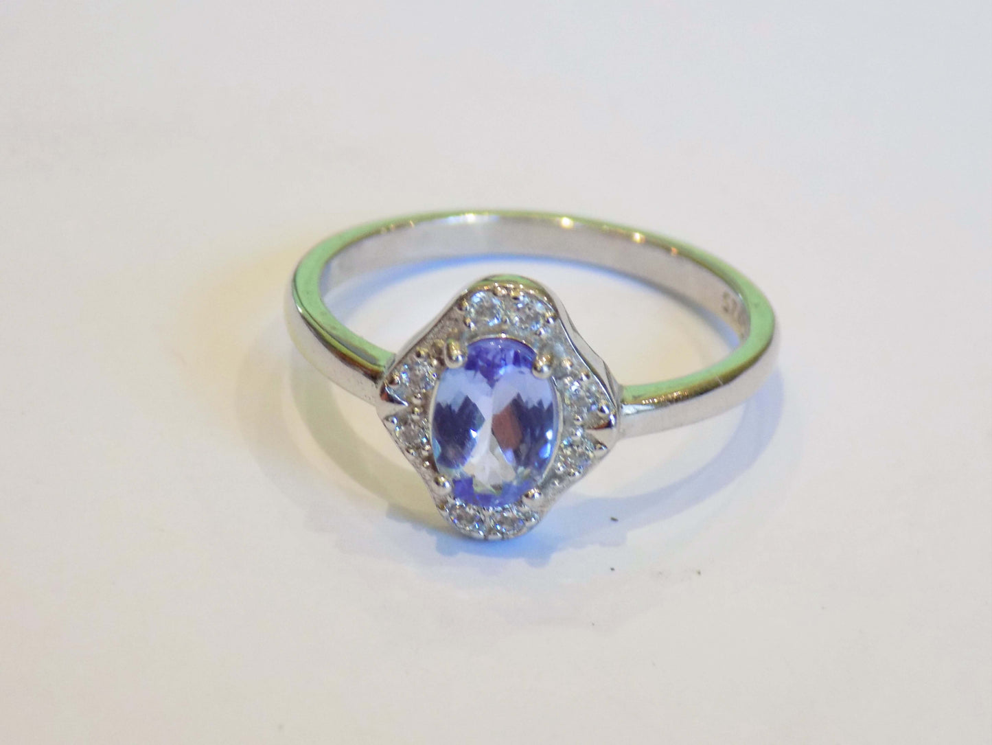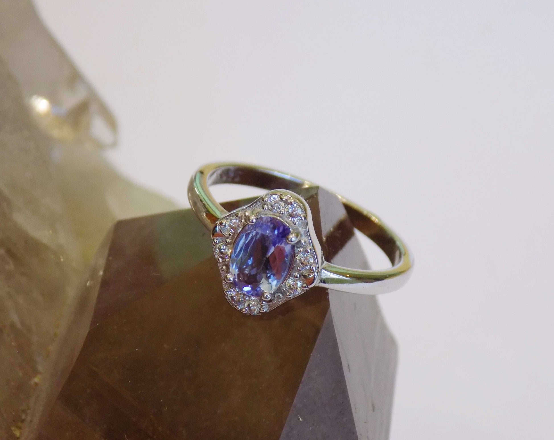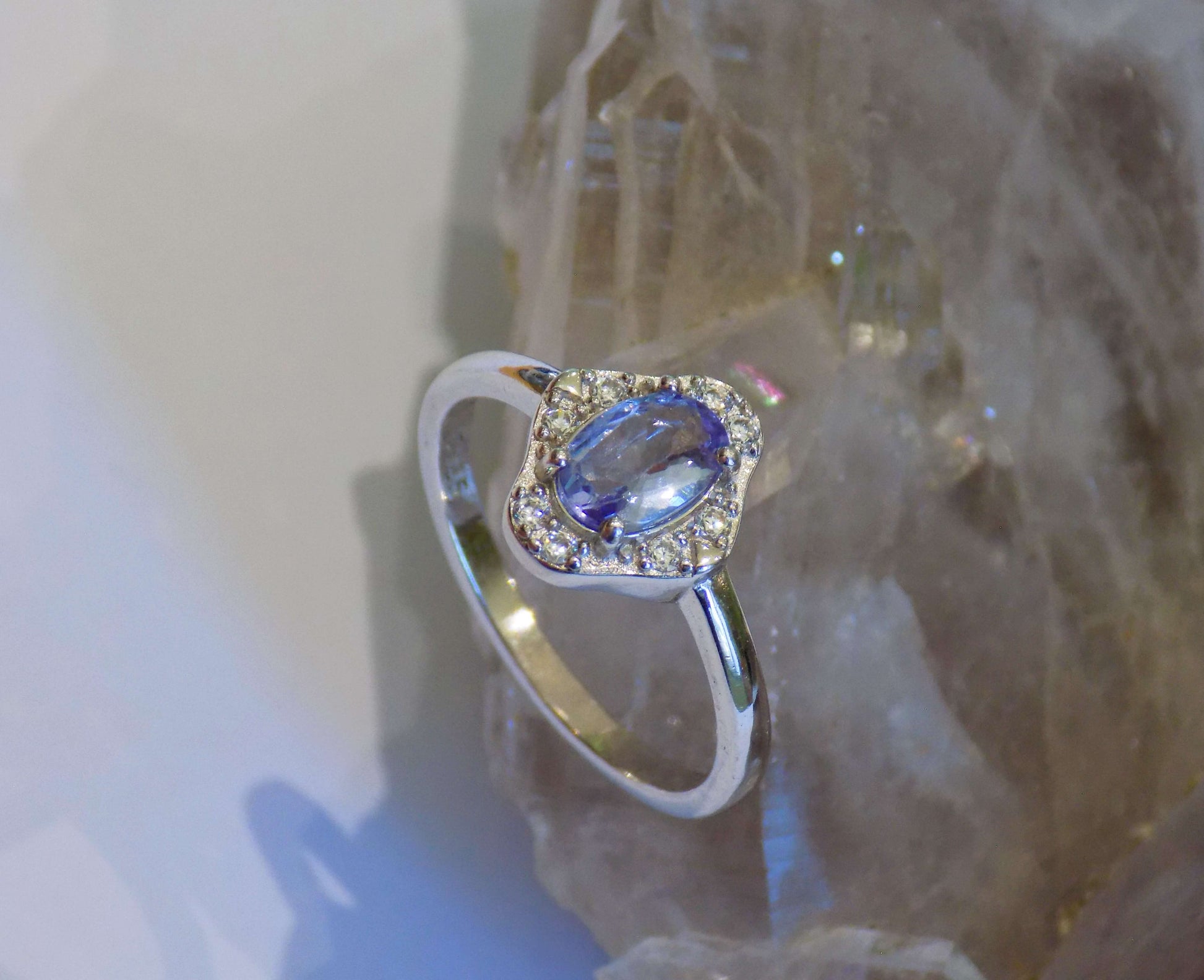Натуральные драгоценные камни: Танзанит 1 шт. (0,5 см х 0,7 см) и Цирконы 8 шт. (0,1 см х 0,1 см).